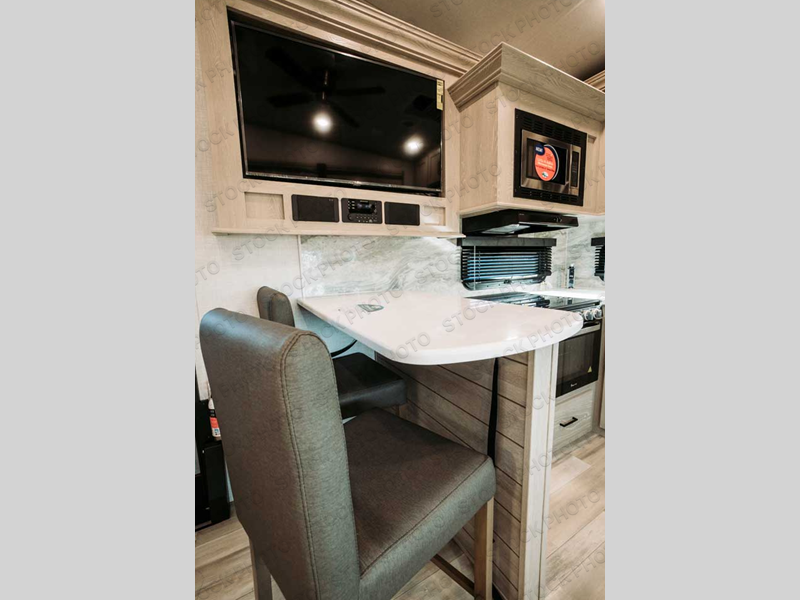 Looking for a spacious bedroom and bathroom for the perfect couple's RV with extra sleeping space for guests? This Ultra Lite provides a queen bed slide out for more interior floor space to get to the front wardrobe with shelves, and the dresser with a window above for great views of your campsite. The bathroom offers a shower with a seat, linen storage, and counter space for your toiletries. The main living and kitchen combined area has a hide-a-bed sofa slide that allows two guests to stay the night, plus a breakfast bar with stools to dine at, and a U-shaped counter including appliances to make meals and store leftovers. And you will find storage along the exterior to bring along camping chairs and extra gear.