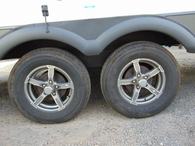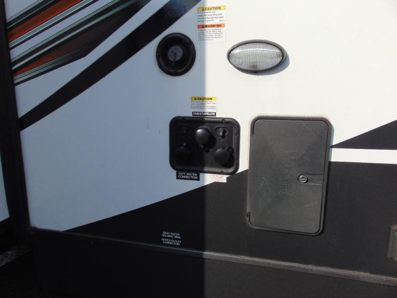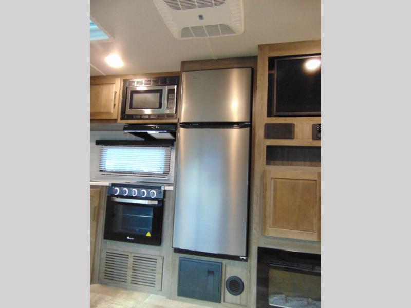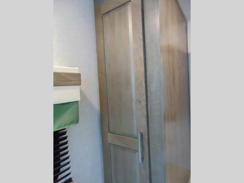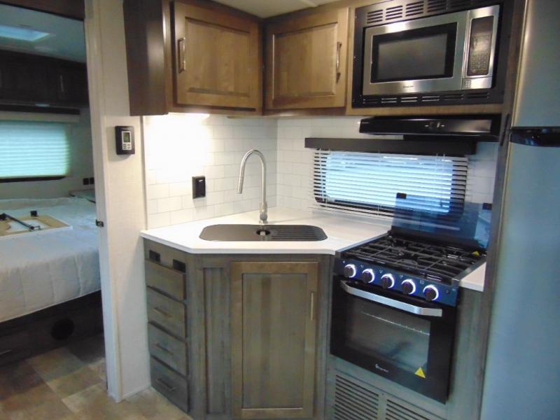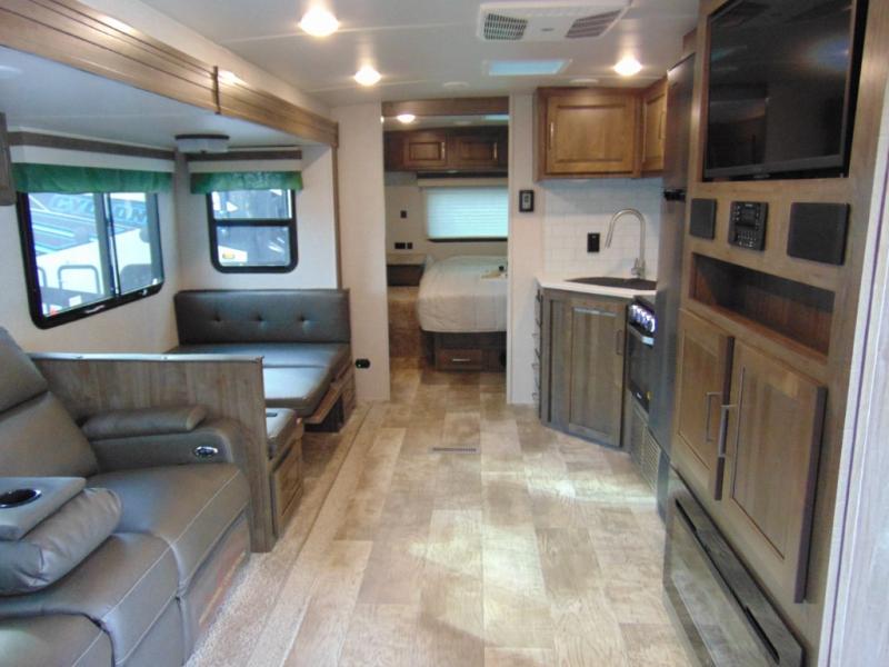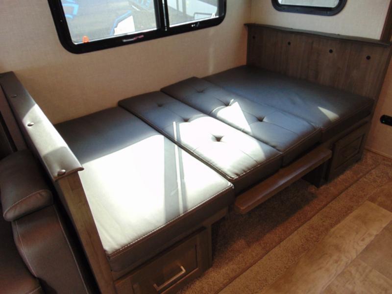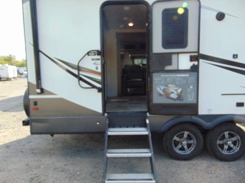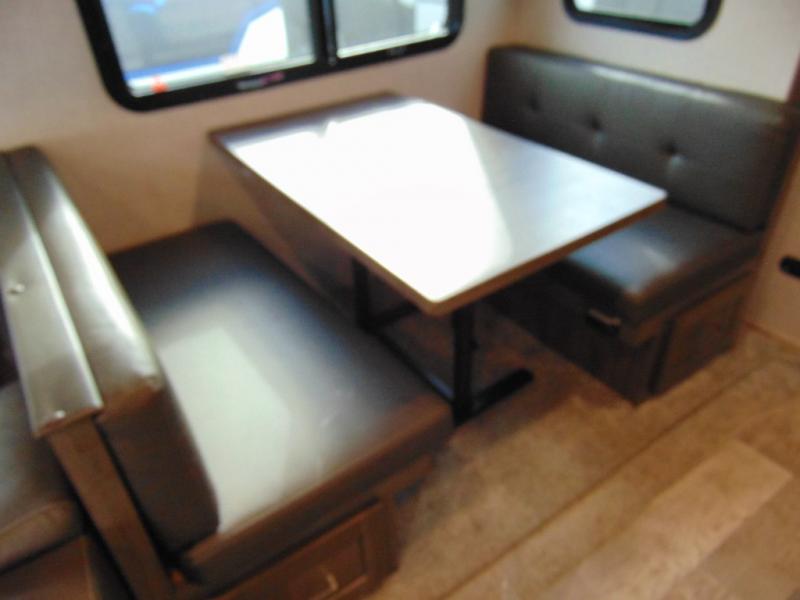 This trailer is the perfect couple's retreat with its private bedroom up front which includes a queen bed, a slide out wardrobe and a TV option. The spacious rear full bathroom provides a shower and linen storage, and a space savings sliding door. The cook will have full amenities including a counter extension for more prep space, and a pantry below the LED TV and entertainment center. The booth dinette offers inside dining as well as sleeping space, and the theater seating is a great place to relax.