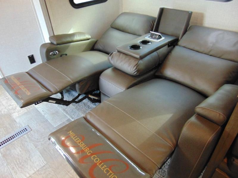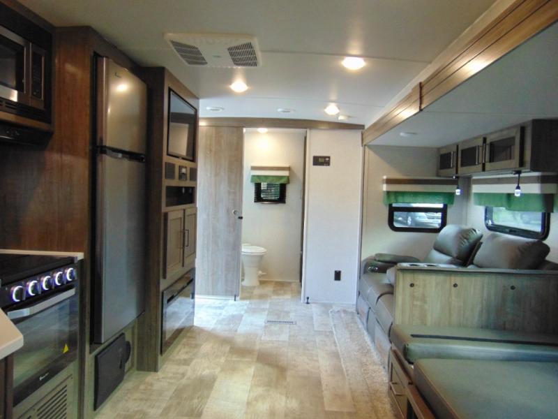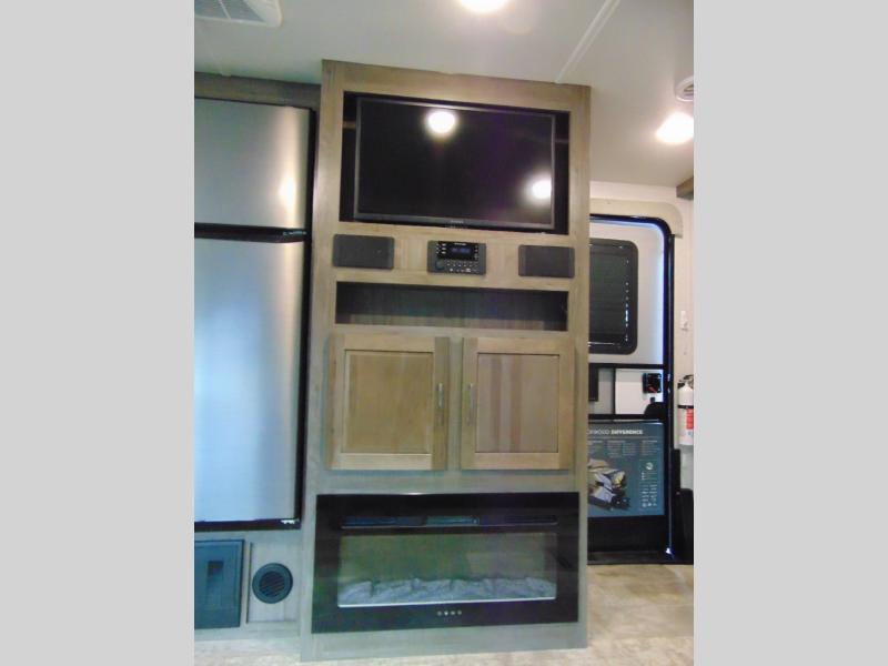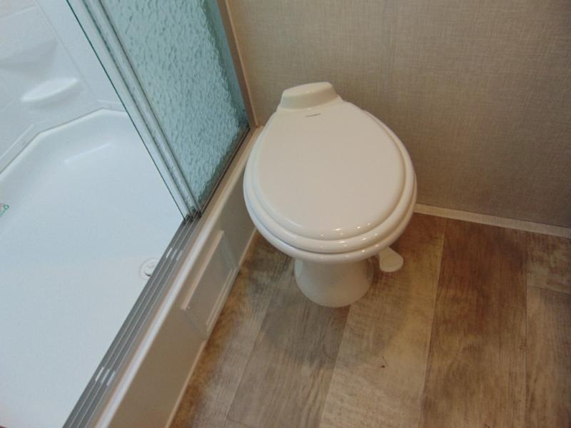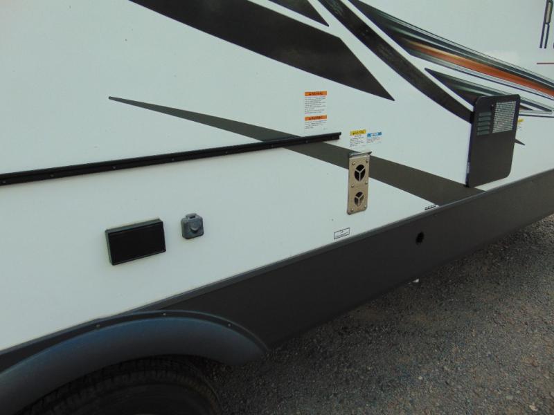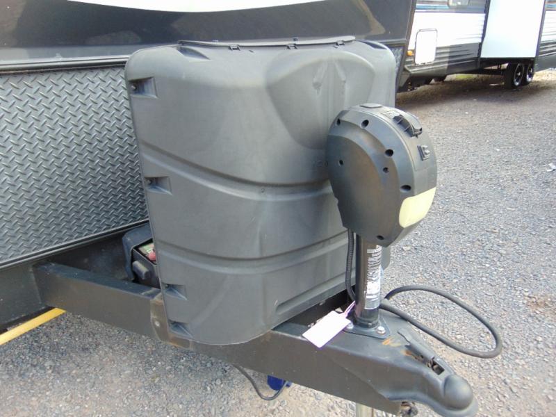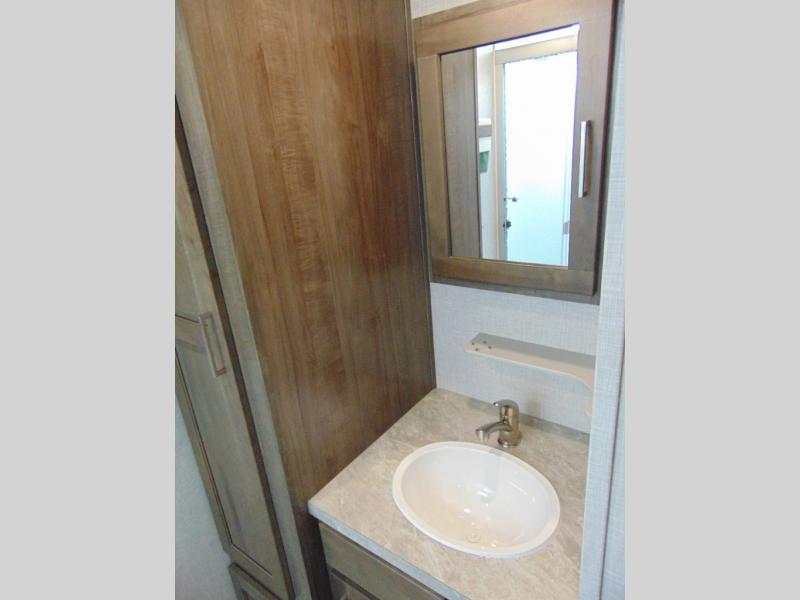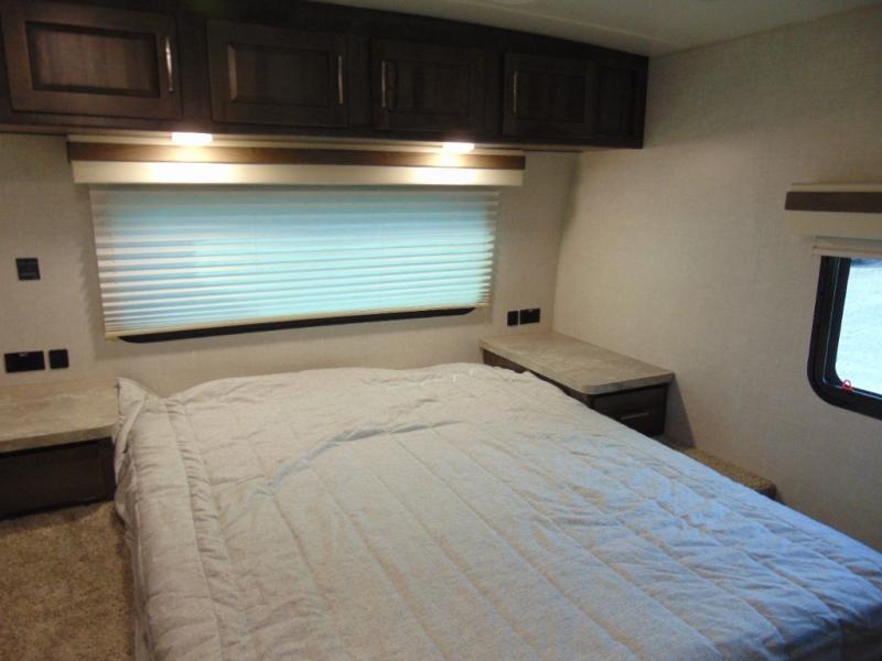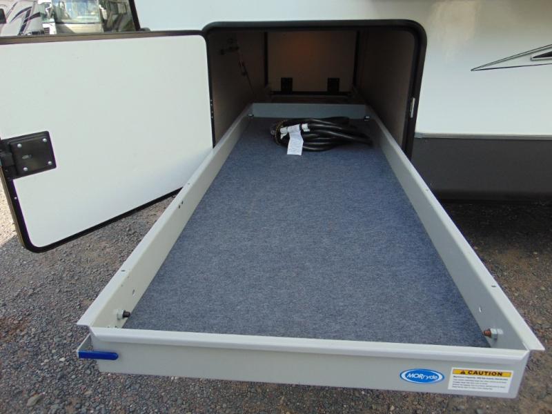 This trailer is the perfect couple's retreat with its private bedroom up front which includes a queen bed, a slide out wardrobe and a TV option. The spacious rear full bathroom provides a shower and linen storage, and a space savings sliding door. The cook will have full amenities including a counter extension for more prep space, and a pantry below the LED TV and entertainment center. The booth dinette offers inside dining as well as sleeping space, and the theater seating is a great place to relax.