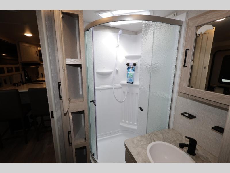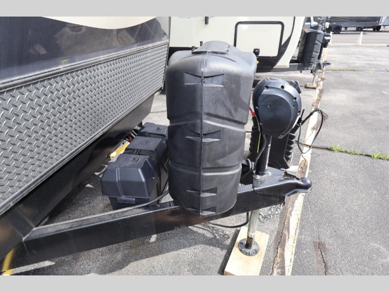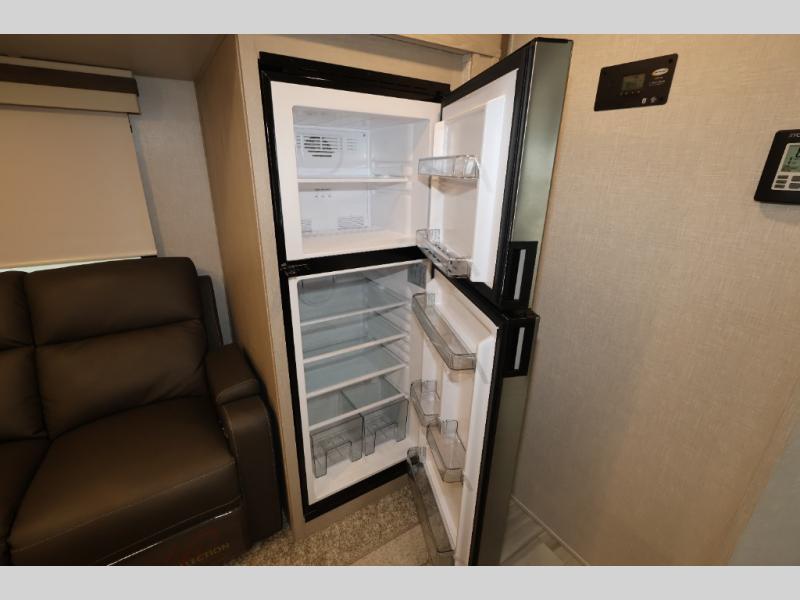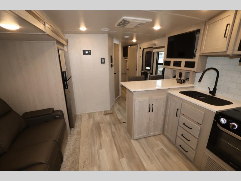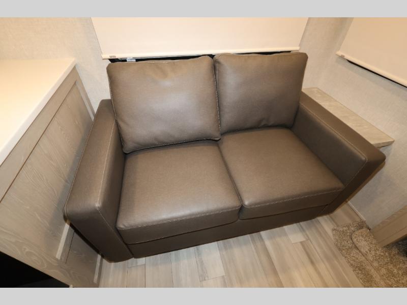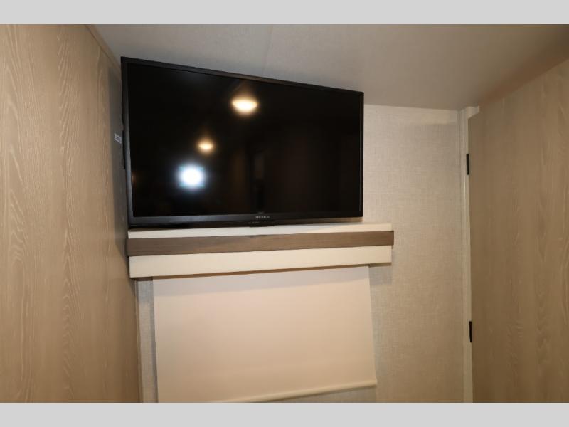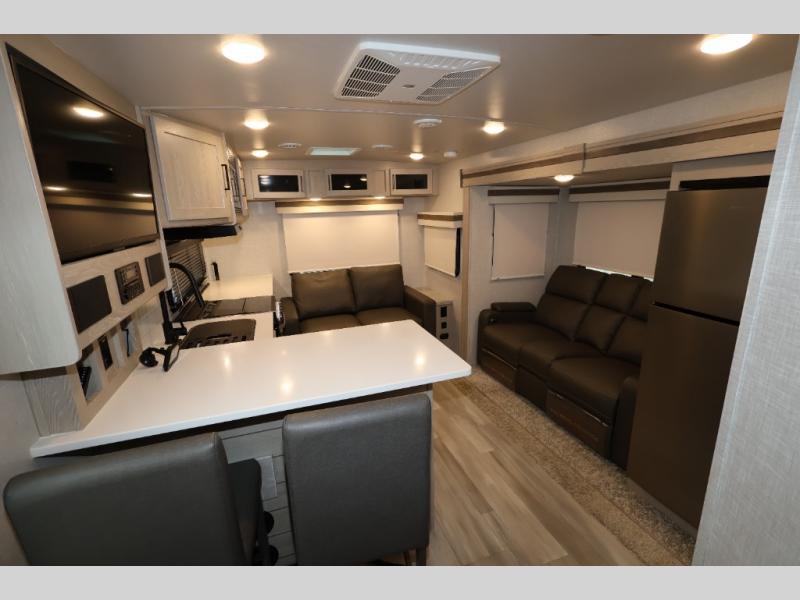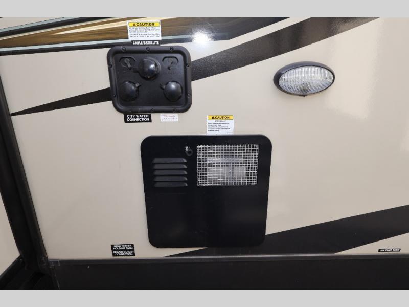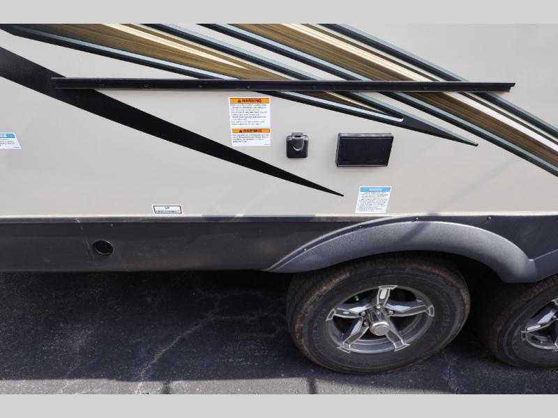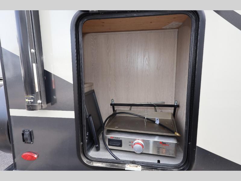 When you are ready to camp in comfort with your favorite person, hitch up and head out with this trailer! The front bedroom offers extra floor space thanks to the queen bed slide, and you will find plenty of storage plus you can enjoy the view out of the windows. The double entry bath is convenient especially when you have overnight guests sleep over on the hide-a-bed sofa in the main living and kitchen area. The theater seats offer a relaxing way to watch the LED TV, and the breakfast bar with stools is a fun way to eat your meals. Don't forget about the outside griddle when cooking, and the 21' power awning offers an outdoor living area protected from the elements and includes LED lighting for nighttime.