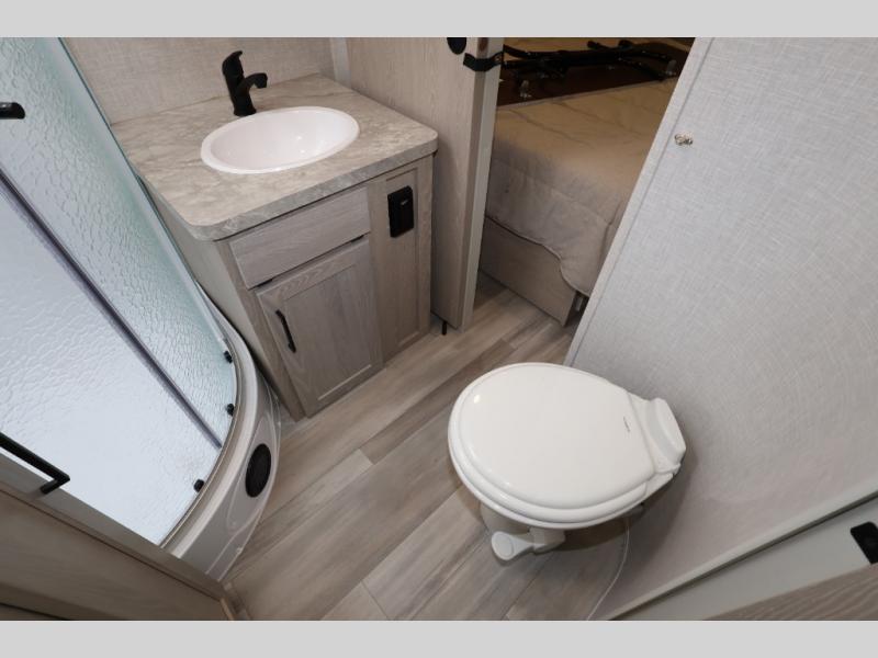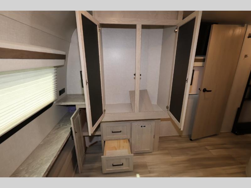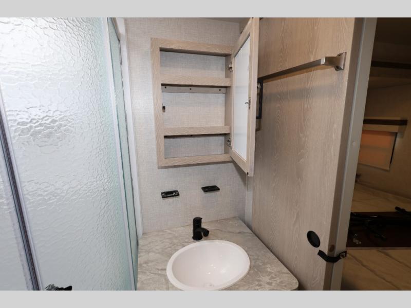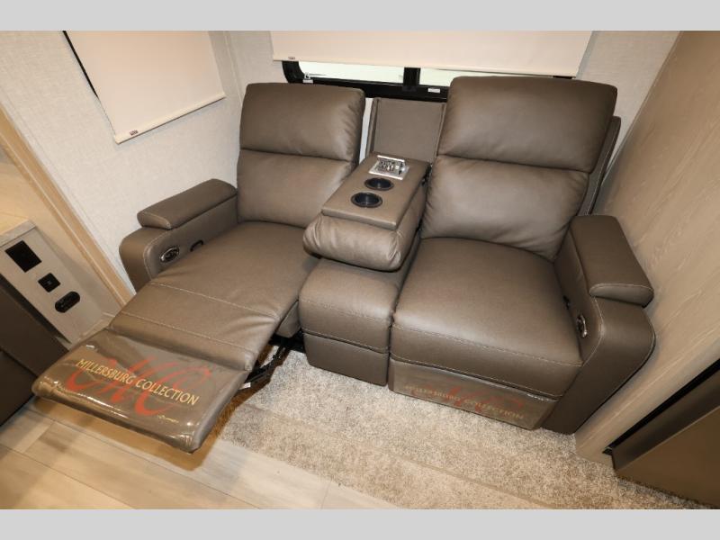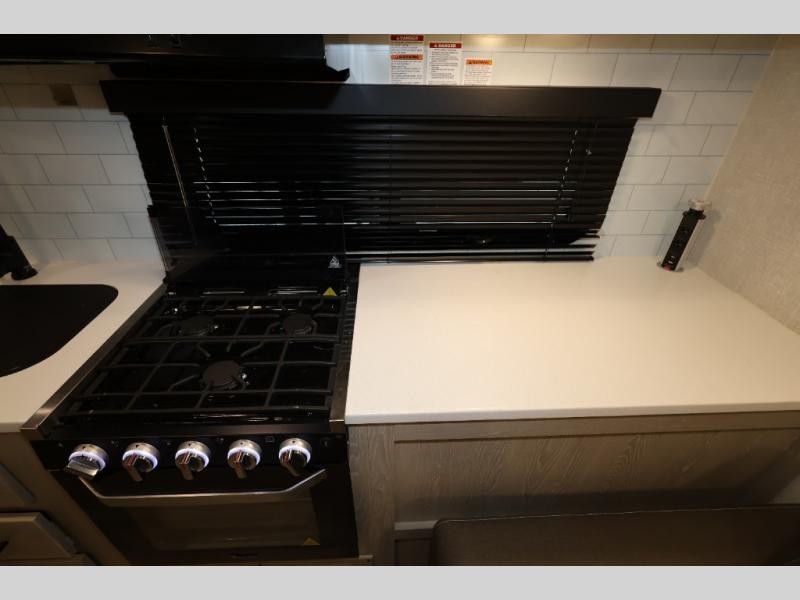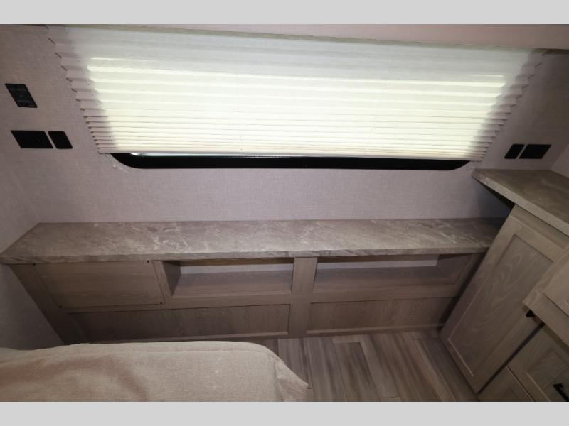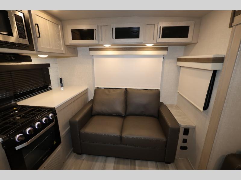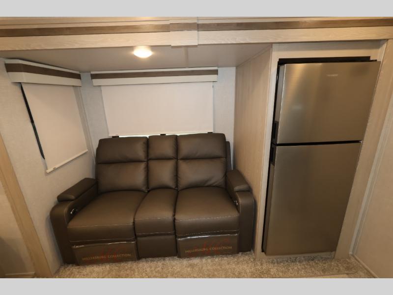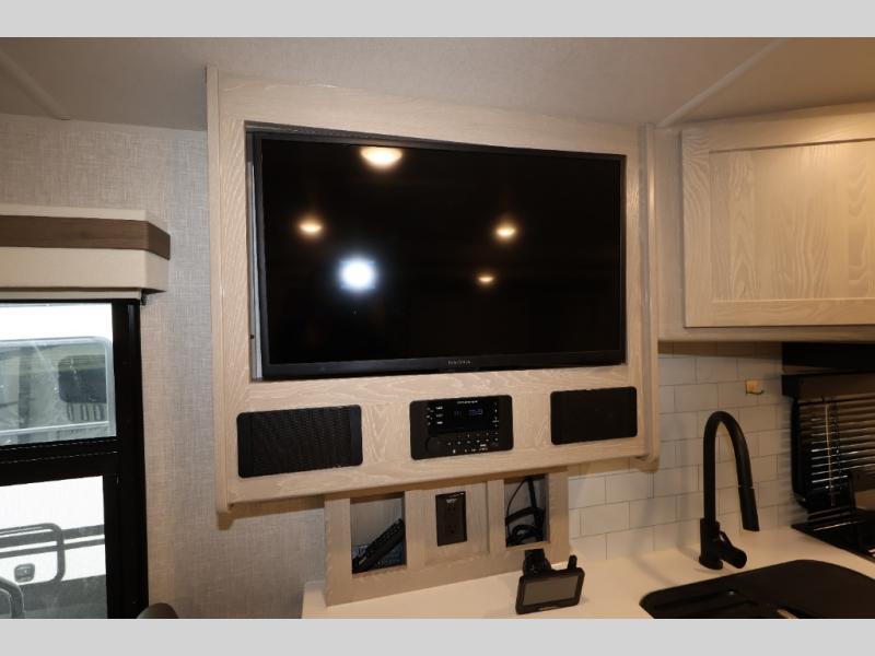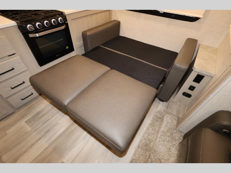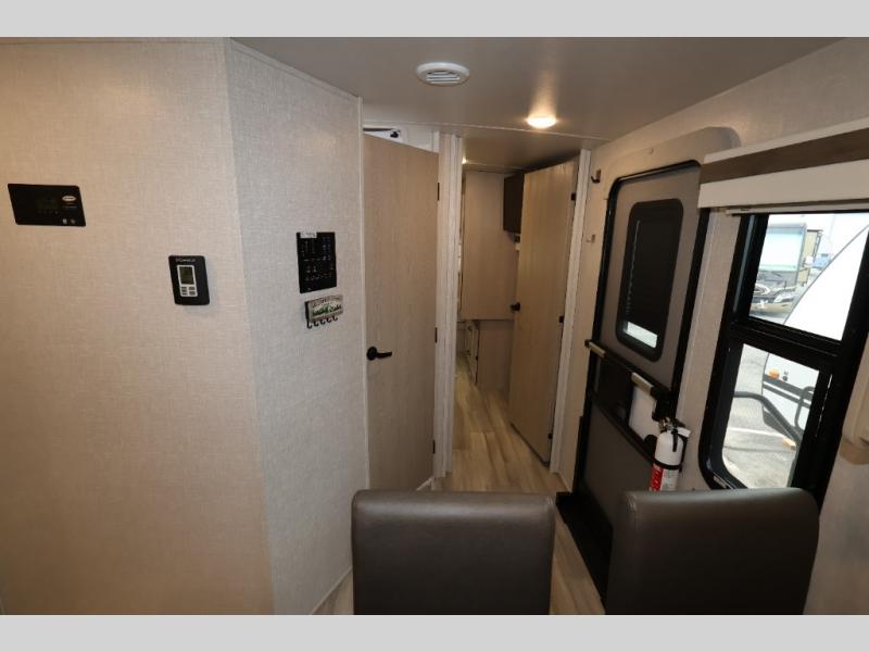 When you are ready to camp in comfort with your favorite person, hitch up and head out with this trailer! The front bedroom offers extra floor space thanks to the queen bed slide, and you will find plenty of storage plus you can enjoy the view out of the windows. The double entry bath is convenient especially when you have overnight guests sleep over on the hide-a-bed sofa in the main living and kitchen area. The theater seats offer a relaxing way to watch the LED TV, and the breakfast bar with stools is a fun way to eat your meals. Don't forget about the outside griddle when cooking, and the 21' power awning offers an outdoor living area protected from the elements and includes LED lighting for nighttime.