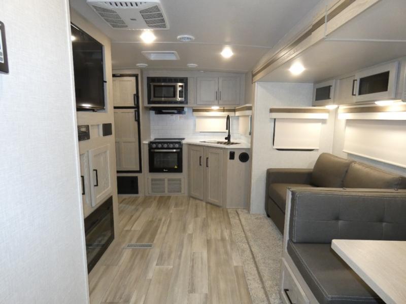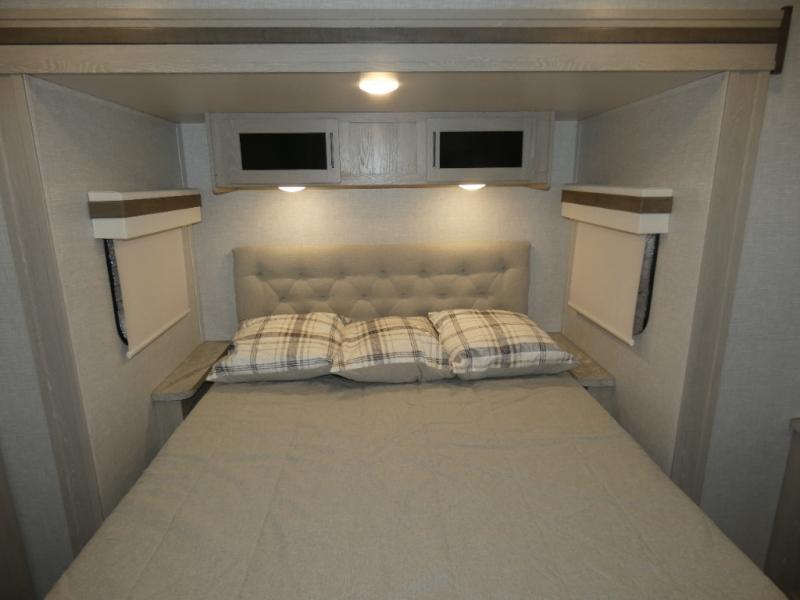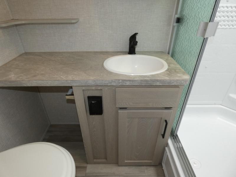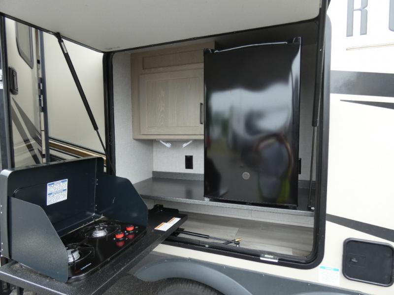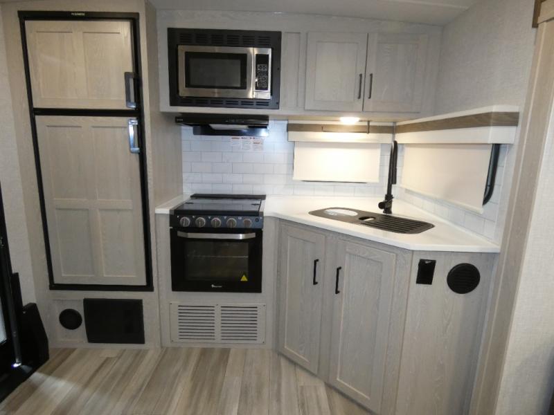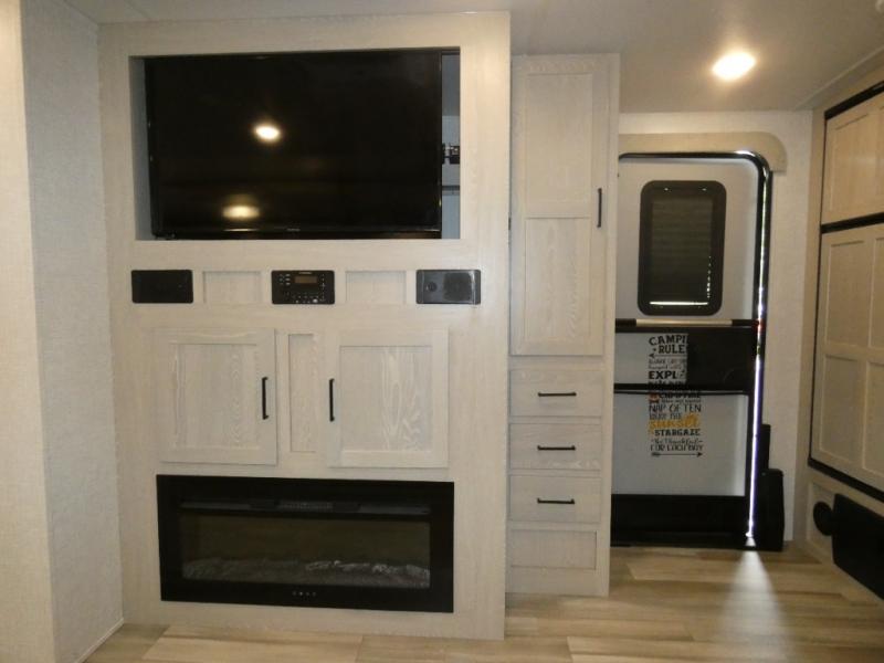 Whether you camp to relax or seek adventure, this trailer will be available for you to be comfortable indoors or outdoors! And you will find there are many convenient features throughout including the dual entry doors, the refrigerator and the pantry being next to the main entry for easy access, and the outside kitchen gives the cook choices when making meals. The interior rear kitchen includes full amenities, the theater seating and booth dinette slide offer seating and sleeping space, and the full bathroom gives you counter space to place your toiletries and such plus a shower to get cleaned up in each night before bedtime. And the front bedroom offers privacy, a queen bed slide, clothing storage and the second entry door.