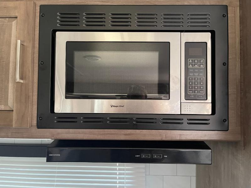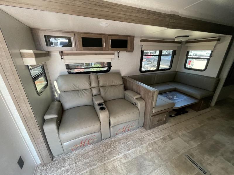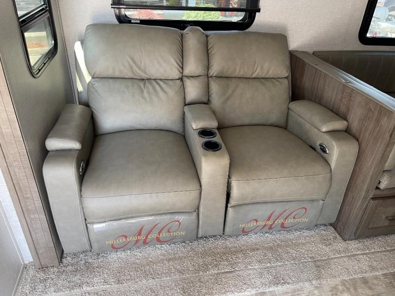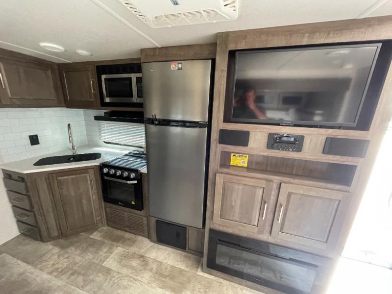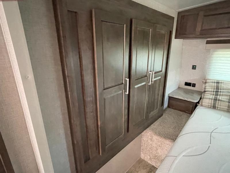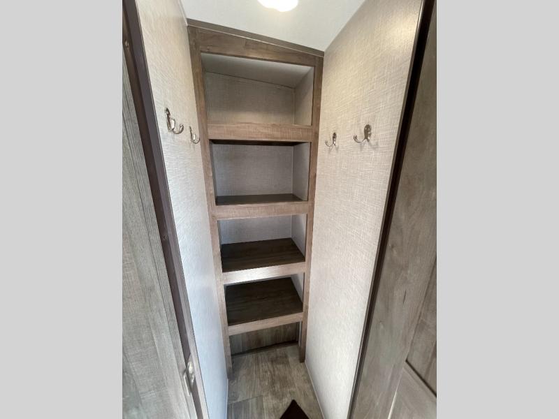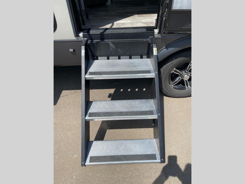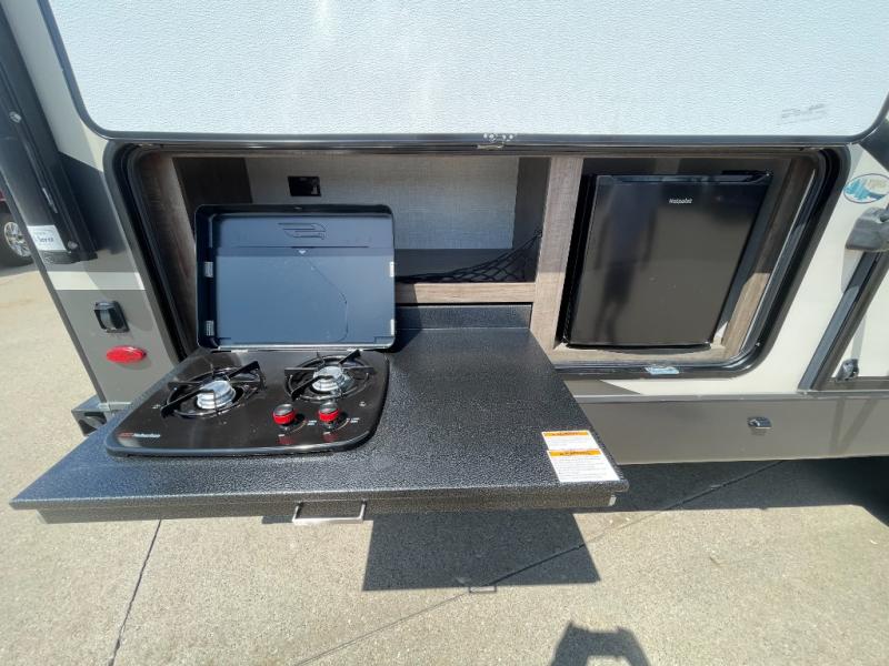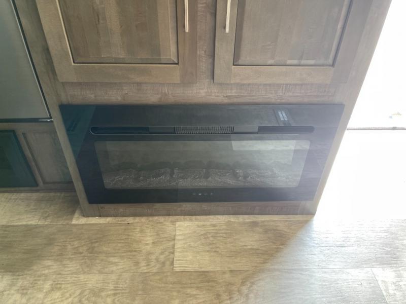 Looking for a trailer that sleeps eight, allows you to cook indoors or outdoors, and offers dual entry for convenience when you travel with a bigger group? This trailer provides for those wants and needs, and offers even more! The outside camp kitchen gives you more choices when feeding the masses along with the outside griddle, and the interior kitchen includes an L-shaped area for the cook to have their own space with full amenities including a counter extension and a walk-in pantry to bring along everything they need. The full bathroom will keep everyone refreshed, and the theater seating along with the U-shaped dinette offer seating inside to enjoy the LED TV and fireplace. There is plenty of storage found throughout the interior, and along the exterior you will find several places to stow your outdoor items including in the drop frame storage.
