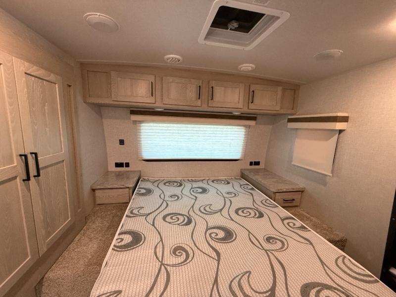 Looking for a trailer that sleeps eight, allows you to cook indoors or outdoors, and offers dual entry for convenience when you travel with a bigger group? This trailer provides for those wants and needs, and offers even more! The outside camp kitchen gives you more choices when feeding the masses along with the outside griddle, and the interior kitchen includes an L-shaped area for the cook to have their own space with full amenities including a counter extension and a walk-in pantry to bring along everything they need. The full bathroom will keep everyone refreshed, and the theater seating along with the U-shaped dinette offer seating inside to enjoy the LED TV and fireplace. There is plenty of storage found throughout the interior, and along the exterior you will find several places to stow your outdoor items including in the drop frame storage.
