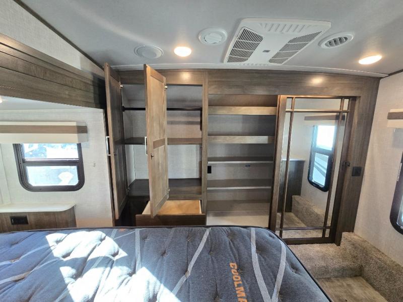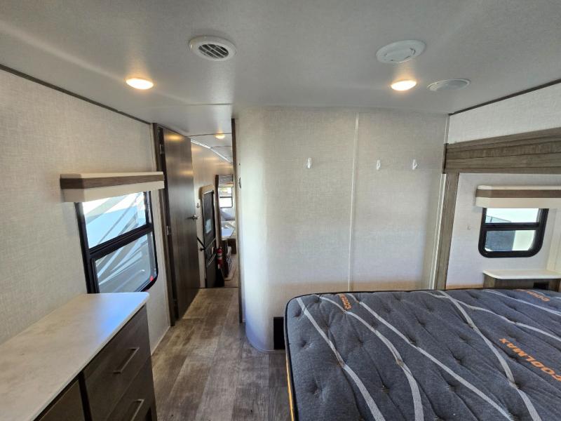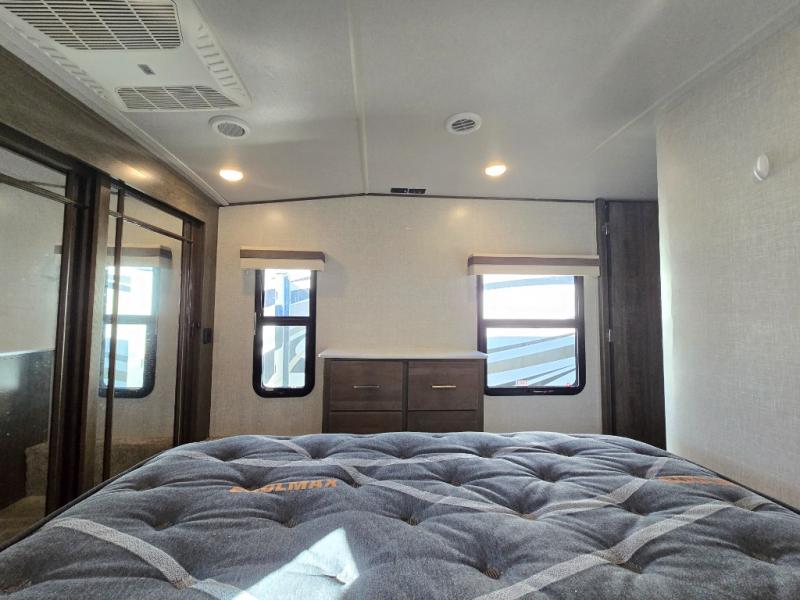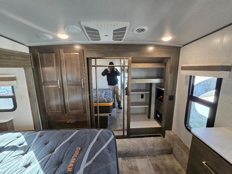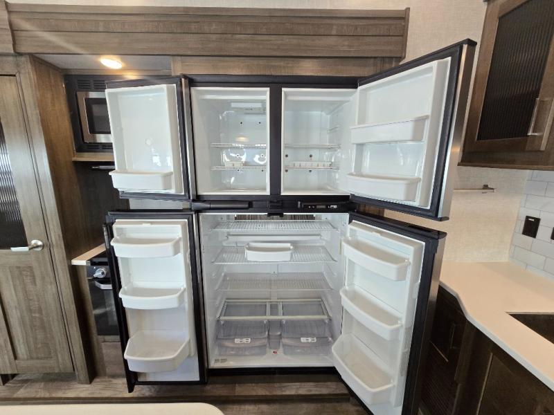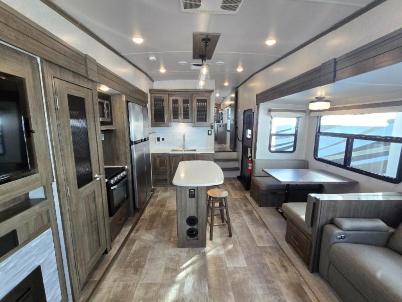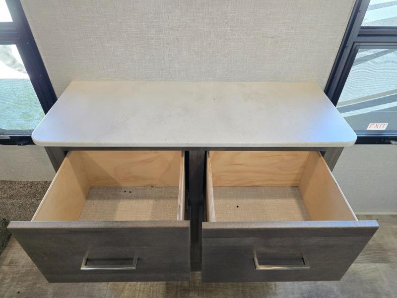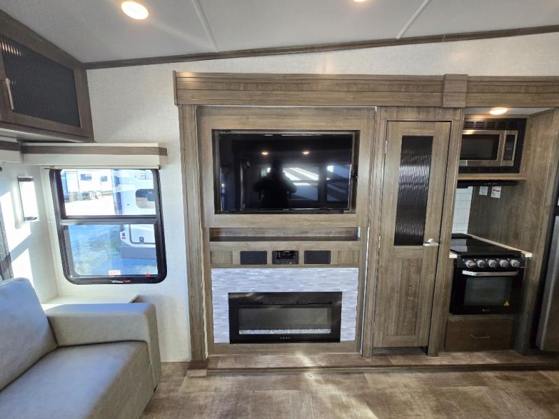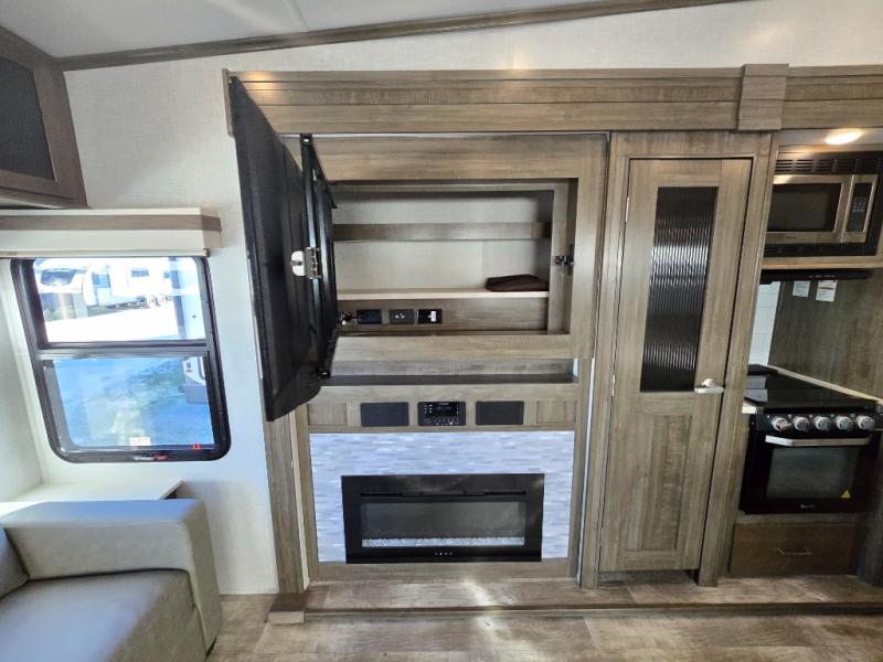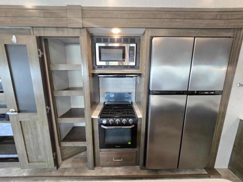 You can enjoy views from inside or outside each day once this RV is setup at the campgrounds! The large windows in the furniture slide and the windows throughout allow you to take in the scenery, and the three slide outs give you a spacious main living and kitchen area as well as front bedroom. You will find lots of seating for guests on the hide-a-bed sofa in the rear, and on the theater seats and booth dinette in the slide, plus there are two stools to use at the kitchen island. The cook will love the residential refrigerator and large pantry to store lots of food, and everyone can enjoy the LED TV and fireplace when visiting and relaxing. And the front bedroom offers a queen bed slide, a front wardrobe, a shirt closet and a space prepped for a washer/dryer option, plus a dresser.