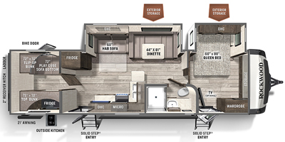 Go camping to explore the outdoors, to enjoy the scenery and do it all over again thanks to the comfort of your own trailer at the campsite! From dual entry making entering and exiting easy to the private rear bunkhouse with two bunks and a Play Cube sofa plus the spacious private bedroom up front, you might not want to return home. You will find lots of storage in the front bedroom, plus a queen bed slide and the second entry, and the full bathroom has access from the main living and kitchen area. Everyone can relax on the theater seating or U-shaped dinette while the cook uses the L-shaped kitchen area with full amenities to make meals. And the exterior gives you an outside kitchen, a griddle, plus storage including a bike door that allows you to stow things from the outside to the inside under the bunk.