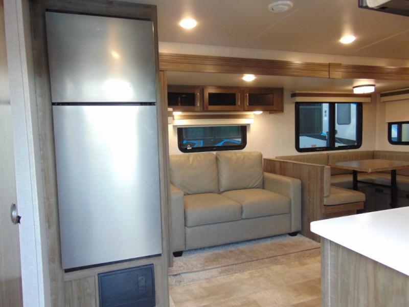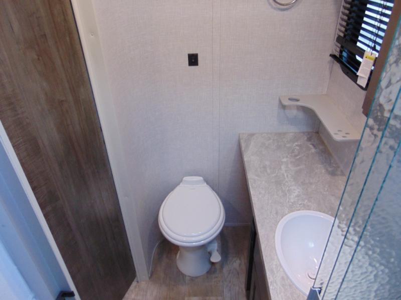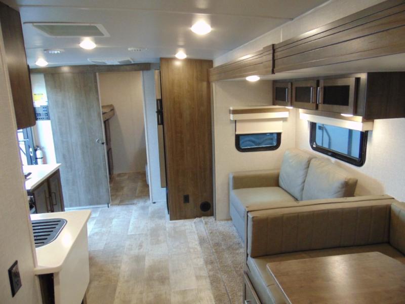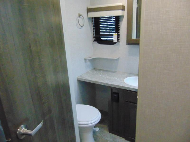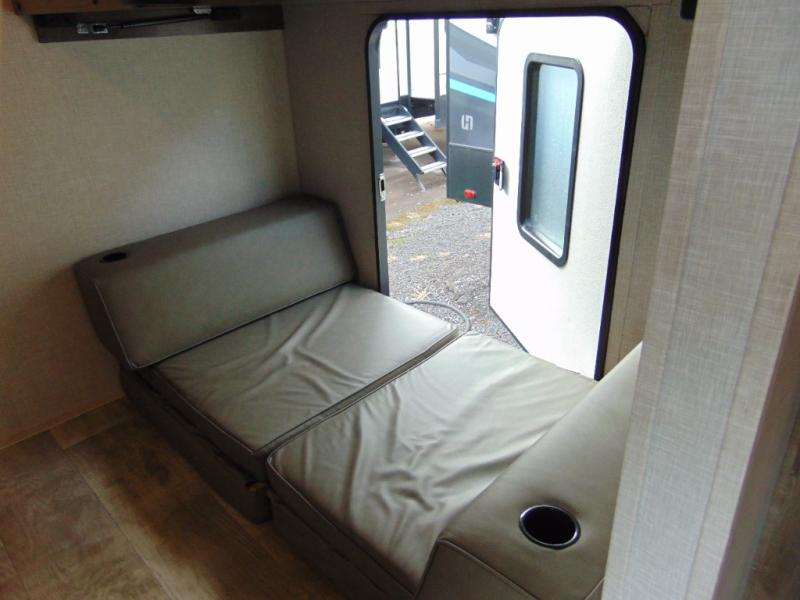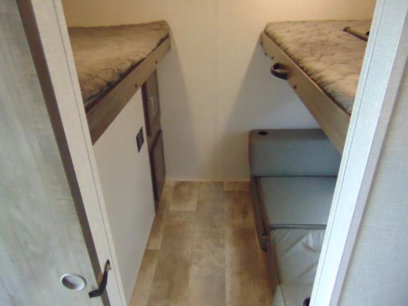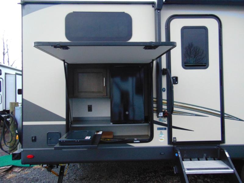 Go camping to explore the outdoors, to enjoy the scenery and do it all over again thanks to the comfort of your own trailer at the campsite! From dual entry making entering and exiting easy to the private rear bunkhouse with two bunks and a Play Cube sofa plus the spacious private bedroom up front, you might not want to return home. You will find lots of storage in the front bedroom, plus a queen bed slide and the second entry, and the full bathroom has access from the main living and kitchen area. Everyone can relax on the theater seating or U-shaped dinette while the cook uses the L-shaped kitchen area with full amenities to make meals. And the exterior gives you an outside kitchen, a griddle, plus storage including a bike door that allows you to stow things from the outside to the inside under the bunk.