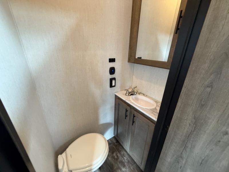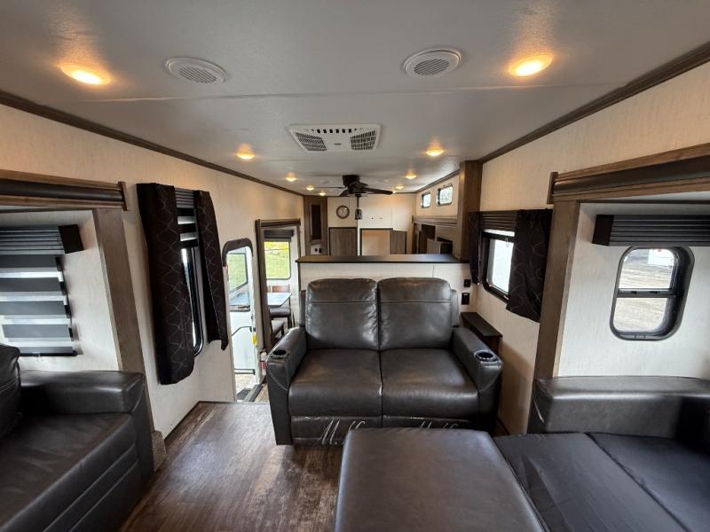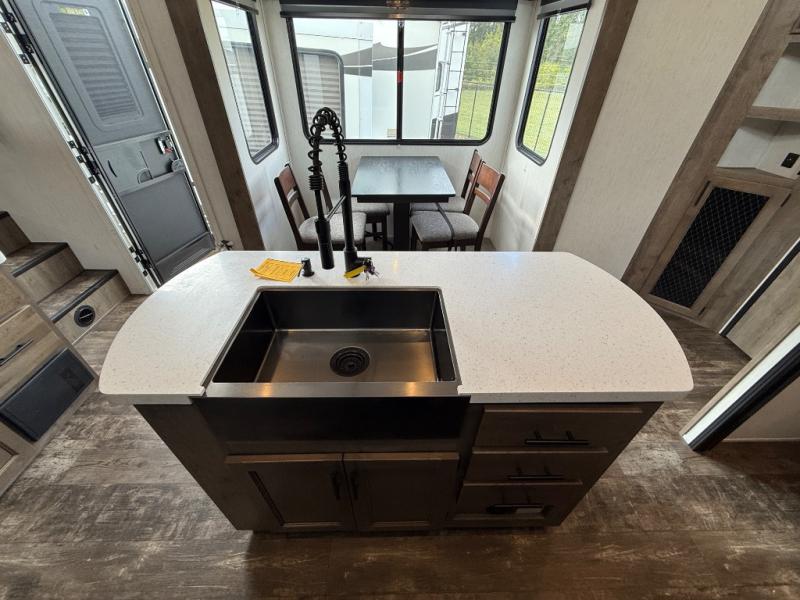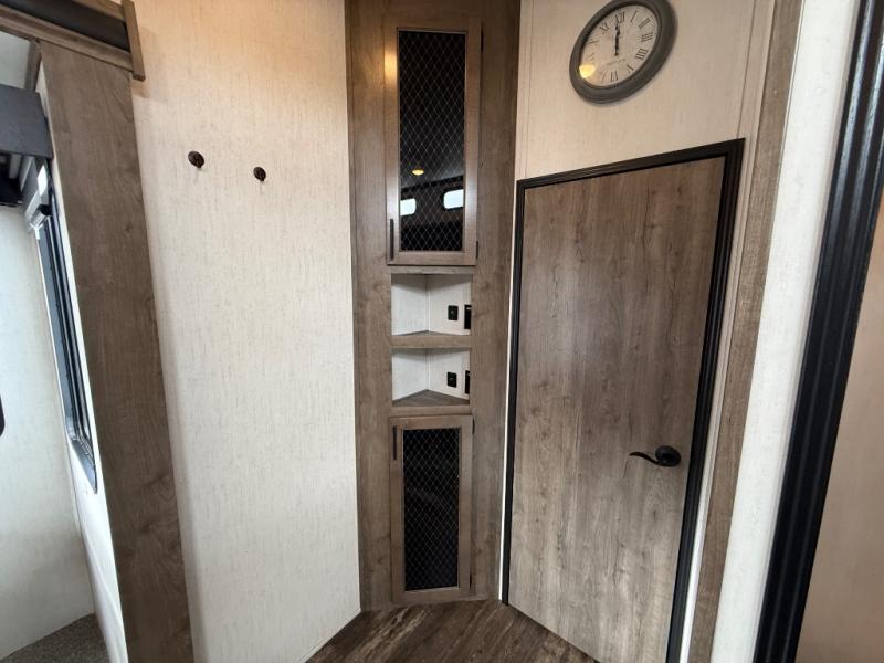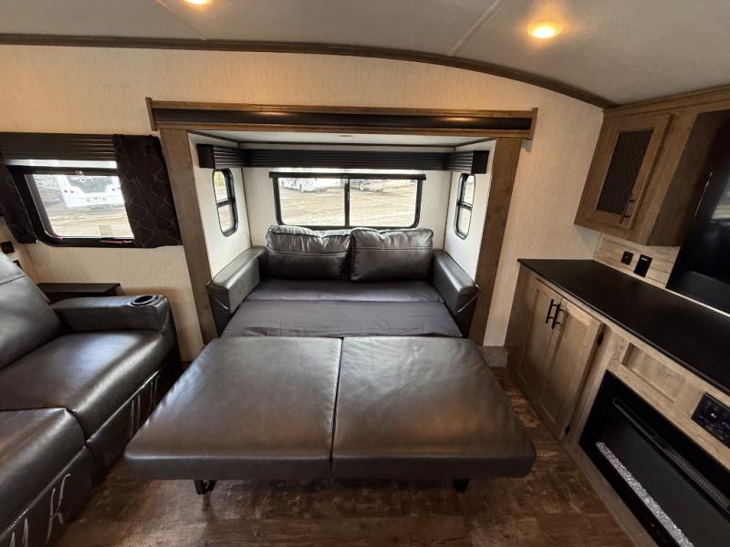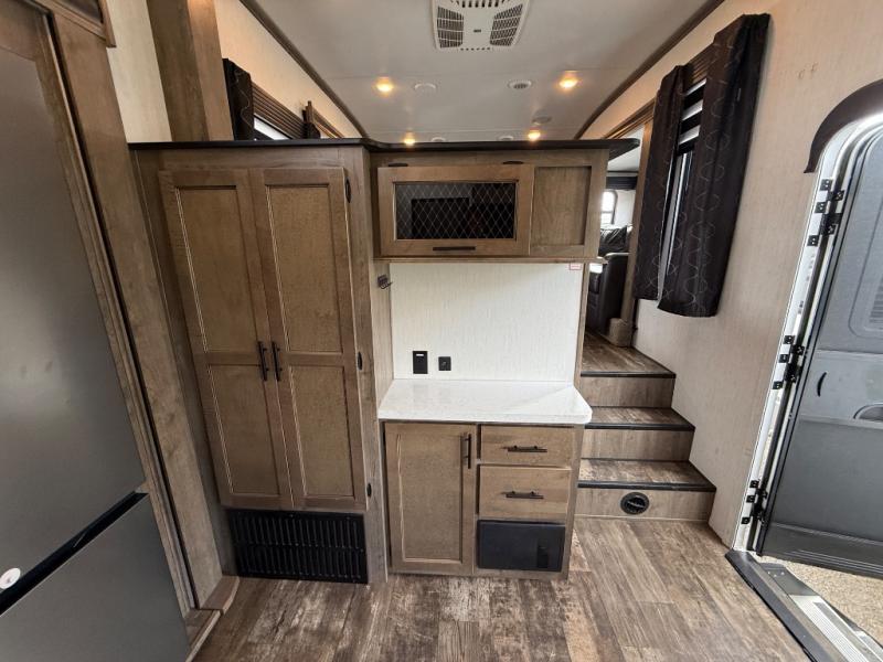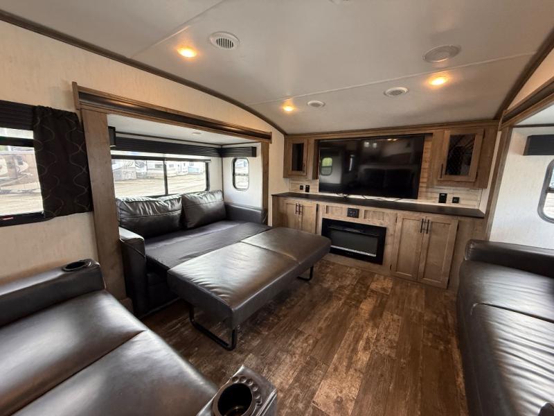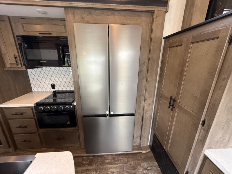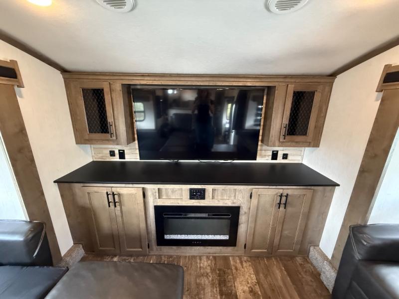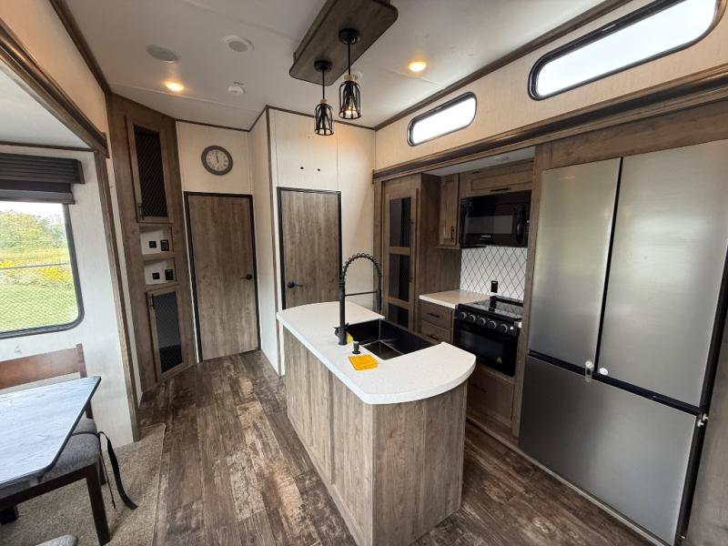 This Sabre fifth wheel with a full and half bath is sure to be a crowd pleaser! The front living area is the perfect place for everyone to visit each other comfortably on the two tri-fold sofas that can be transformed into extra sleeping spaces, or at the theater seating for complete relaxation. You will also find an entertainment center with a fireplace and a residential-size LED TV. This Sabre kitchen is packed out with convenient features, such as a 12V refrigerator with French doors, a kitchen island, and a lighted pantry with motion sensors. The rear master suite has access to its very own full bathroom with a double-sink vanity for two to get ready at once and a wardrobe that is prepped for the optional washer and dryer to be added for convenience!