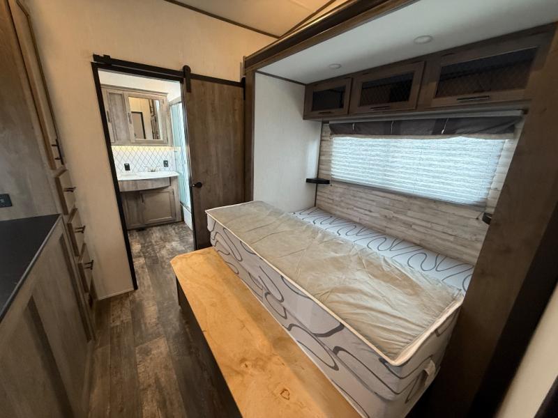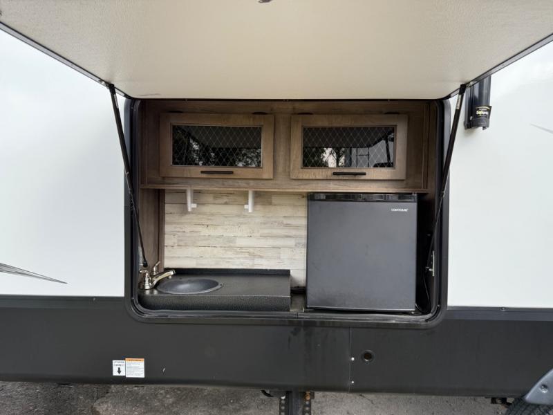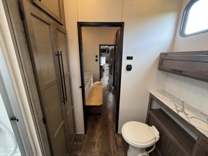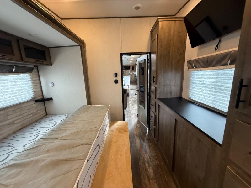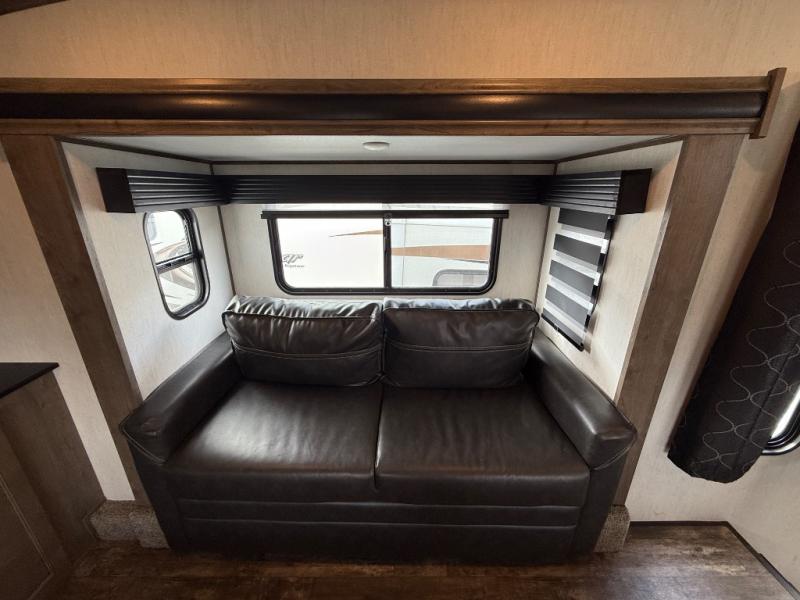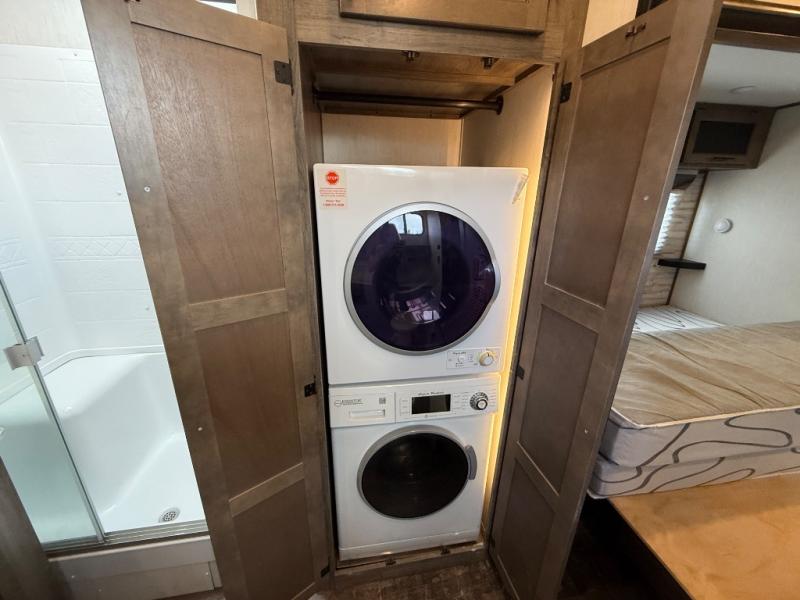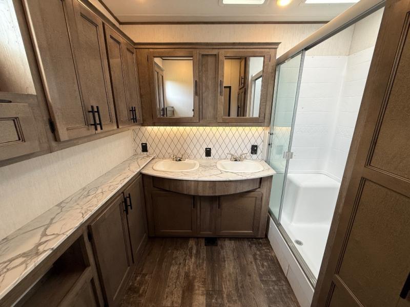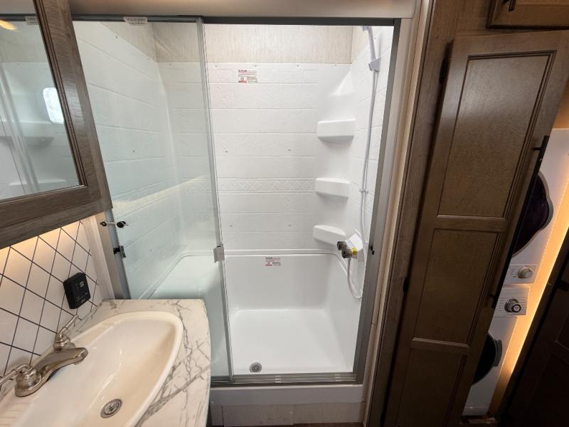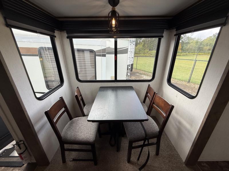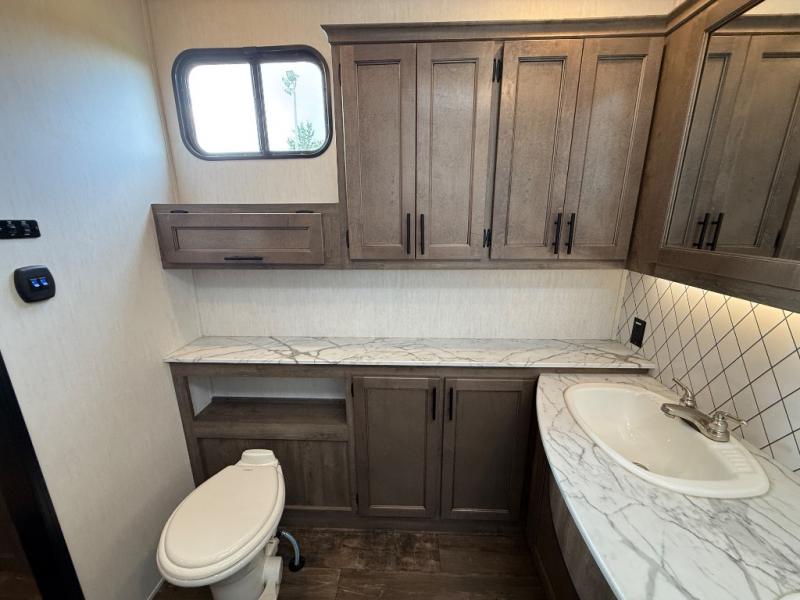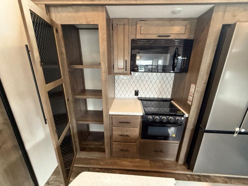 This Sabre fifth wheel with a full and half bath is sure to be a crowd pleaser! The front living area is the perfect place for everyone to visit each other comfortably on the two tri-fold sofas that can be transformed into extra sleeping spaces, or at the theater seating for complete relaxation. You will also find an entertainment center with a fireplace and a residential-size LED TV. This Sabre kitchen is packed out with convenient features, such as a 12V refrigerator with French doors, a kitchen island, and a lighted pantry with motion sensors. The rear master suite has access to its very own full bathroom with a double-sink vanity for two to get ready at once and a wardrobe that is prepped for the optional washer and dryer to be added for convenience!