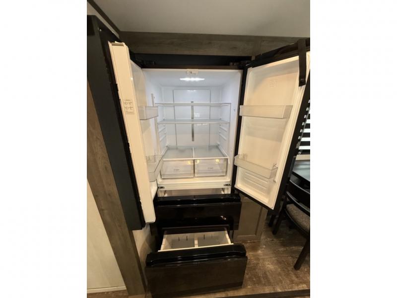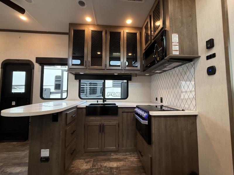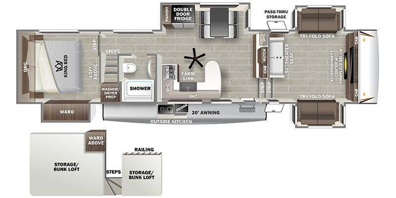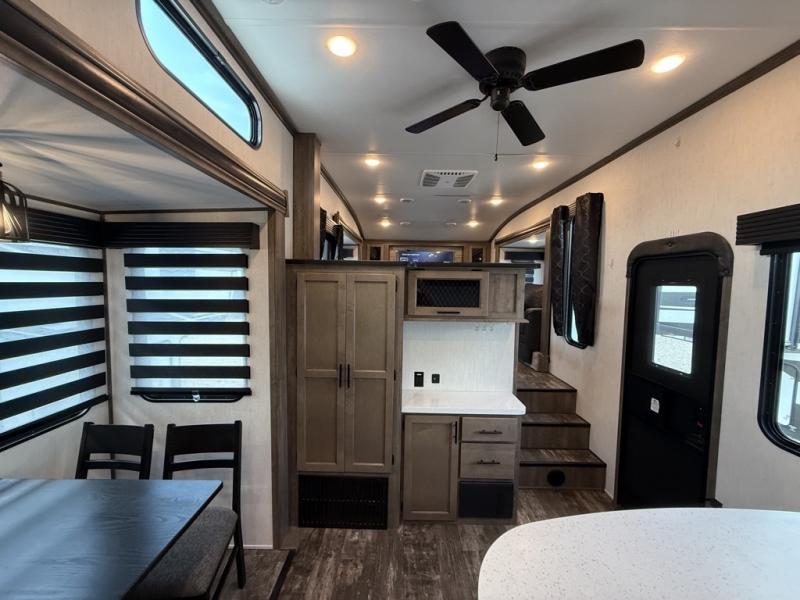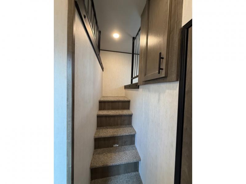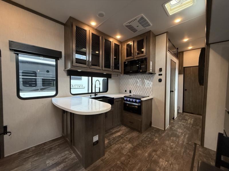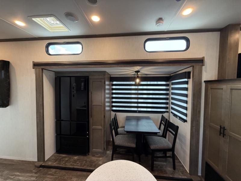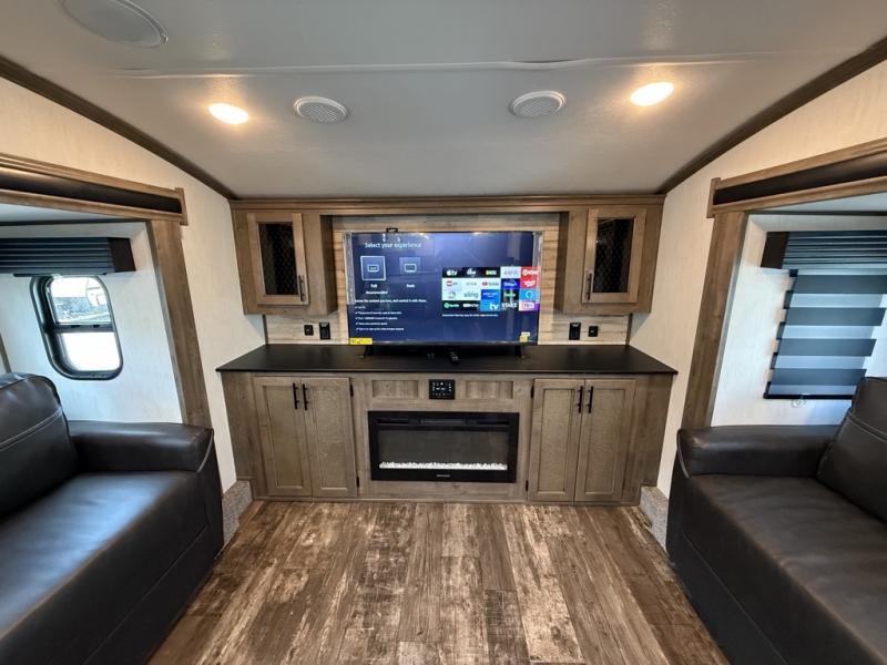 There is only one word that can describe this Sabre fifth wheel: fabulous! You will be amazed by the amount of comfortable convenience that is scattered all throughout this model for you and your family or friends. From the tri-fold sofa slides, the theater seats, the fireplace and entertainment center in the front living room to the rear bedroom with its queen bed and wardrobe slide out, you will always have a place to relax and unwind. Not only that, but there is also a large loft area up above the bedroom and bath which has sleeping space, storage, a wardrobe, and railing. The cook will enjoy the 12V refrigerator with French doors and pantry for all of your food storage needs, and the free-standing table with chairs is the perfect place to sit down and enjoy a delicious meal or play board games.