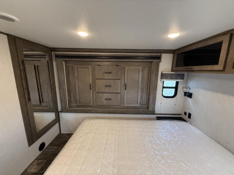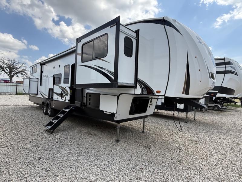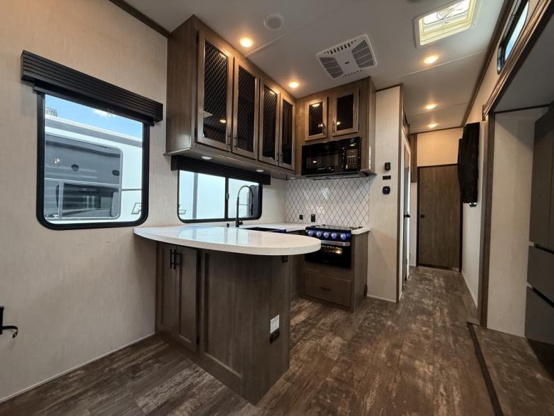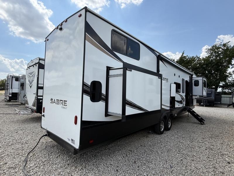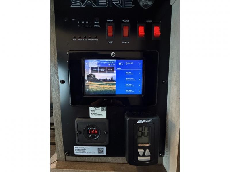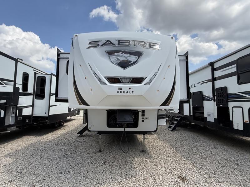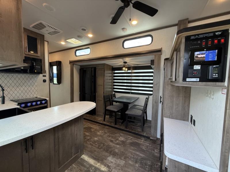 You will experience luxurious camping trips at an affordable price with any one of these Forest River Sabre fifth wheels! These models are durable and ready to travel anytime of the year thanks to features like the high-gloss gel-coat front cap with LED lighting, the PVC roof membrane, and the forced air underbelly with enclosed gate valves. The electric auto-leveling system makes setting up easy and safe, and the adjustable power awning with LED lighting will create an inviting outdoor living space. Each model includes a universal docking station which includes a black tank flush and an outside shower, and the backlit "Secure Step" landing for you to enter and exit the unit safely. Inside, you will love the design of the ambient accent lighting above the crown molding in the living area, the real wood lumbercore cabinetry, and the vintage gaslight decorative lighting!