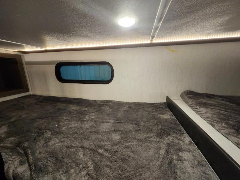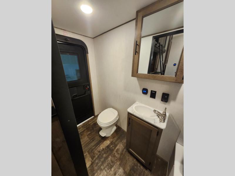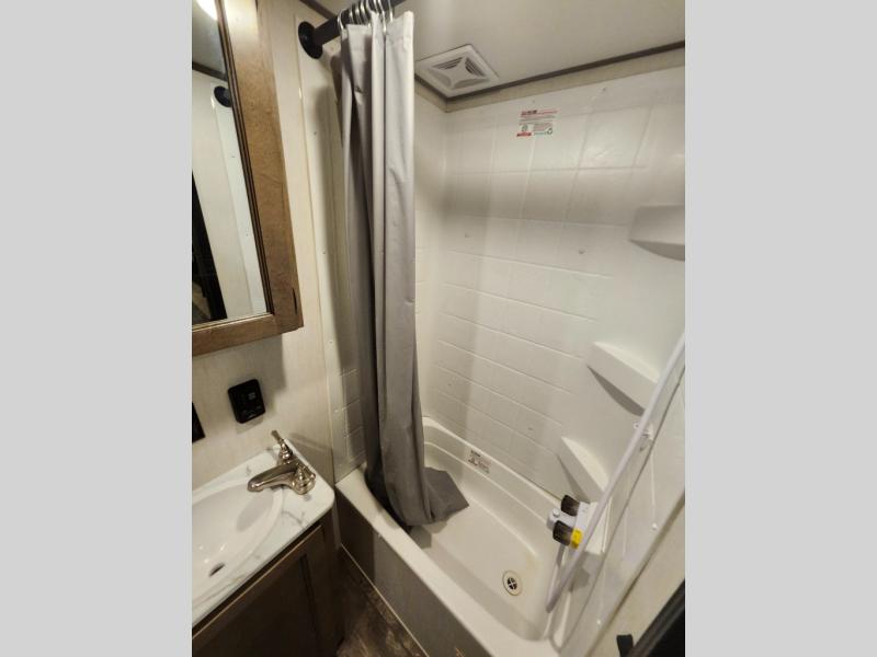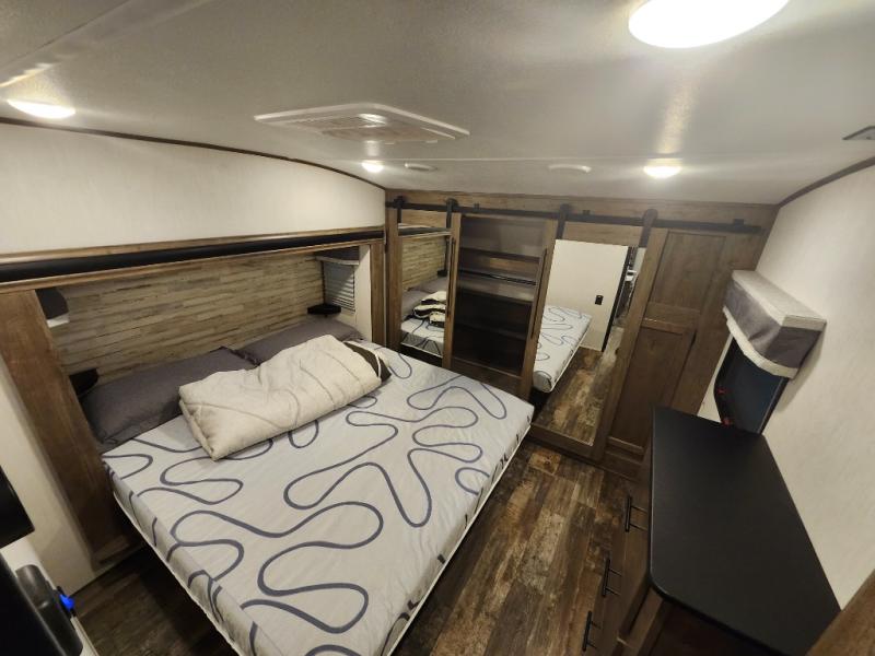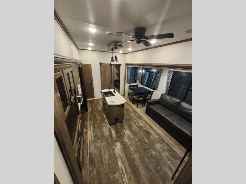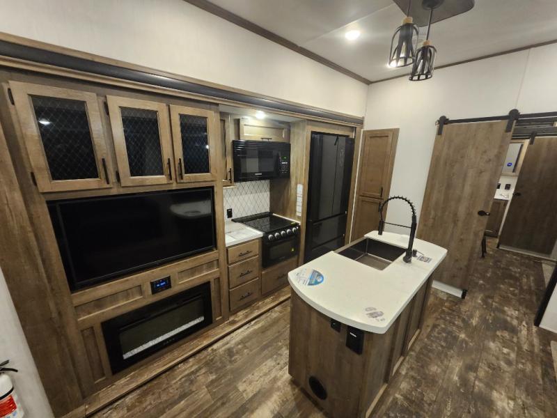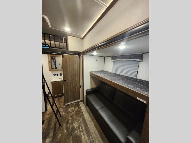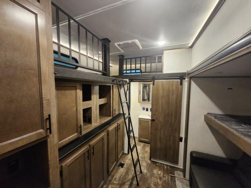 With two full bathrooms in this Sabre fifth wheel, everyone can stay squeaky clean, and with the washer and dryer prep in the front bedroom, your clothes can too if you choose that option. Your kids or friends will love having their own private bunkhouse suite with a bunk above a tri-fold sofa, an entertainment center with storage, and access to their very own full rear bathroom which even has an exterior entry door. There are plenty of sleeping areas for the whole gang to tag along too thanks to the loft area with two bunks. The chef of your group will love having the extra counter and storage space with the kitchen island, and if they want to enjoy some fresh air while they cook, then they can head to the outdoor kitchen.