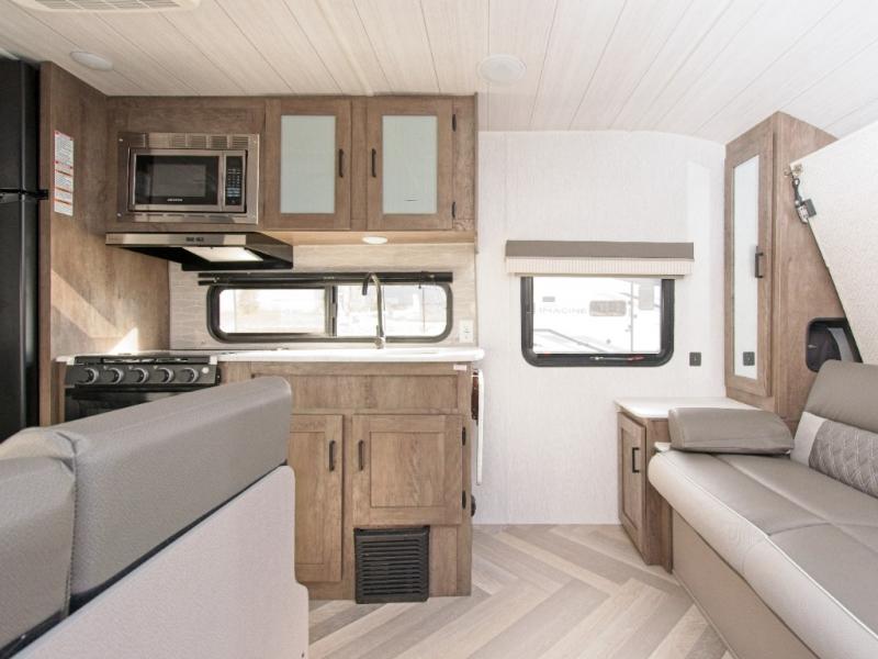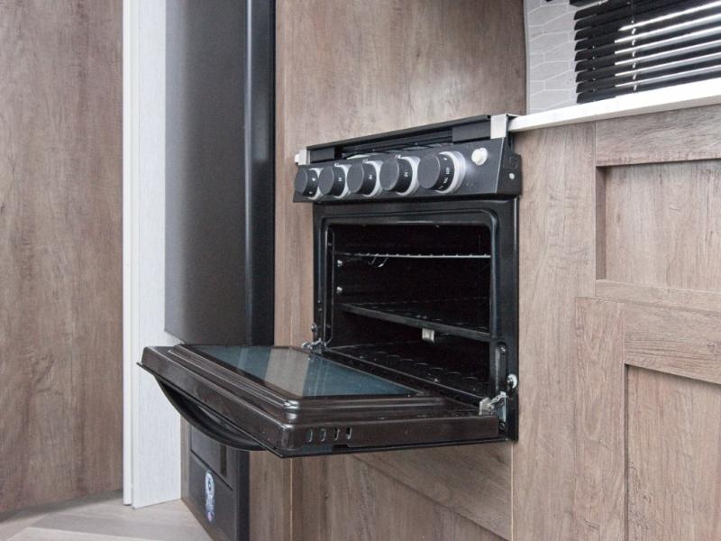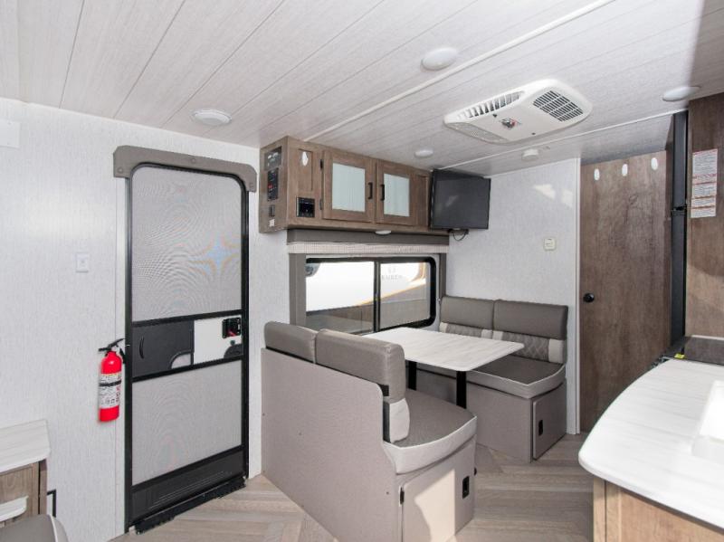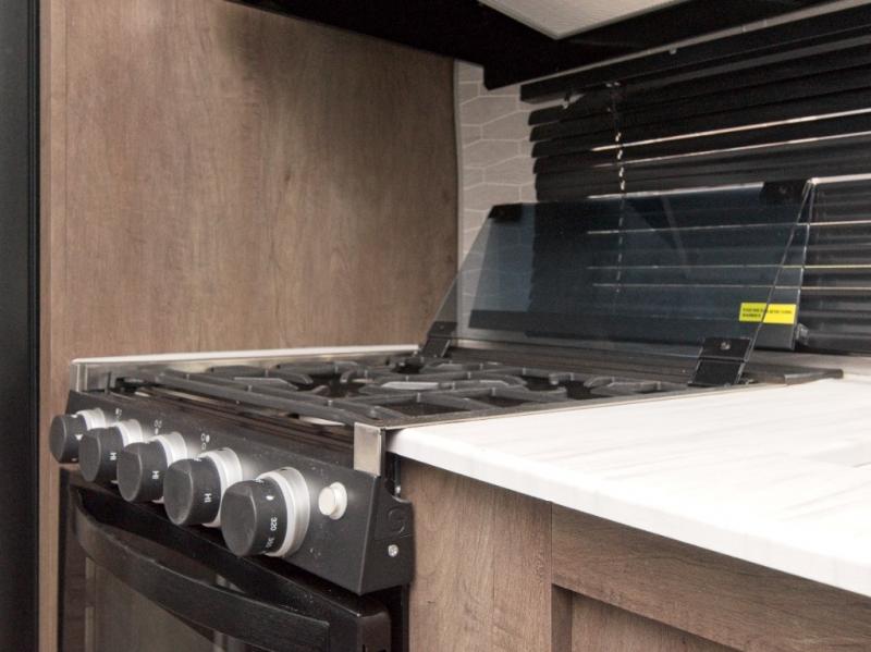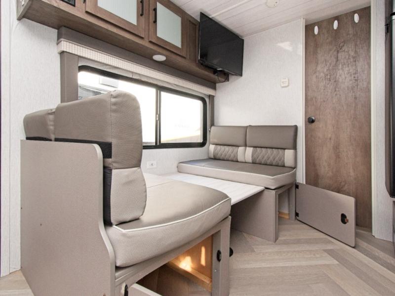 Prepare meals on the three-burner cooktop and oven, then gather at the booth dinette for family meals or game nights.