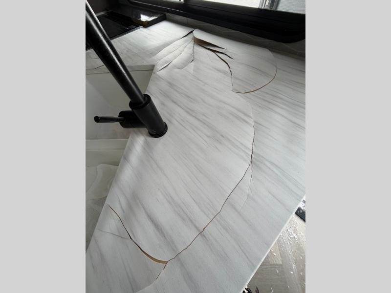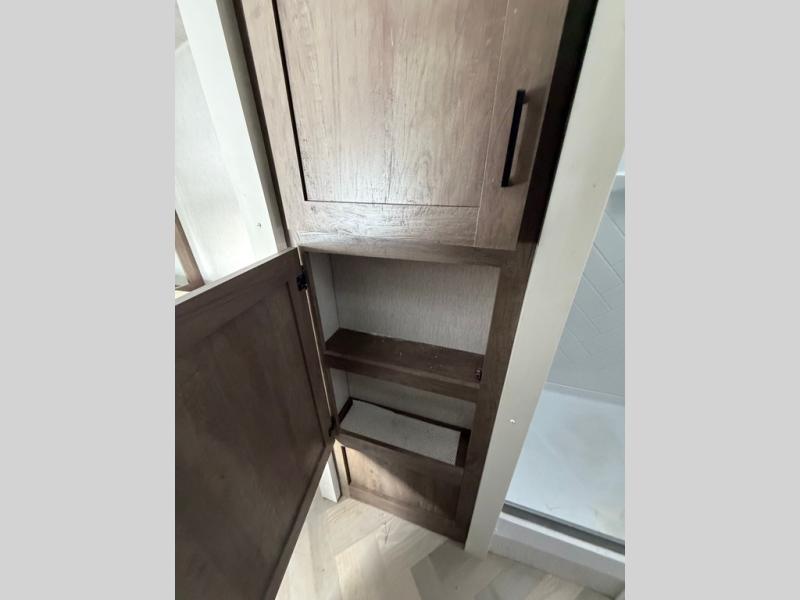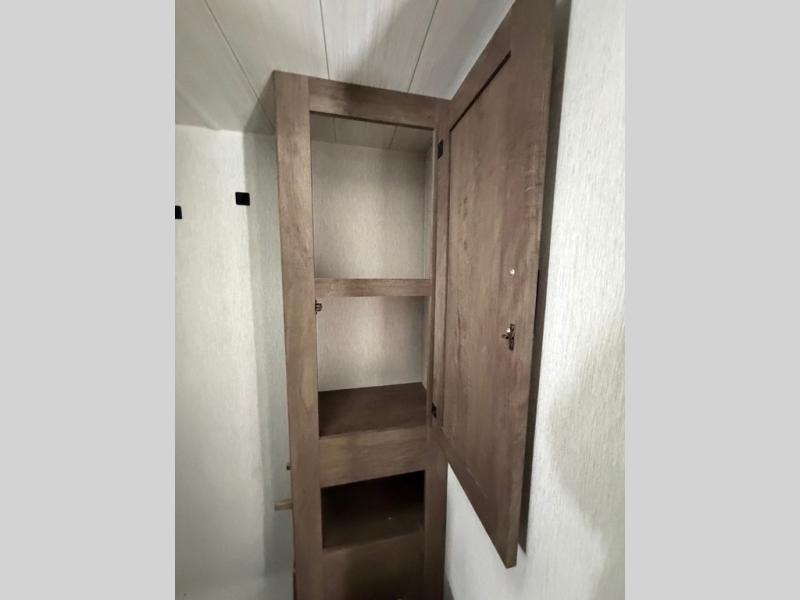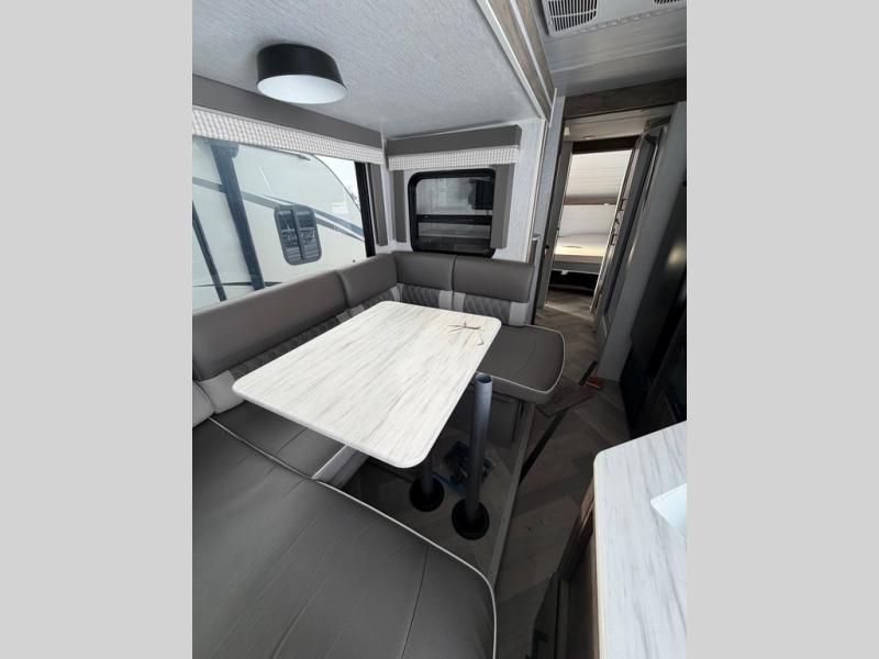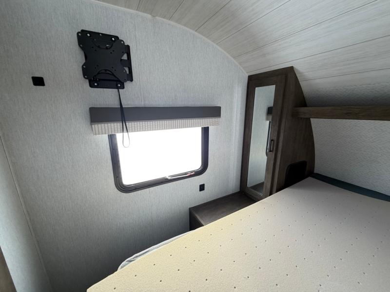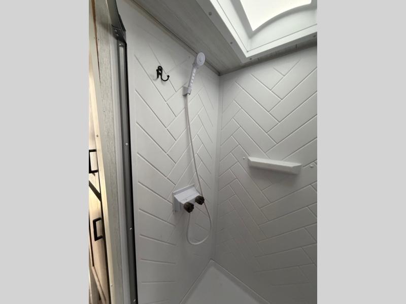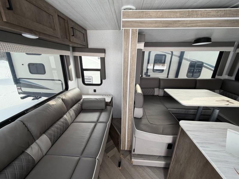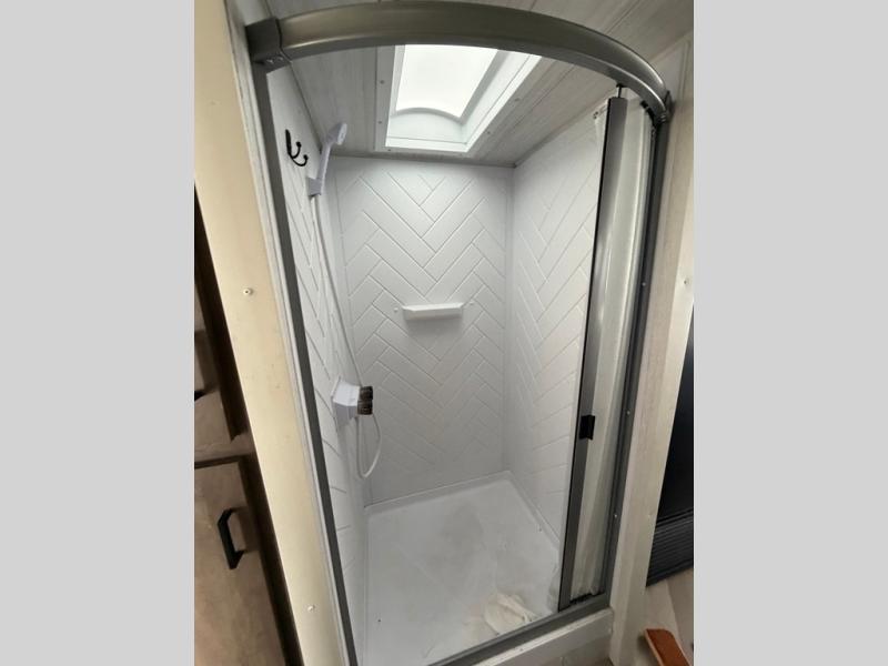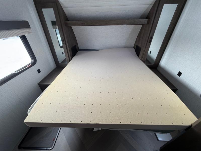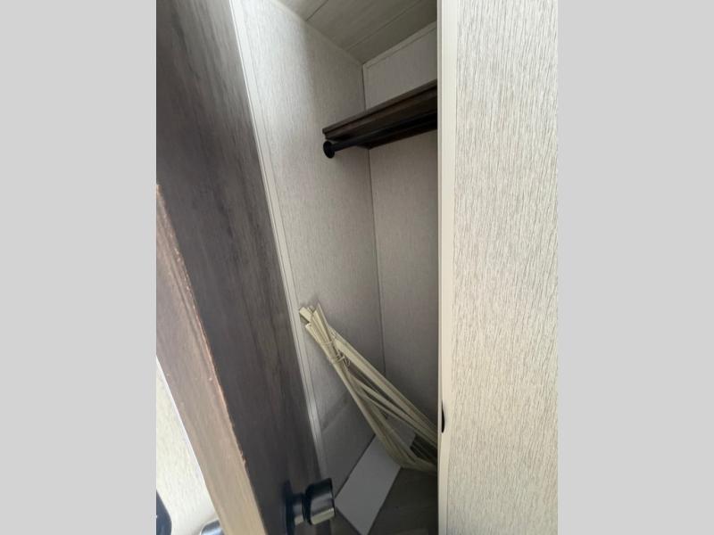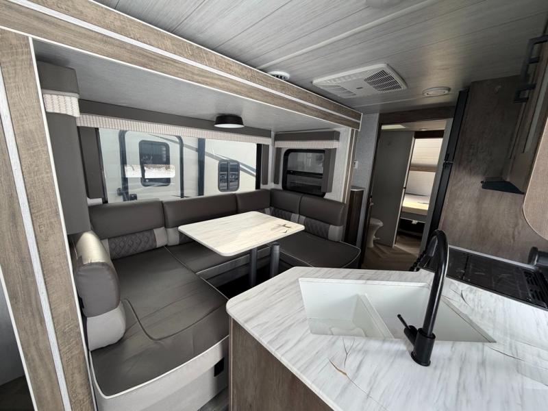 This travel trailer is packed full of features, but is still lightweight coming in at just over 5,000 lbs.! You will feel right at home in the front master bedroom with a queen bed that has closets on either side, CPAP storage, and a walk-in closet to keep your clothes looking their best. The walk-through bathroom has a walk-in shower with fiberglass surround and a skylight above for added natural lighting as you get ready. The U-shaped dinette slide has a panoramic window for you to enjoy your beautiful scenery as you eat dinner, and there is a fireplace at the entertainment center for a relaxing evening indoors. There is a pass-through storage area to store your outdoor camping gear, and a 16' power awning and exterior speakers to crank up the tunes!