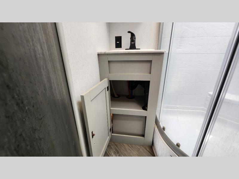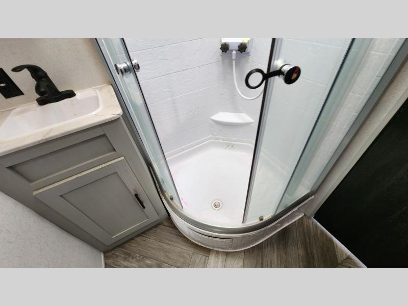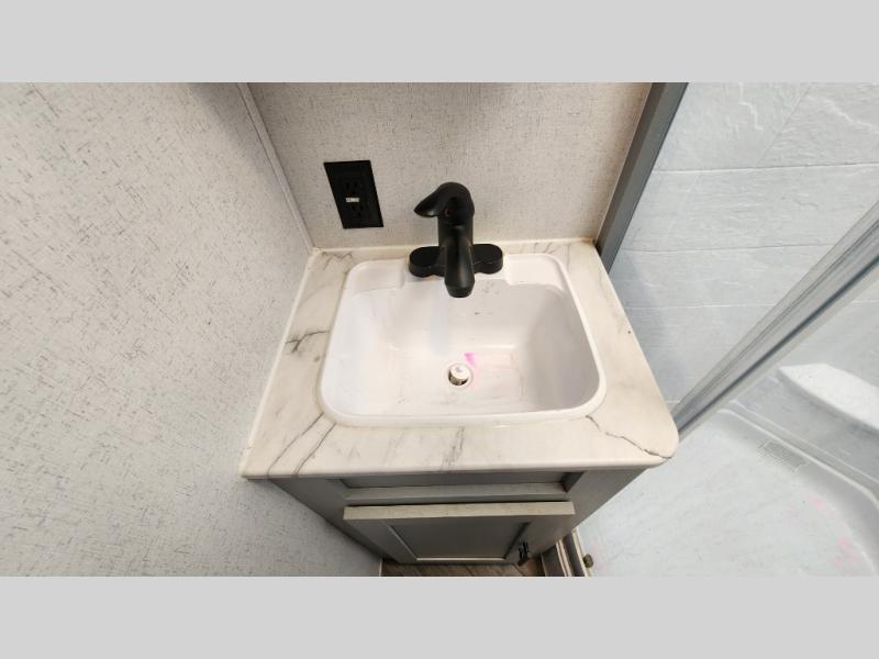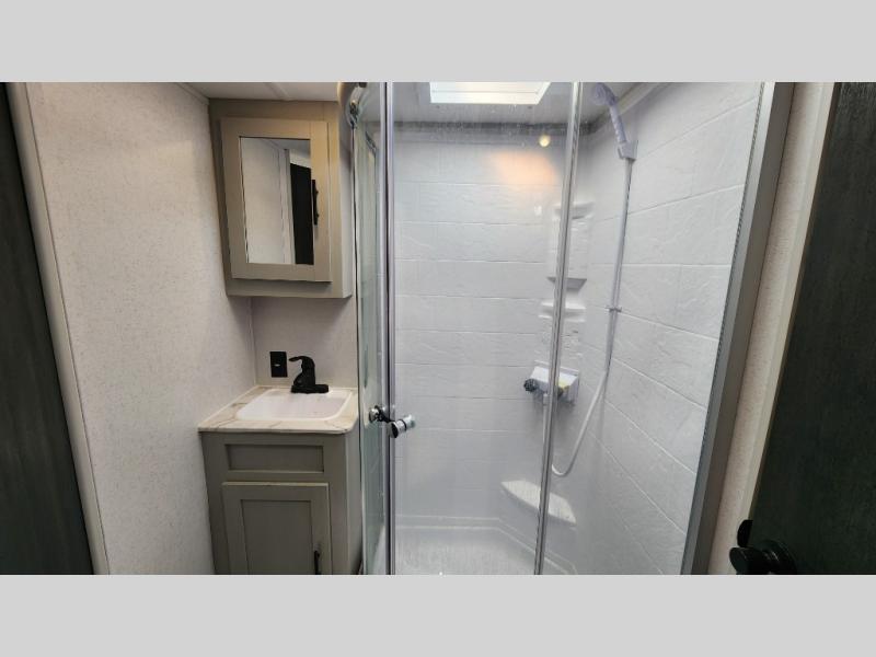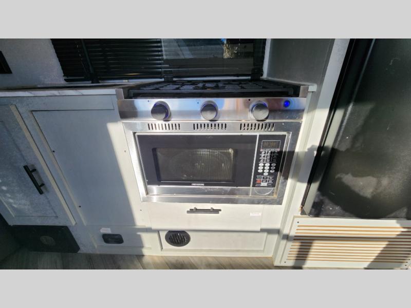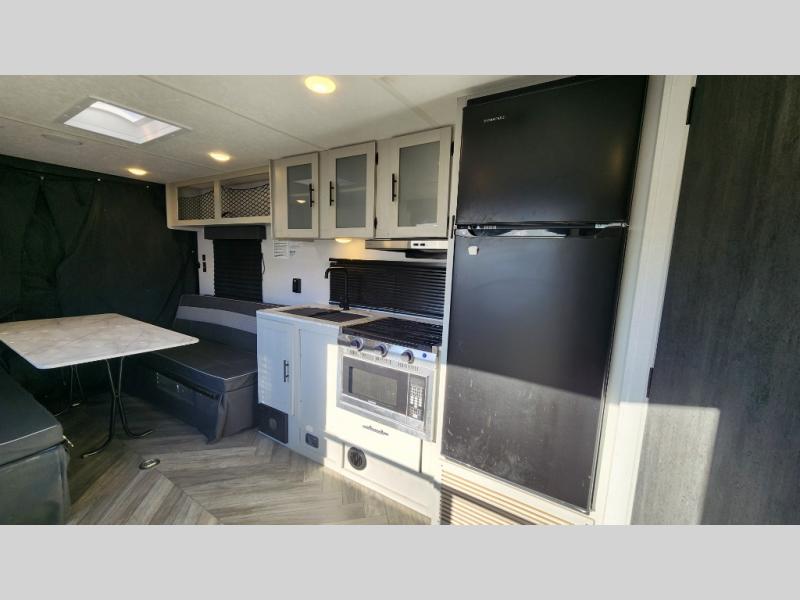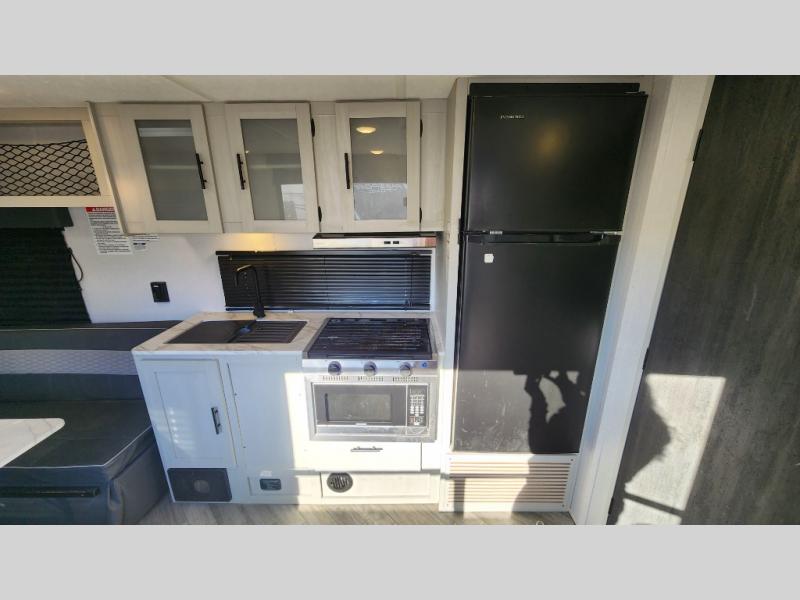 Step inside and unwind in a cozy, thoughtfully designed interior. The private front queen bed ensures restful nights, while the residential-style kitchen makes meal prep easy. A microwave, cooktop, refrigerator, and deep stainless-steel sink give you everything you need to stay fueled for the road ahead.
