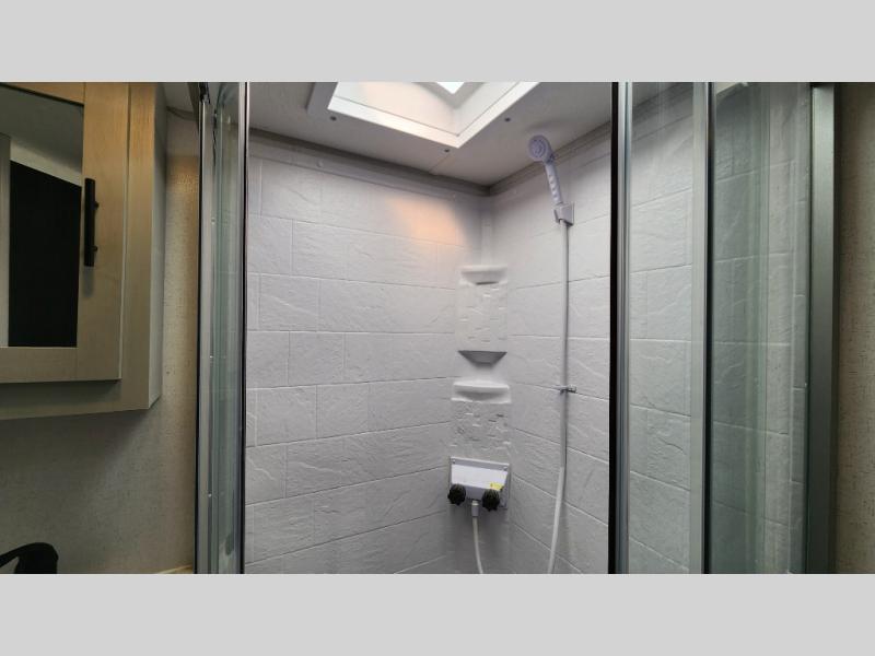 The spacious bathroom features a radius shower, toilet, and vanity, providing the perfect place to refresh after a long day outdoors. With ducted air conditioning, efficient heating, and smart storage throughout, the Salem FSX Platinum 260RTX keeps you comfortable wherever you roam.