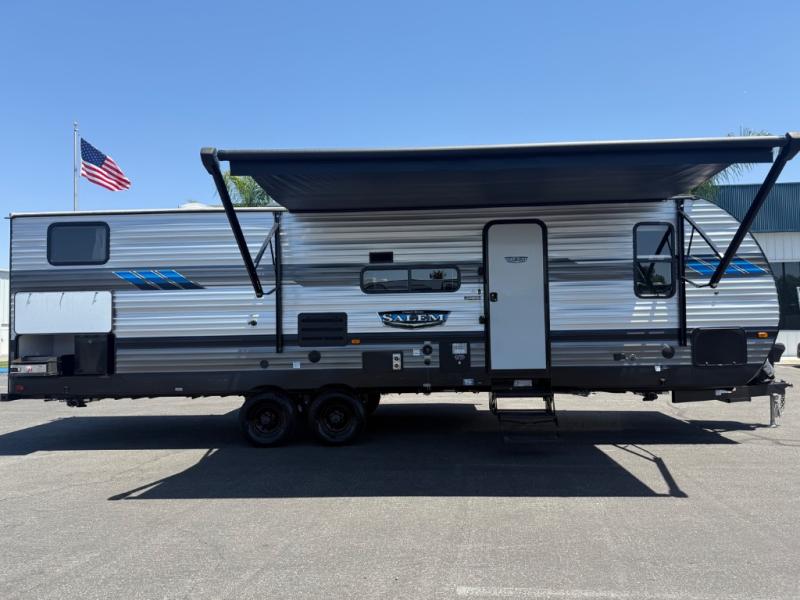 The Forest River Salem travel trailers come in a variety of layouts and designs because families come in a variety of shapes and sizes! Each model has been customized with the very best features so that you and your family always feel cared for when you travel! You will find an extra-large pass-through storage so that you can bring along all of your favorite outdoor gear, and the high-efficiency 15,000 BTU ducted air conditioner will keep you fresh and comfortable while the heat blazes outside. The two outside speakers will provide a fun atmosphere for you and your friends, and the bedside USB chargers will be so handy to have because it will allow you to keep your electronics charged throughout your entire trip.