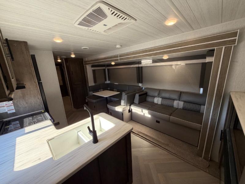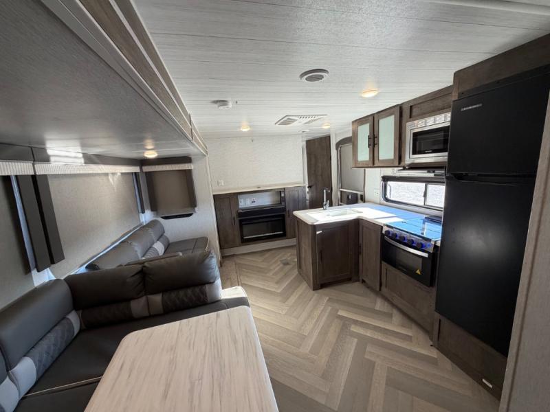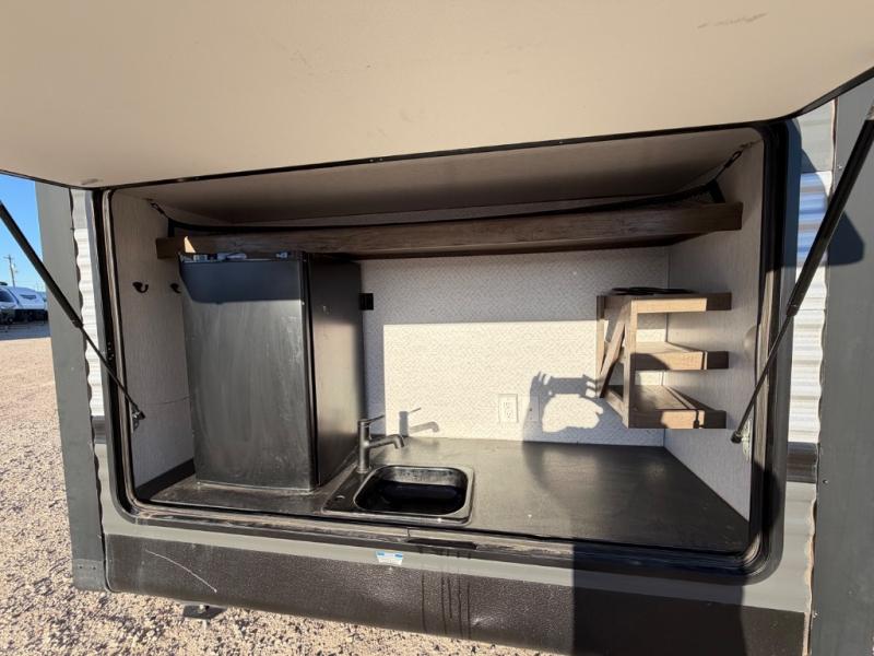 The rear private bunkhouse in this Salem travel trailer is super accommodating for your kids or your overnight guests! It has two opposing slides which provide extra floor space and a full-width closet/entertainment center which delivers extra space for backpacks and tennis shoes. The front private bedroom will be perfect for mom and dad with its queen bed and dual closets, and any additional guests can sleep on the Versa Lounge or U-shaped dinette. Everyone will enjoy their own space when it's time to freshen up in the full bath with a walk-in shower, and the chef of the group will have all the appliances needed to make meals each day. And don't forget about the outdoor kitchen for outdoor fun!