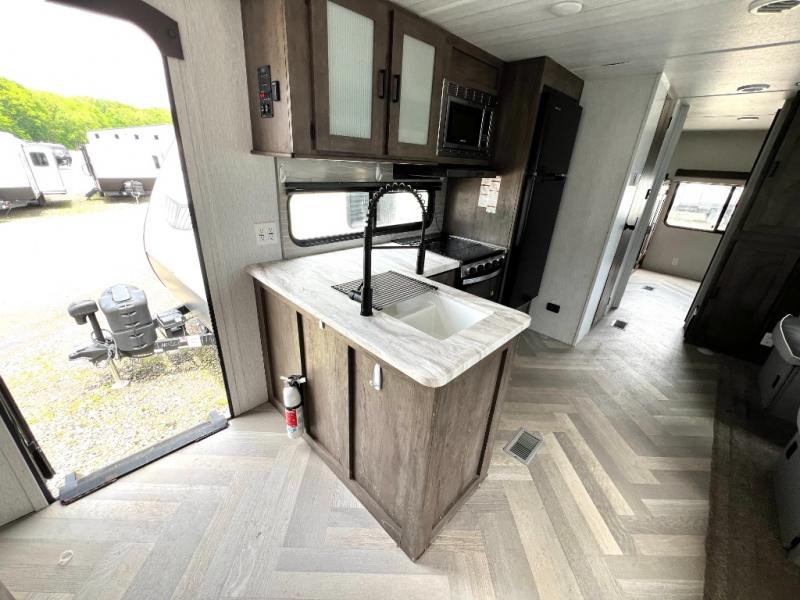 Do you need a break from the mundane camping life? If so, it's time to check out this exciting and full-featured Salem travel trailer! This unit provides two separated sleeping spaces, a rear private bunkhouse and a front private bedroom. Another feature that is just as helpful as the one in your own home is the kitchen. With an 11 cu. ft. frost free refrigerator, a three burner cooktop, a double sink, and abundant cabinet storage, you will be able to create delicious meals for the entire family. Plus, if you prefer to have a sunrise breakfast, you can simply take your preparations outside to the outdoor kitchen!