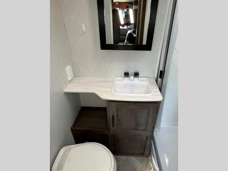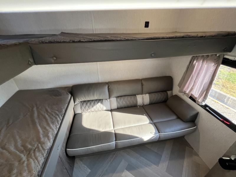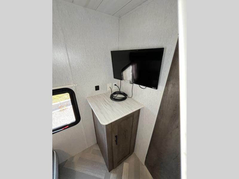 This versatile bunkhouse travel trailer is big enough for the whole family, but still light in weight by weighing in at 6,000 lbs.! The private bunkhouse has a set of 30" x 74" bunk beds and a 30" x 74" bunk bed above a Jiffy sofa. Just outside the bunkhouse is a pantry big enough to store everyone's favorite snacks, and the full bathroom with a walk-in shower. The three burner cooktop is just waiting for you to create a delicious meal, and the U-shaped dinette welcomes you to enjoy your meal in comfort, plus there is a large panoramic window for you to look out at your beautiful scenery. After you have stuffed yourself full, you can head to the Versa-lounge and relax by the fireplace at the entertainment center. The exterior has a pass-through storage area for you to keep your outdoor camping gear, a 16' power awning to protect you, and an exterior camp kitchen!