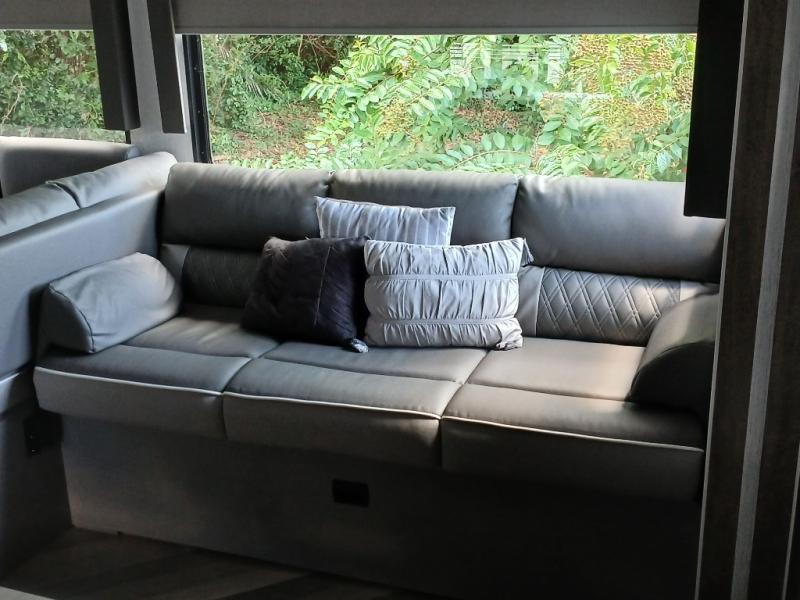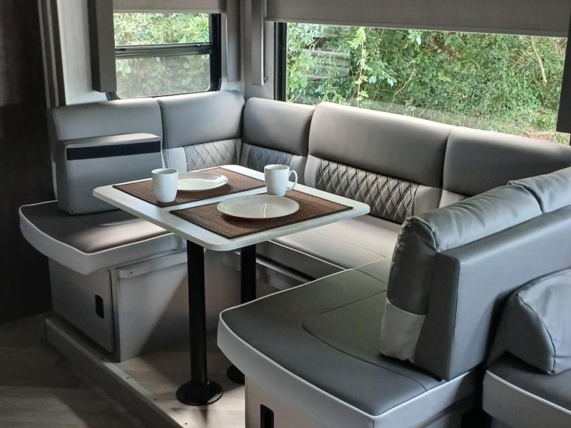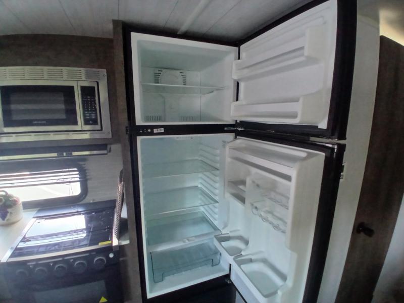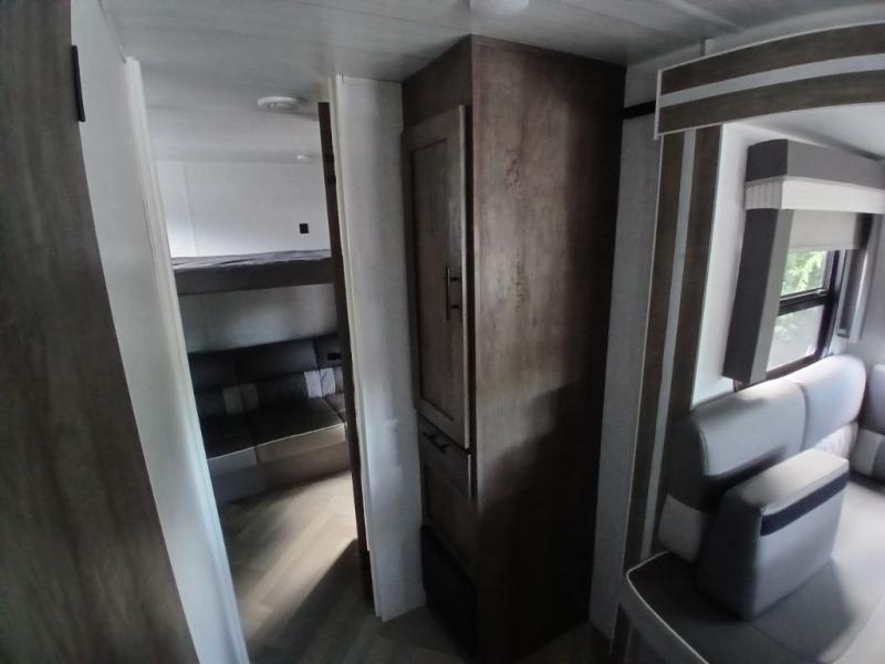 This versatile bunkhouse travel trailer is big enough for the whole family, but still light in weight by weighing in at 6,000 lbs.! The private bunkhouse has a set of 30" x 74" bunk beds and a 30" x 74" bunk bed above a Jiffy sofa. Just outside the bunkhouse is a pantry big enough to store everyone's favorite snacks, and the full bathroom with a walk-in shower. The three burner cooktop is just waiting for you to create a delicious meal, and the U-shaped dinette welcomes you to enjoy your meal in comfort, plus there is a large panoramic window for you to look out at your beautiful scenery. After you have stuffed yourself full, you can head to the Versa-lounge and relax by the fireplace at the entertainment center. The exterior has a pass-through storage area for you to keep your outdoor camping gear, a 16' power awning to protect you, and an exterior camp kitchen!