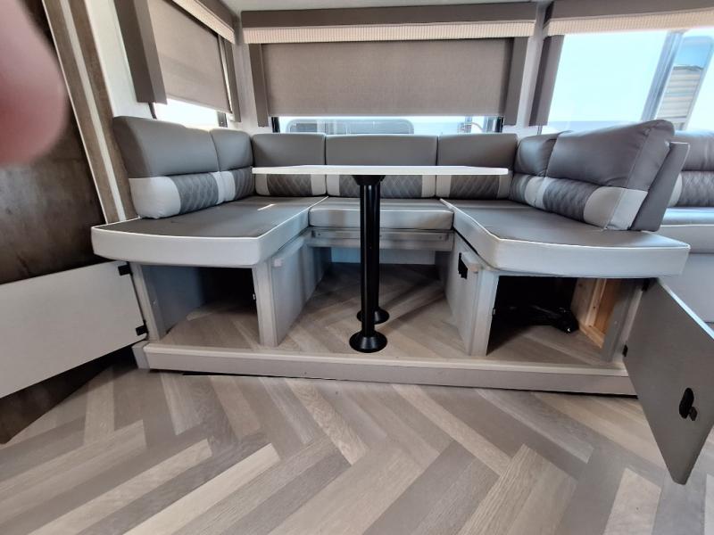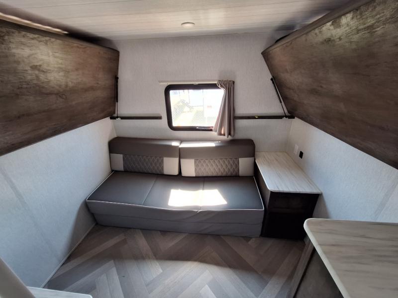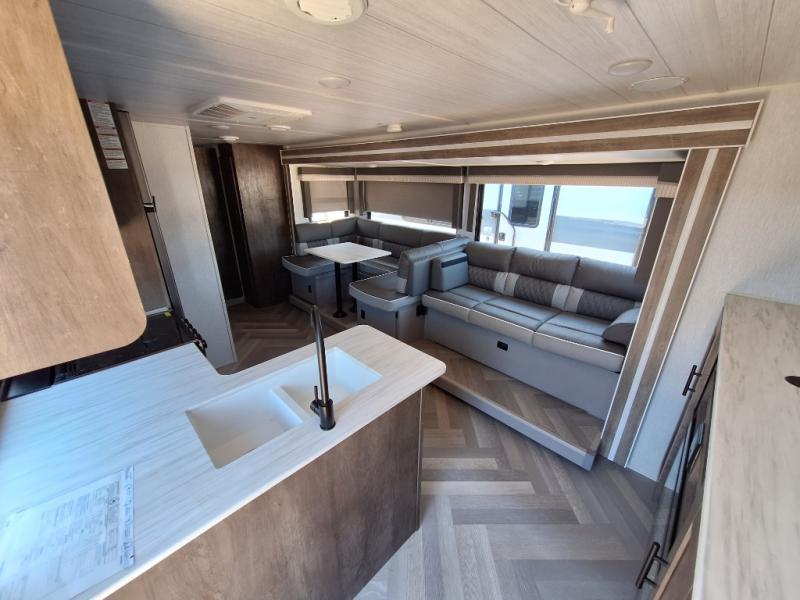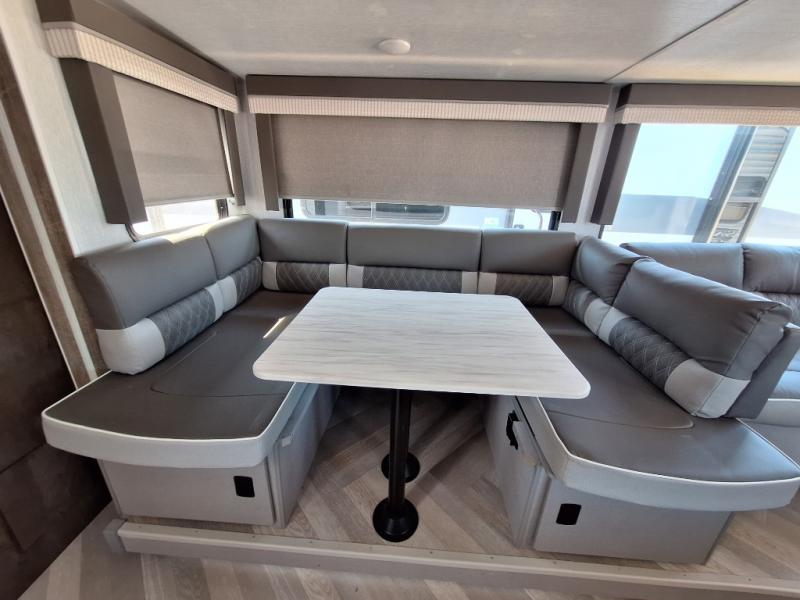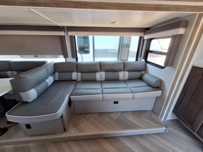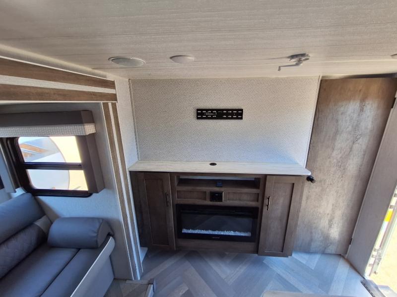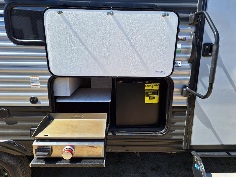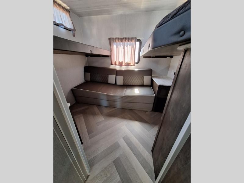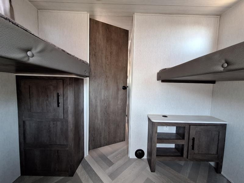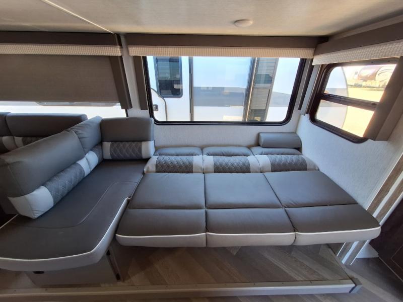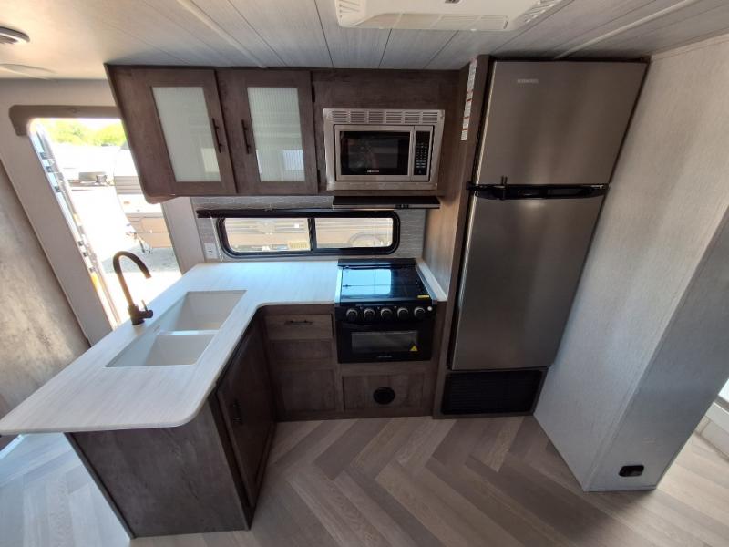 This travel trailer is new to the lineup and offers a large amount of versatility! The rear private bunkhouse has two 30" x 74" Versa-bunks and a Versa- queen bed so that more can join in on the camping fun. Start each morning feeling clean and fresh after showering in the walk-in shower with fiberglass surround then head to the front private bedroom to change. The kitchen has an oversized 11 cu. ft. refrigerator to keep your eggs fresh, a three burner cooktop to fry them up, and a U-shaped dinette to enjoy them at.