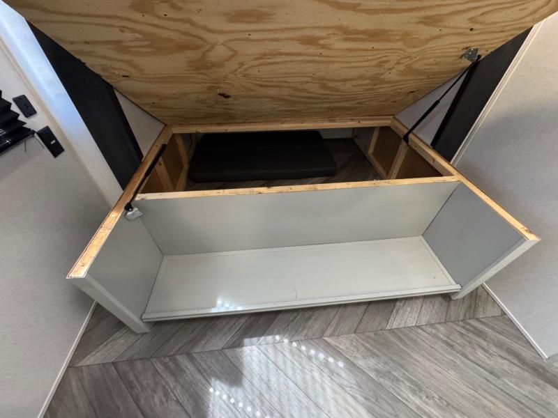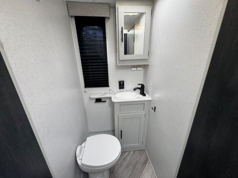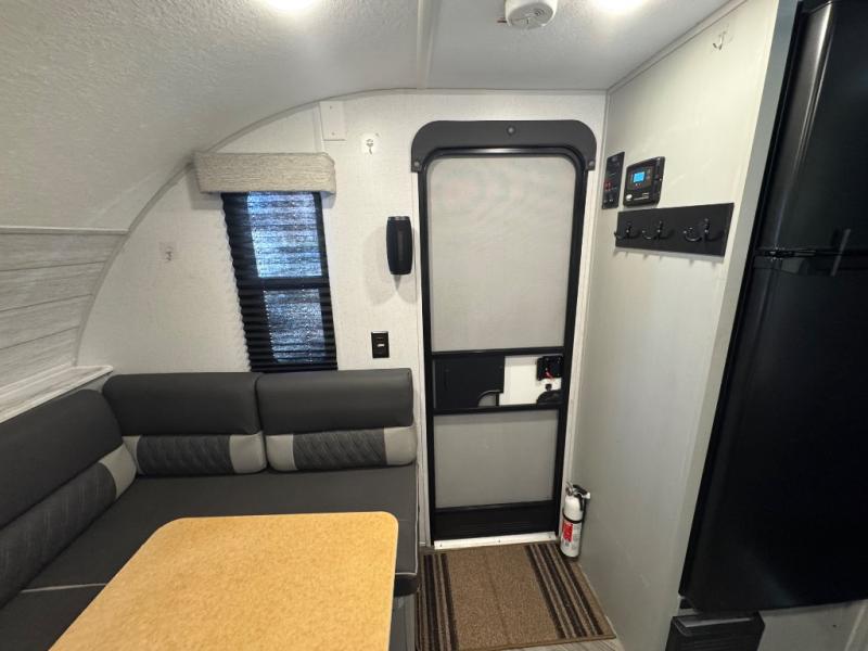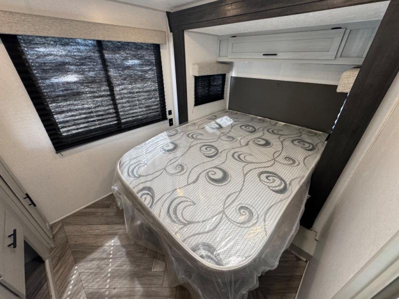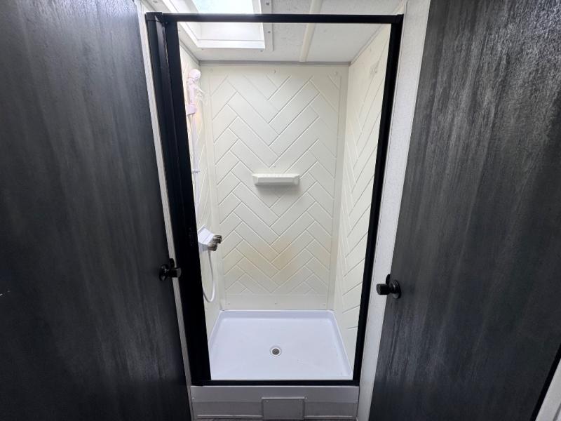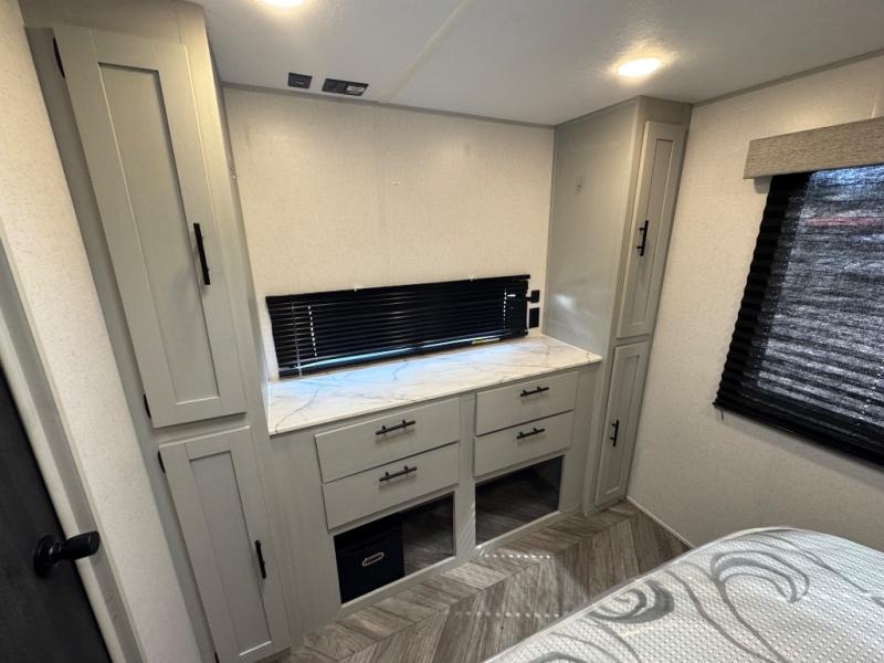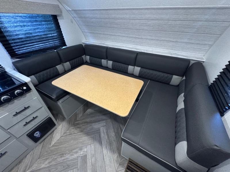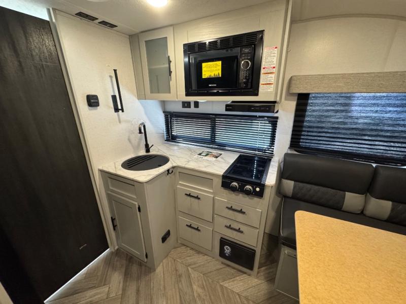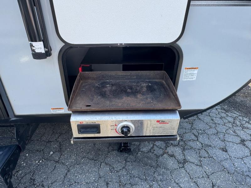 This travel trailer is perfect for couples who want to explore the great outdoors together! There is a rear private bedroom with a queen bed slide for more walking around space, a dresser with a TV location, and wardrobes on either side of it. Plus, it enters right into the separated bathroom which will come in handy when one person wants to freshen up in the 36" x 24" shower while another uses the private toilet and sink. You can prepare your best home cooked meals with the two burner cooktop then enjoy it at the front U-shaped dinette which can also transform into an extra sleeping space. Enjoy making pancakes on the outdoor LP Griddle under the 15' power awning!