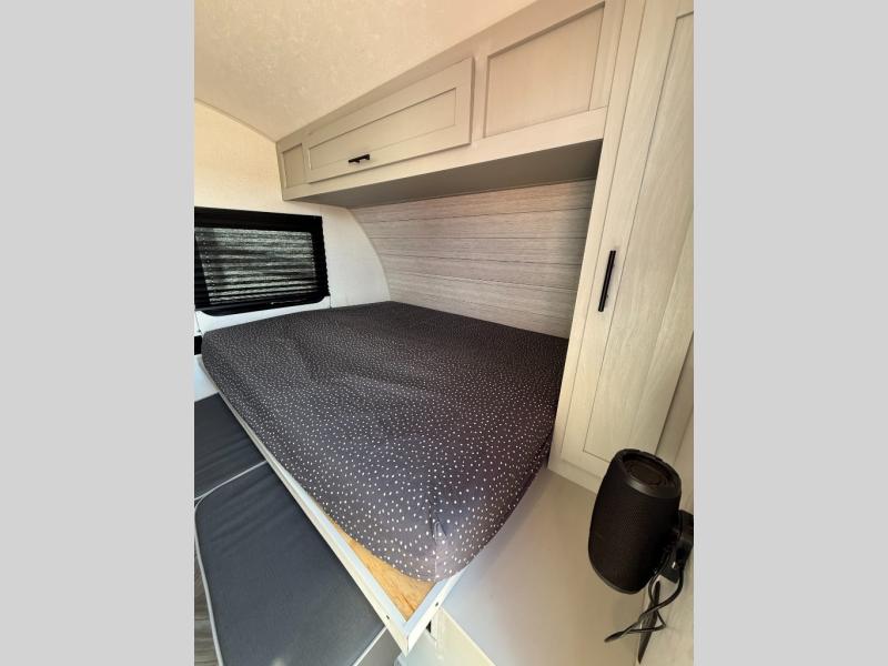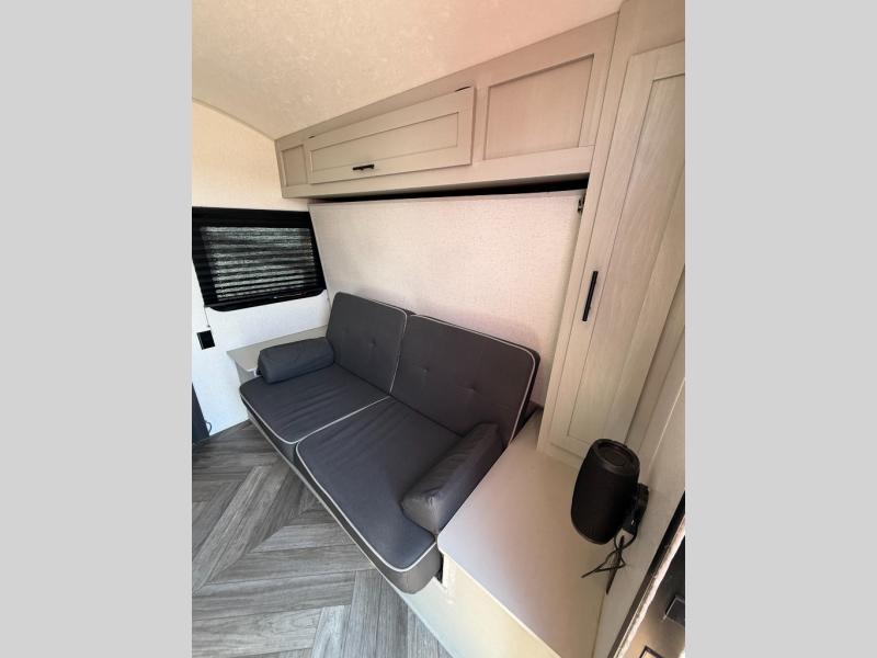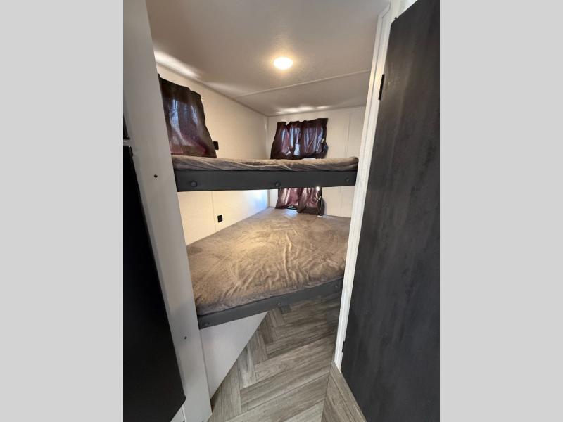 Start camping the right way in this travel trailer! It features a front Murphy bed that has a 60" x 74" queen bed to sleep on and a sofa with storage access to sit on during the day. The corner set of 48" x 72" double bunk beds come with storage to keep things out of the way and are conveniently next to the rear corner bathroom which has a 36" x 24" shower to freshen up in each morning. You can prepare your best home cooked meals indoors with the two burner cooktop or head to the outside LP griddle to fry up some burgers while breathing in some fresh air. Enjoy your meals, play card games, and even sleep at the U-shaped dinette slide. You will also appreciate the outside shower and the exterior front oversized door for storage access.