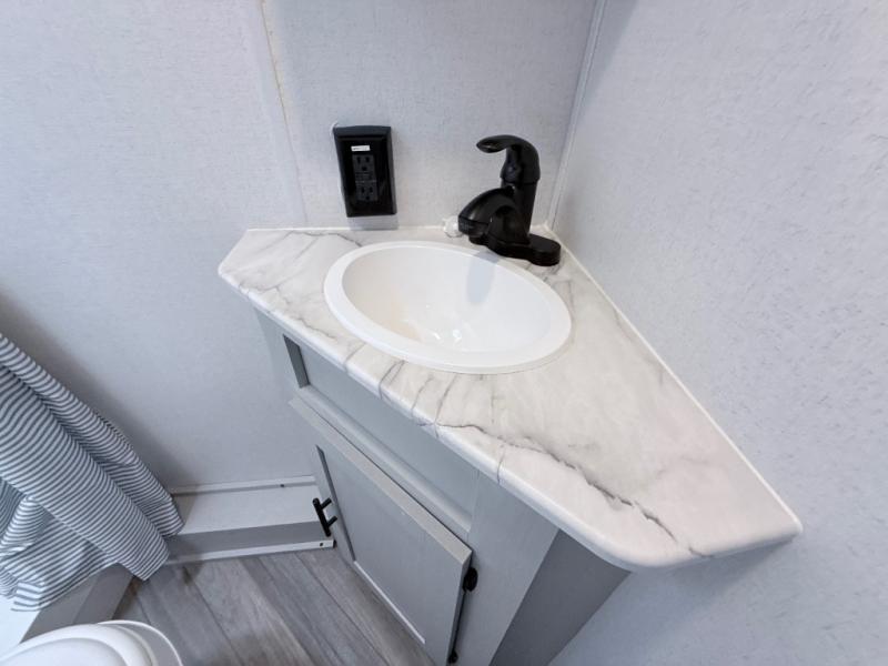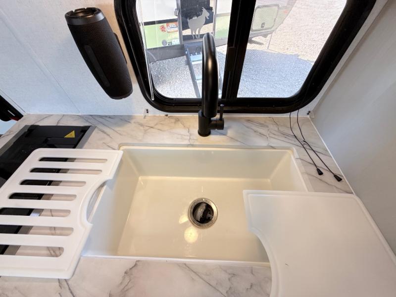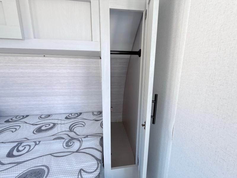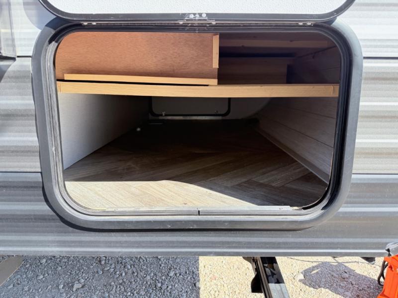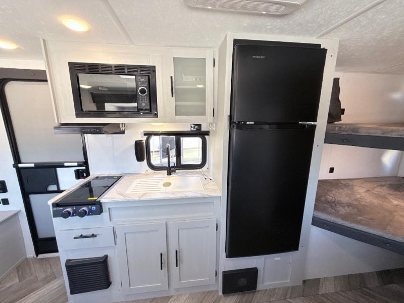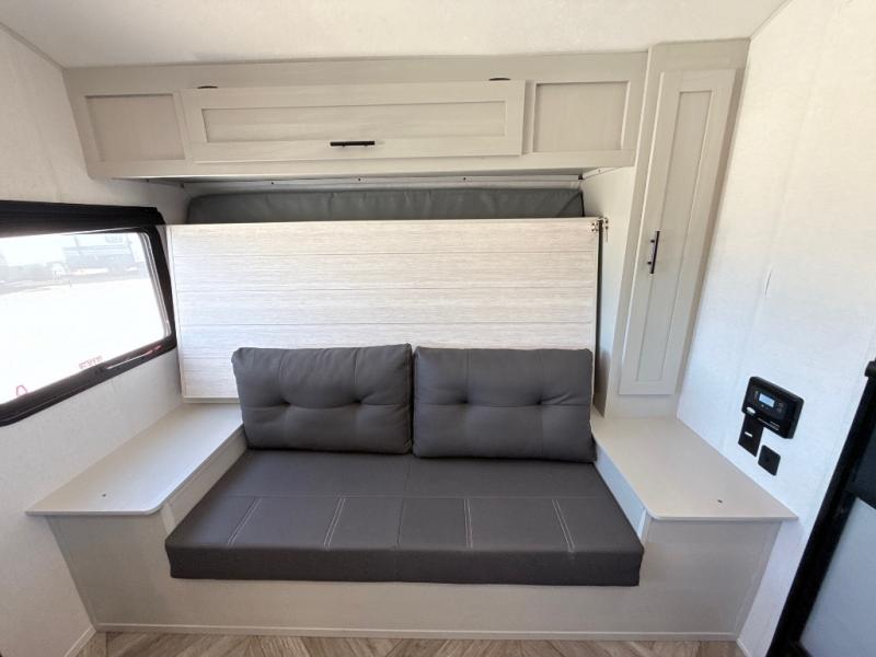 Start camping the right way in this travel trailer! It features a front Murphy bed that has a 60" x 74" queen bed to sleep on and a sofa with storage access to sit on during the day. The corner set of 48" x 72" double bunk beds come with storage to keep things out of the way and are conveniently next to the rear corner bathroom which has a 36" x 24" shower to freshen up in each morning. You can prepare your best home cooked meals indoors with the two burner cooktop or head to the outside LP griddle to fry up some burgers while breathing in some fresh air. Enjoy your meals, play card games, and even sleep at the U-shaped dinette slide. You will also appreciate the outside shower and the exterior front oversized door for storage access.