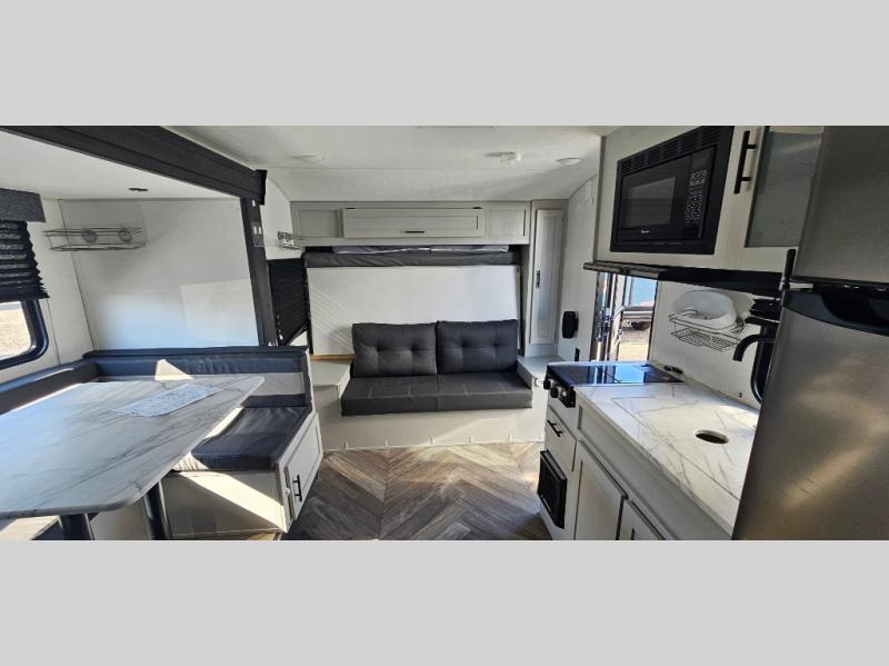 Start camping the right way in this travel trailer! It features a front Murphy bed that has a 60" x 74" queen bed to sleep on and a sofa with storage access to sit on during the day. The corner set of 48" x 72" double bunk beds come with storage to keep things out of the way and are conveniently next to the rear corner bathroom which has a 36" x 24" shower to freshen up in each morning. You can prepare your best home cooked meals indoors with the two burner cooktop or head to the outside LP griddle to fry up some burgers while breathing in some fresh air. Enjoy your meals, play card games, and even sleep at the U-shaped dinette slide. You will also appreciate the outside shower and the exterior front oversized door for storage access.