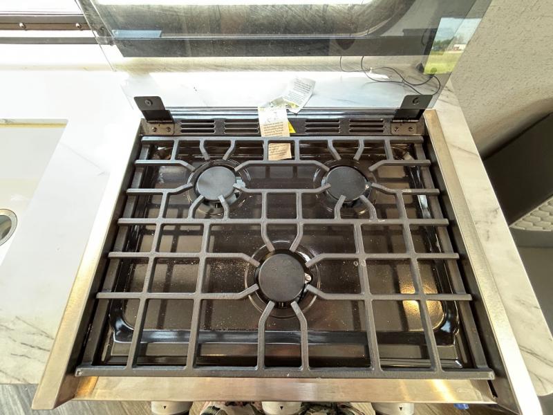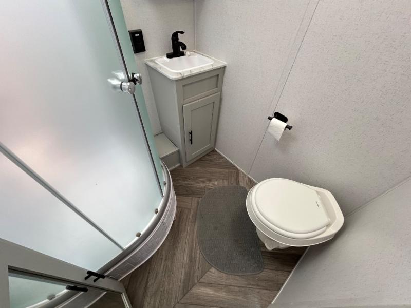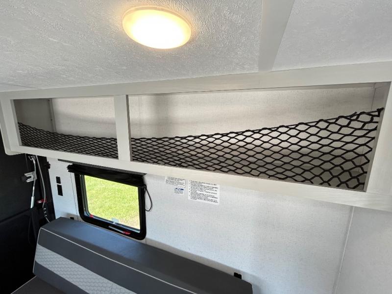 This toy hauler has everything you need for a fun family getaway! Load up your toys with the 3,000 lb. ramp door and secure them with the 1,500 lb. tie downs. Once you have reached your destination, you can set up the opposing 30" x 72" sofa sleepers with a table in between for eating your meals and playing games. The walk-in pantry and 11 cu. ft. frost free refrigerator are big enough to store everyone's favorite snacks too. Clean the mud out of your hair in the full bathroom with the neo-angled shower with a skylight for added natural lighting. When you're ready to wind down your nights, head to the front private bedroom and sleep on the 60" x 74" queen bed with wardrobes and USB chargers on either side of it!