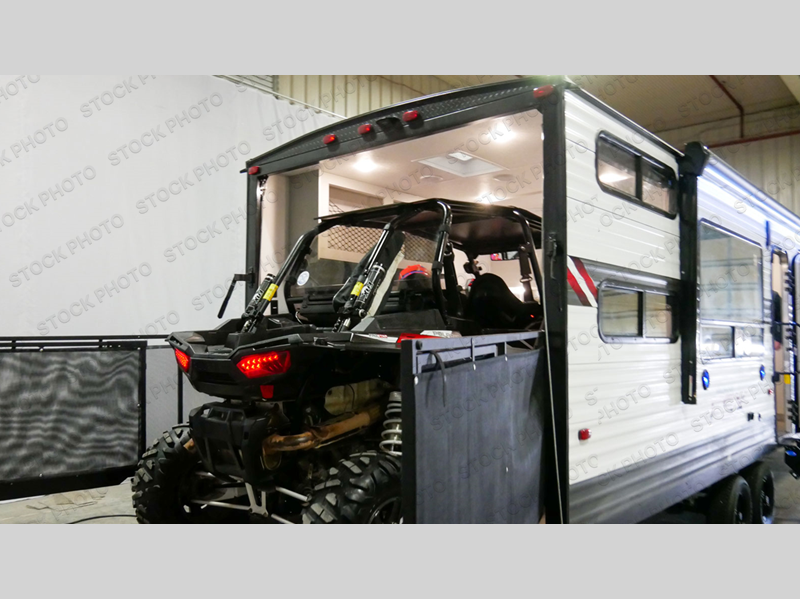 Make the most of your vacations with this MAX toy hauler! The 14' garage area not only has 1,500 lb. tie downs to secure your toys and opposing 30" x 72" sofa sleepers with a table in between, but also an optional stow n load quad bunk system for even more sleeping spaces. Enjoy the fireplace for a cozy evening indoors while your dinner is cooking on the three burner cooktop or being heated up in the microwave. After a fun day of trail riding, you can clean the mud out of your hair with the 30" x 36" shower with a skylight in the full bathroom. The front private bedroom has a queen bed to lay your head on at night, shoe storage under the bed, a walk-in closet, and wardrobes on either side of the bed for even more clothing storage space.