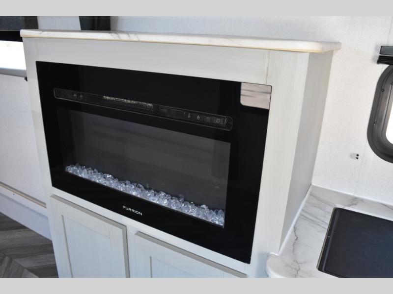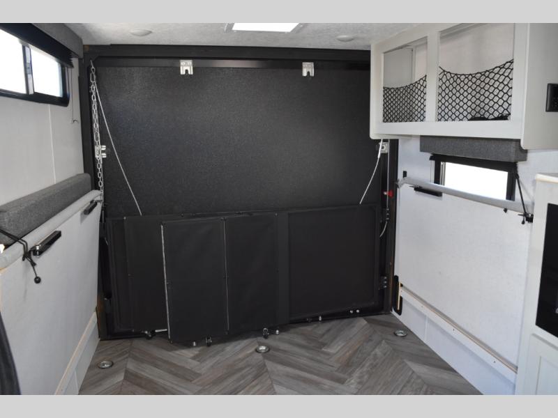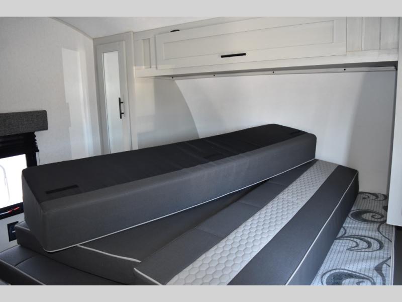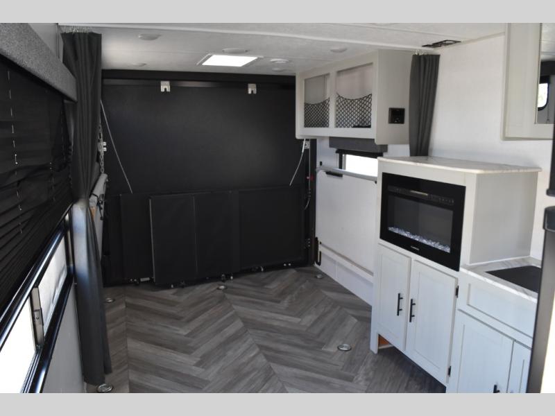 Make the most of your vacations with this MAX toy hauler! The 14' garage area not only has 1,500 lb. tie downs to secure your toys and opposing 30" x 72" sofa sleepers with a table in between, but also an optional stow n load quad bunk system for even more sleeping spaces. Enjoy the fireplace for a cozy evening indoors while your dinner is cooking on the three burner cooktop or being heated up in the microwave. After a fun day of trail riding, you can clean the mud out of your hair with the 30" x 36" shower with a skylight in the full bathroom. The front private bedroom has a queen bed to lay your head on at night, shoe storage under the bed, a walk-in closet, and wardrobes on either side of the bed for even more clothing storage space.