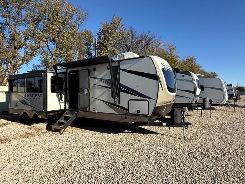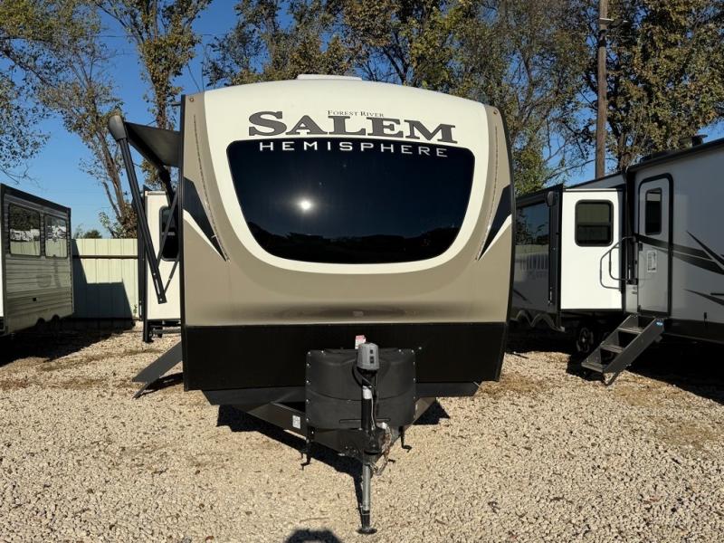 FREE DELIVERY & SETUP!!THIS BEAUTIFUL LIKE NEW 2022 FOREST RIVER SALEM HEMISPHERE 271RL IS A RV LOADED WITH LUXURY!! 34 LONG. 3 SLIDES. XL REAR LIVING WITH KING MASTER SUITE. BEAUTIFUL BATHROOM & CLOSET. LARGE LIVING AREA WITH THEATER SEATING & UPGRADED SLEEPER SOFAS. ELECTRIC FIREPLACE & BIG FLAT SCREEN TV. BEAUTIFUL ISLAND KITCHEN with residential refrigerator, STAINLESS STEEL APPLIANCES, and LOTS OF CABINET STORAGE.FULLY ENCLOSED & HEATED UNDERBELLY. 4 SEASONS PACKAGE WITH UPGRADED INSULATION. DESIGNED FOR YEAR-ROUND COMFORT IN HOT OR COLD CLIMATES. KING SATELLITE.2 COLD A/C UNITS. 50AMP POWER. AUTO-LEVELING SYSTEM. HUGE BASEMENT STORAGE SOLID STEP ENTRY. DUAL AWNINGS WITH LED LIGHTS. LUXURY FEEL THROUGHOUT!!, OUTDOOR STORAGE. UVW 8268. FACTORY SOLAR. OUR PRICE: $29,995. WE HAVE MULTIPLE HIGH-END FIFTH WHEELS TO CHOOSE FROM!!We are located in KENNEDALE, TX. We show RVs 7 DAYS A WEEK BY APPOINTMENT. Call BRET 8178050067 or AMY 8176584633. FREE DELIVERY TO ALL 48 STATES.WE INSPECT & GO THROUGH ALL TRAILERS TO ENSURE OUR CUSTOMERS ARE 100% SATISFIED.¡SE HABLA ESPAÑOL!