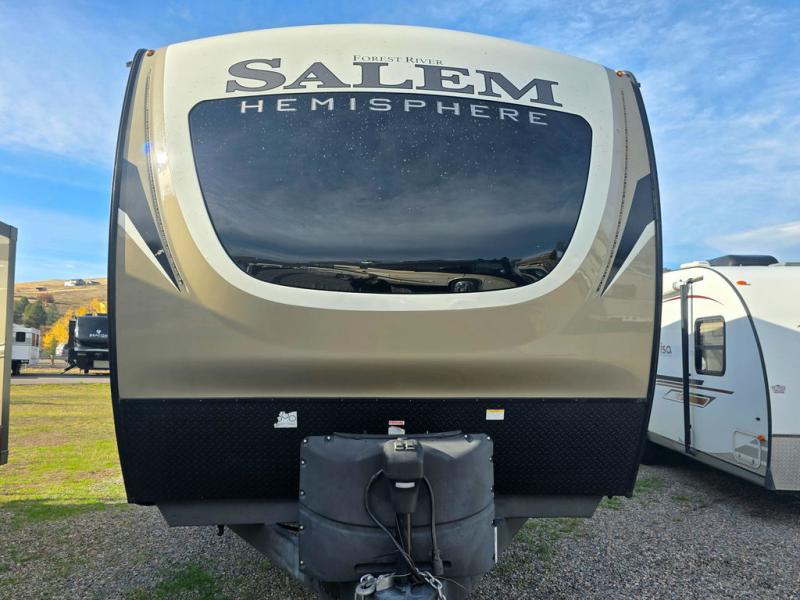 With each Forest River Salem Hemisphere fifth wheel and travel trailer, there are vacuum bonded "Aluma frame" sidewalls and floors, heated and enclosed dump valves and an underbelly, plus an Ivory performance colored exterior fiberglass with Smoked Quartz Metallic accents. A few other features you will love are the 7-way "rain defense" plug holder in the front frame, the extra large pass-through storage, the Hudson Wood agreeable grain cabinetry, and the designer's choice Herringbone Shaw flooring for style and easy clean up!