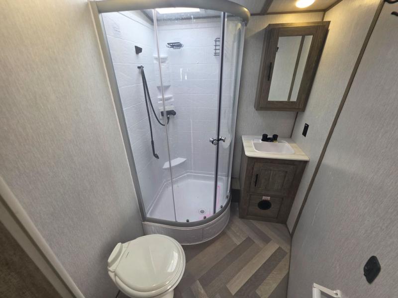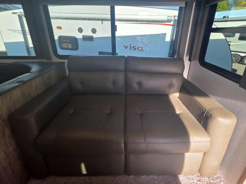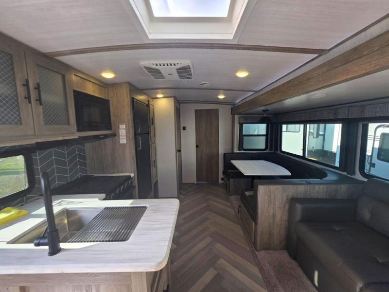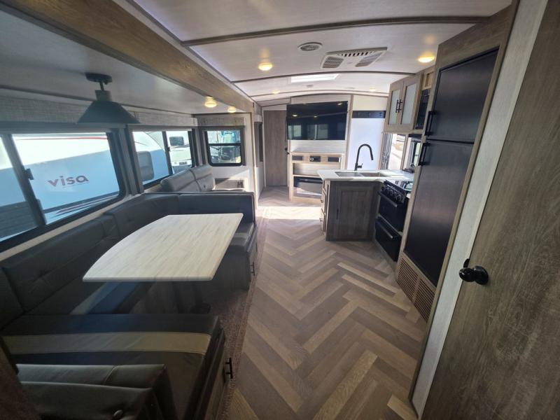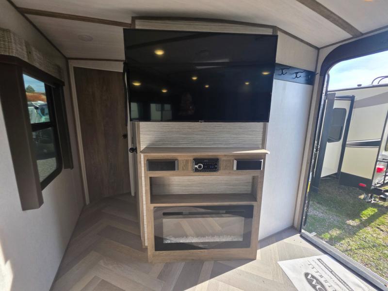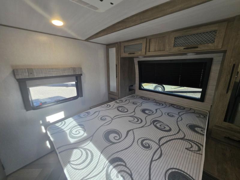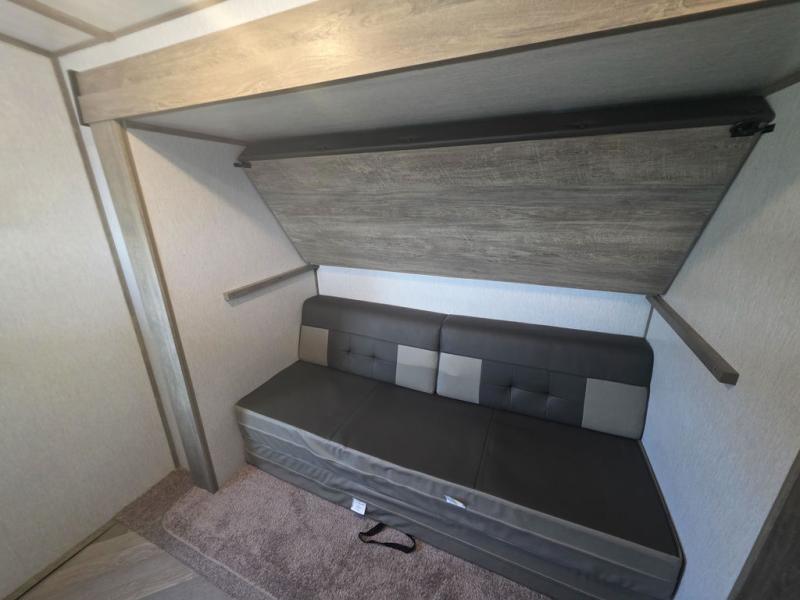 You won't believe all of the luxury features this travel trailer, including double entry doors, a U-shaped dinette, and panoramic windows in the slide out! The chef of your group will love cooking indoors with full amenities, and outdoors with the outside kitchen/bar so they can breathe in some fresh air while they sip on their favorite drink. The kids or your friends will love having their own private bunkhouse with a bunk above an entertainment center with storage below, and another bunk above a Versa queen convertible bed/sofa, and you will love resting on the queen bed in the front private bedroom. There is also a Texas-sized pass-through storage area big enough for your camping gear too!