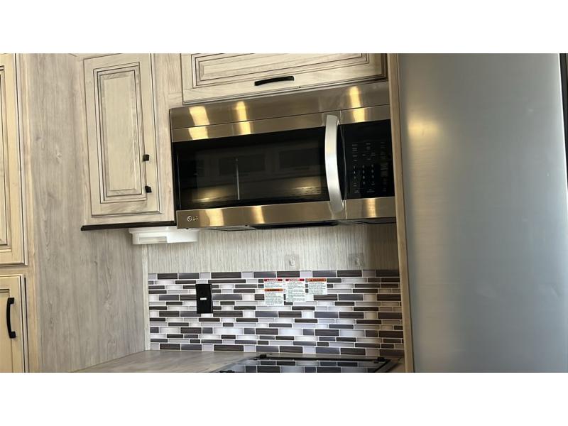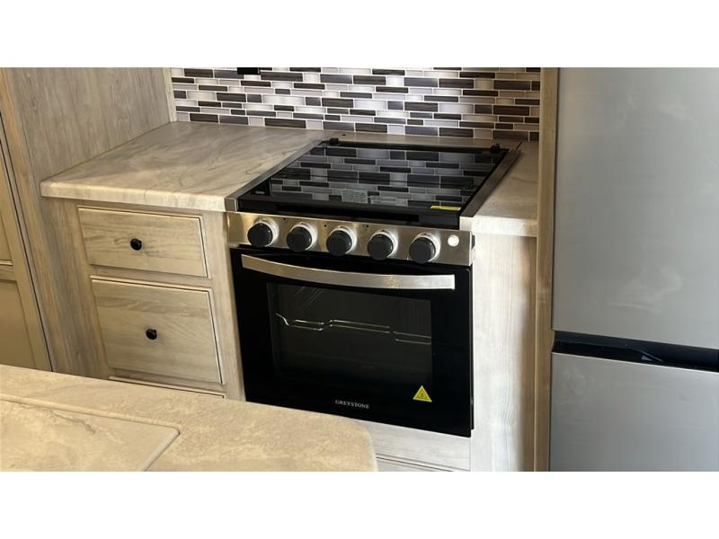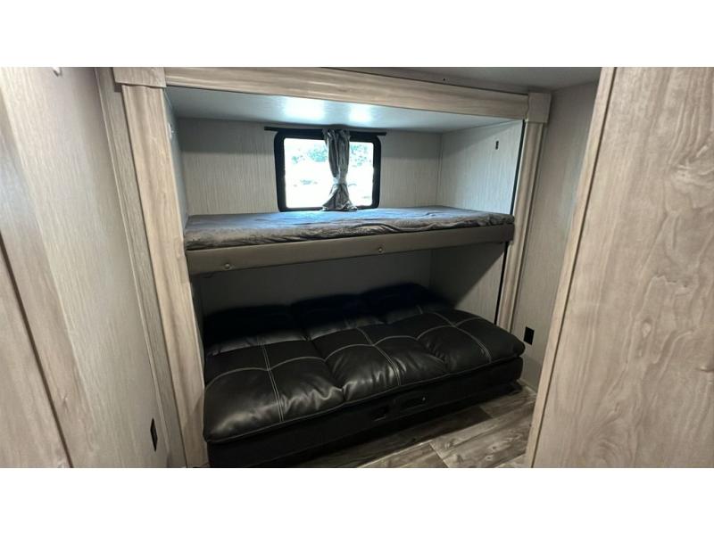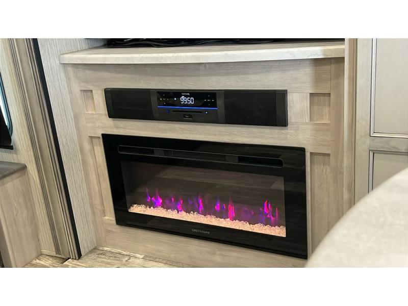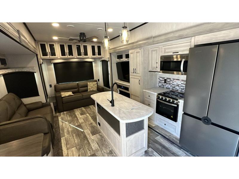 The whole family will love camping in this fifth wheel! It features a front private bedroom with a queen bed to lay your head at night and a second bedroom with a bunk above a glide sofa, a TV cabinet, a wardrobe, and a loft above it all for extra sleeping or storage space. The chef will enjoy cooking with the kitchen island, the four burner cooktop, and two pantries to store canned goods and snacks, plus there is an outside bumper mount swivel gas grill to fry burgers. The rear living area offers a comfortable place to relax at night on one of the two tri-fold hide-a-bed sofas while watching a movie on the 50" flat screen TV with a fireplace below it and cabinets on either side to store your movies.