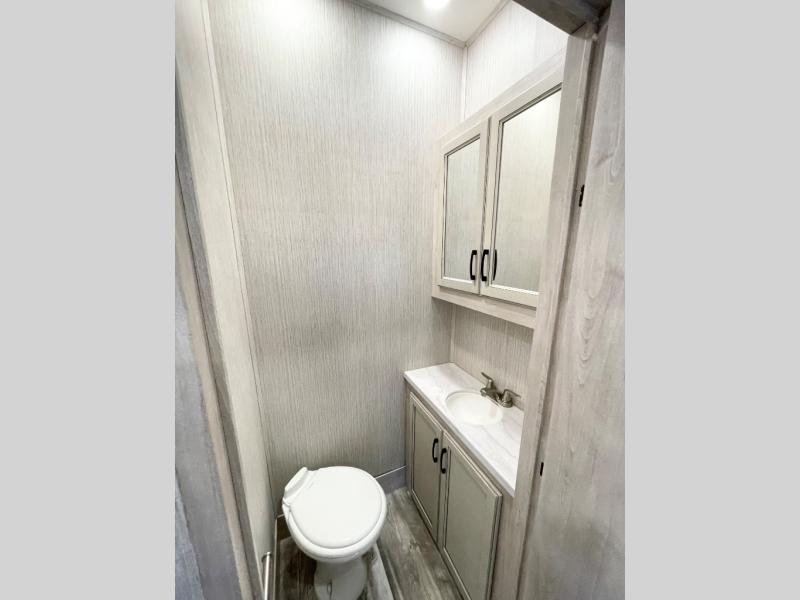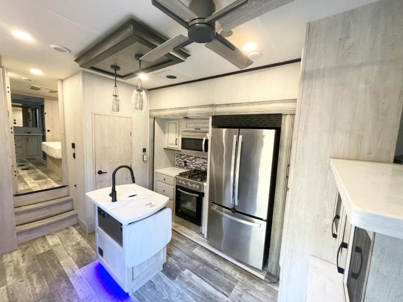 No vacation plan is complete without this Sandpiper Luxury fifth wheel! The master suite is the star of the show with its king bed slide and full bathroom with dual-sink vanity. There is another aspect of this unit that will also grab your attention, and that is the front separate living room. This room features a front entertainment center with fireplace and 50" flat screen LED HDTV, two opposing tri-fold hide-a-bed sofas, and theater seating. All of this makes the living room a perfect place to sit down with friends, and the sofas allow you to offer your friends a sleeping space if they choose to spend the night. The kitchen is centrally located, and it contains the half bathroom. As you work up a sweat cooking dinner on the four-burner range, you'll be able to switch on the ceiling fan to cool down, and you'll be able to store practically anything in the 22-cubic foot residential refrigerator.
