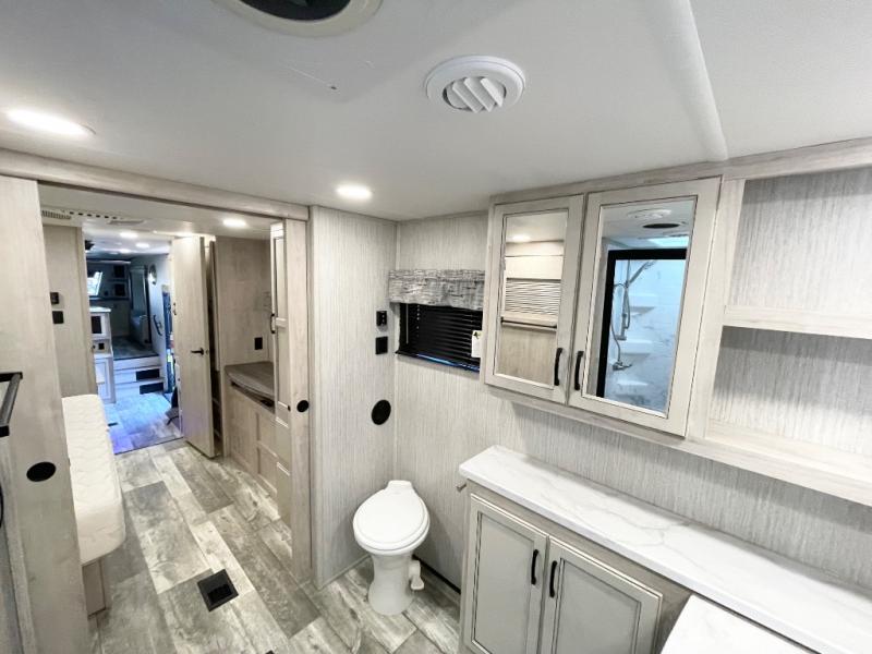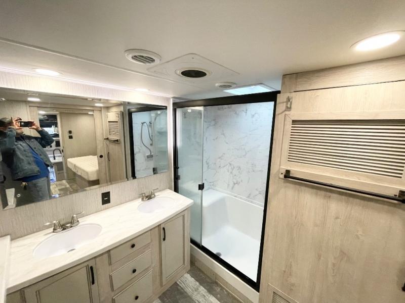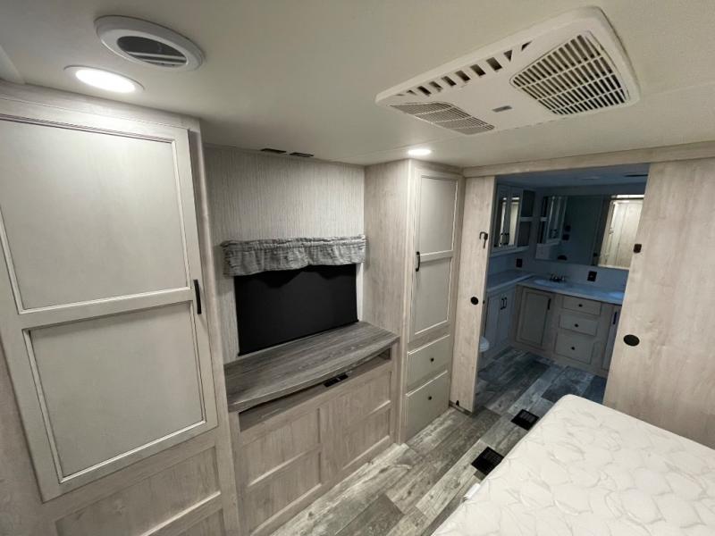 When a brand claims to be luxurious, you expect true luxury, and the Forest River Sandpiper Luxury fifth wheel delivers! The list of included features is outstanding, and the construction itself is top notch. Everything comes together on a welded aluminum-framed, vacuum-bonded laminated superstructure and a cambered powder-coated frame with rust prohibitor. There is a fully enclosed, heated underbelly and an unobstructed drop-frame pass-through storage area with cable jacks and 110V outlet. Two LED-lit exterior speakers add some fun to the outside, and the docking station includes easy winterization, hot and cold spray port, black tank flush, and pull valves for tanks. But the true luxury is found inside with the 84" interior height, residential countertops, recessed residential lighting, extra-large picture windows, LED-lit headboard, and premium sound bar with built-in flush-mount DVD player. Each unit has also been prepped for a washer/dryer so that you can extend every trip and make your Sandpiper Luxury feel more like home.