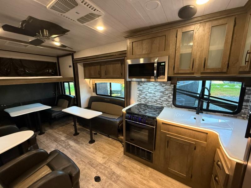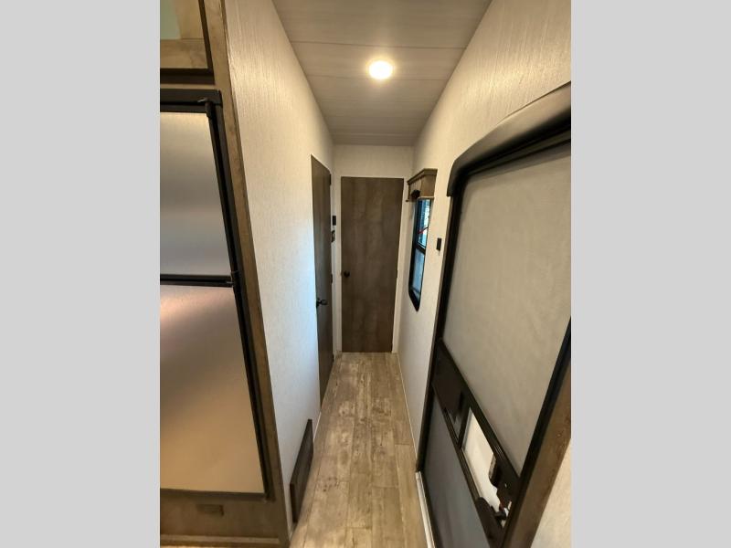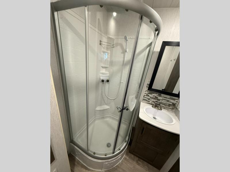Unload your kayaks from the 15' 11" cargo space, then take a load off on the two chairs with a table. The kids or your friends may want to play a game on the electric pass-through dinette or take a rest on the electric bed. There is also a sofa slide that is standard in glass or optional in metal if you choose. The dual entry bath allows your guests easy entrance from the hallway and you will have your own private entrance from the master bedroom. This model includes plenty of storage space, including overhead compartments inside and exterior storage for your larger camp gear!