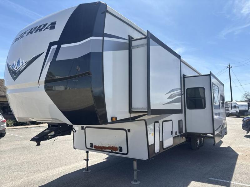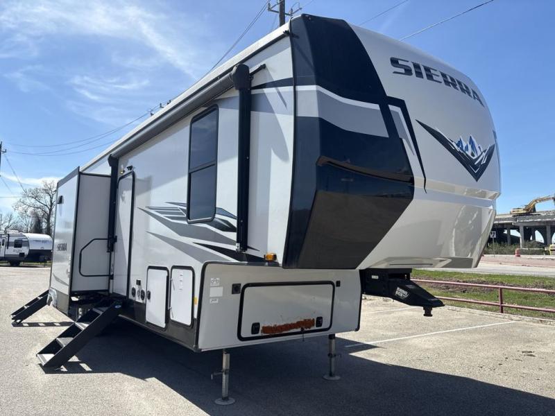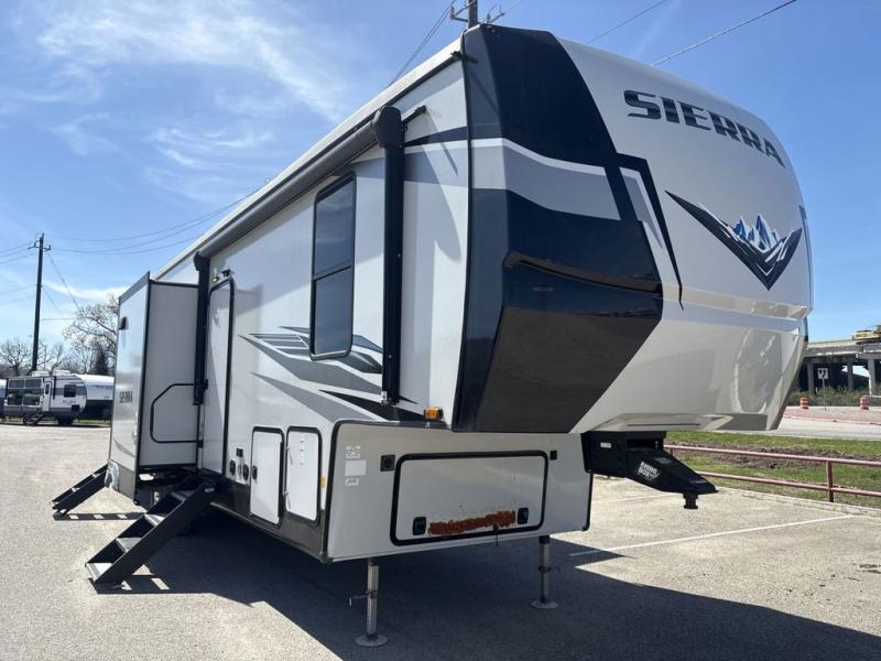 Each one of these Forest River Sierra fifth wheels are equipped with everything you need to make the most of each adventure! The underbelly armor will protect your unit's vitals from road debris and the painted two tone aerodynamic fiberglass front cap has an improved turning radius to make them easier to navigate. With an electric level up system, you can set your unit up quick and easy then get to having fun faster than ever. The welded aluminum framed, vacuum bonded laminated superstructure will hold up through every adventure and the cambered powder coated frame comes with rust prohibitor to last longer. The standard Signature package comes with upgraded features like a stainless appliance package, a premium sound bar with DVD player, and slam lock baggage doors to keep your gear in place as you travel. Come find your favorite one today!