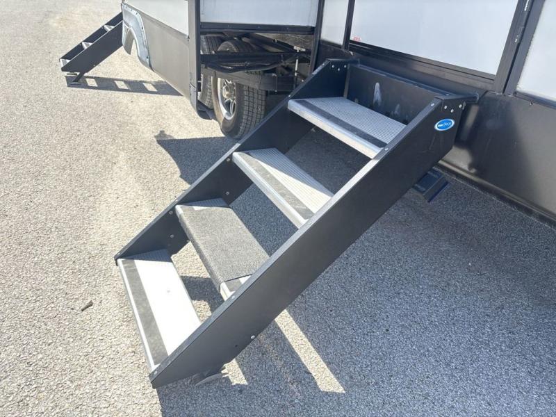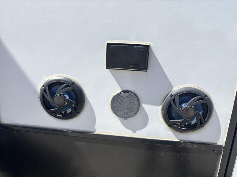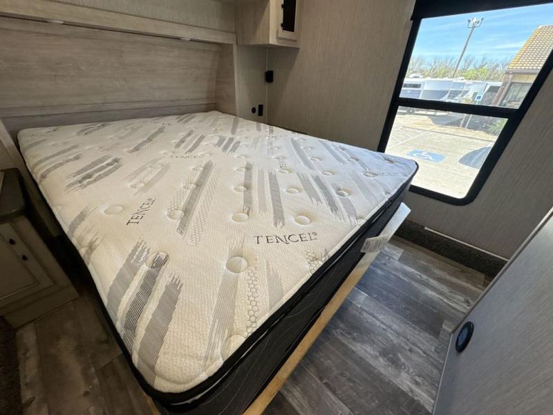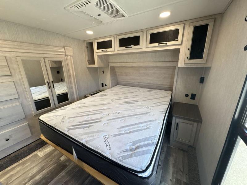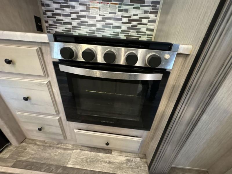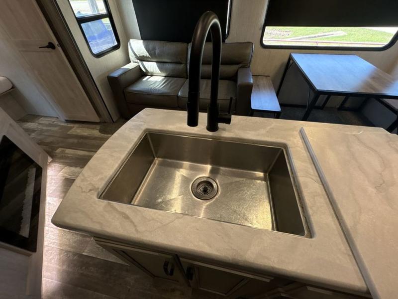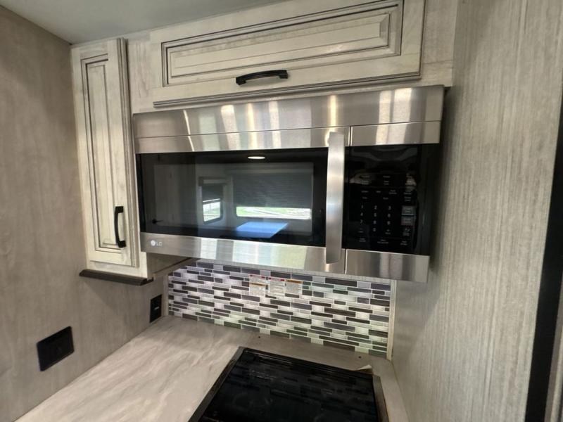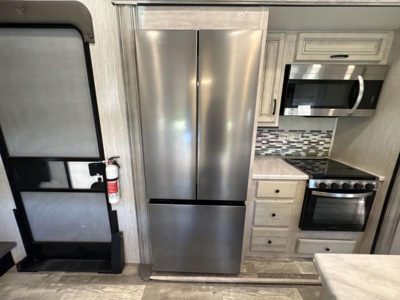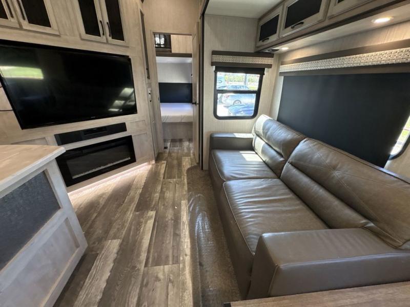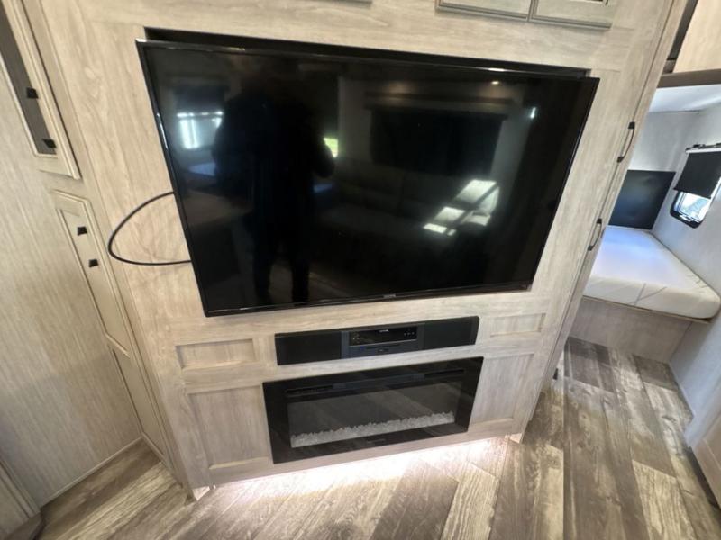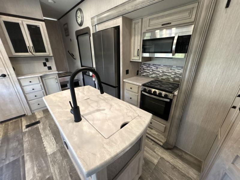 You won't believe all that this fifth wheel has to offer! If you enjoy a morning cup of coffee then you will appreciate the coffee bar area and the comfortable booth dinette or tri-fold hide-a-bed sofa to enjoy it at. The kitchen island will make your meal prepping easier and you can cook more at one time with the four burner cooktop, plus the entertainment center nearby has a fireplace for a cozy ambiance. The rear private bedroom has a unique 54" x 74" loft bed above a 60" x 74" queen bed and a half bathroom with one of the dual entry doors to the unit. There is also a front private bedroom with a queen bed that has nightstands on either side, a wardrobe/linen closet slide, and an entrance into the dual entry bathroom. You even have an outside bumper mount swivel gas grill to grill the catch of the day!