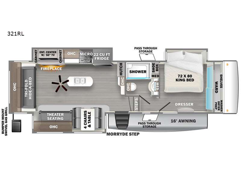 There are many comforts provided in this Sierra Luxury fifth wheel! The first thing you'll notice is the open living space made possible by two opposing slides. There is also more space in the private bedroom because of the king bed slide. The living area will also remain cool with a fresh breeze coming from the ceiling fan, and you'll have lots of seating space with the tri-fold hide-a-bed sofa, theater seating, and free-standing table with chairs. The kitchen island helps you prep meals or serve appetizers, and the four-burner range is an amazing amenity that helps you make dinner in a snap. You have a hutch to store your dishes and a fireplace to stay warm in the cooler months.