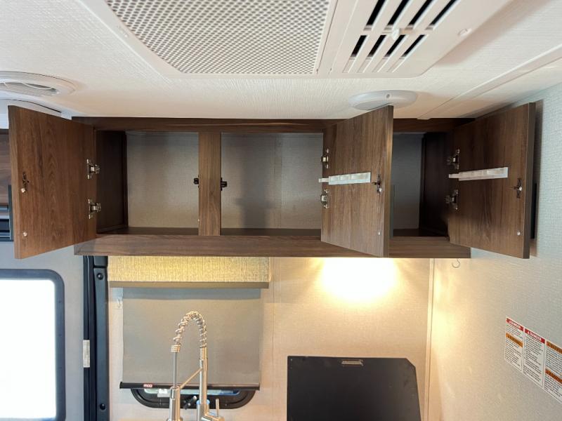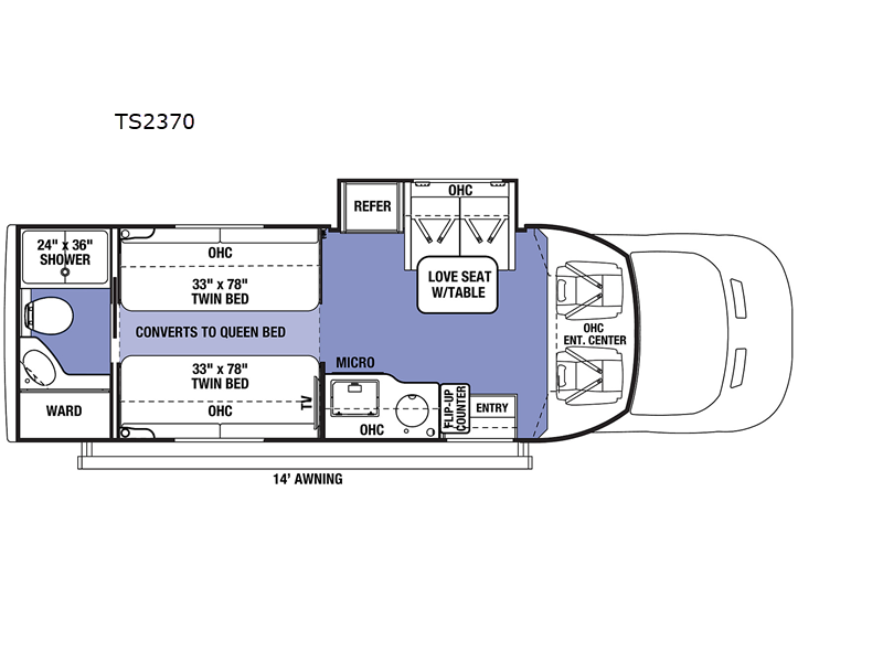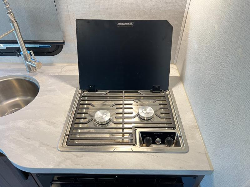 Trips across country or state are made comfortable in this motorhome for two. The twin beds convert to a queen-size bed so you can set up your sleeping arrangements what works for you. The full rear bath includes a 24" x 36" shower and a wardrobe to store clean towels, and you'll find plenty of overhead compartments for all your belongings. Each morning you can prepare breakfast on the two burner range, or use the convenient convection microwave. There is a 5.3 cu. ft. Eurostyle refrigerator that operates on 12V/110V/LP for convenience, plus the flip-up counter will provide more prep space!