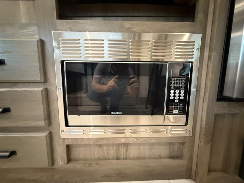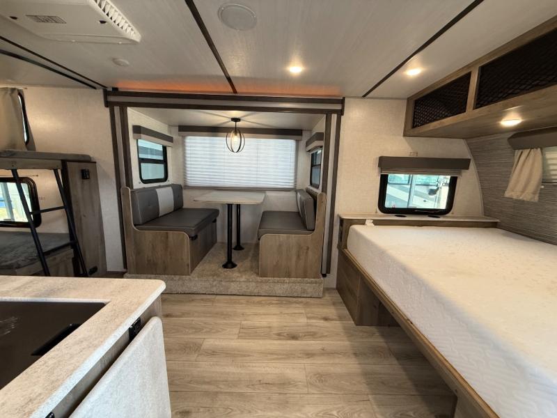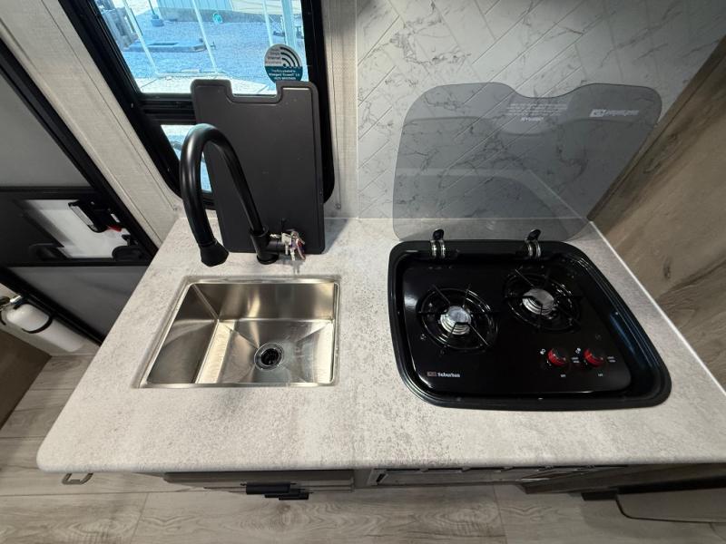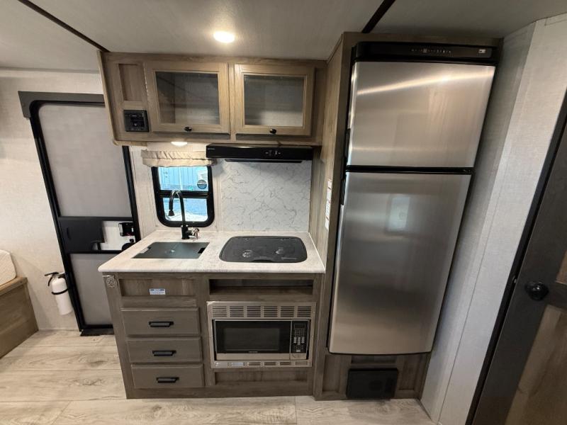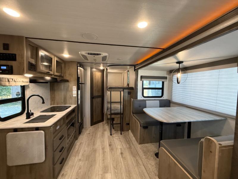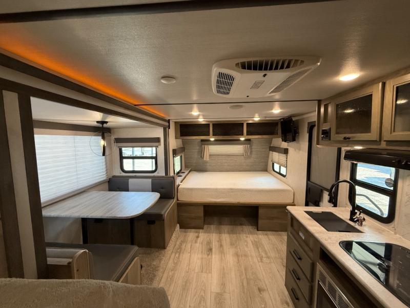 Bring along family or friends in this travel trailer that can sleep up to six people each night. The dinette slide will provide the chef space to cook on the two burner cooktop, or they may just head outdoors to cook on the outside kitchen. There is also an outdoor shelf here and a spray port for your convenience. The true queen-size bed up front is sure to provide a great night's rest, plus there is a "Stargazer" front window that will allow natural light in and beautiful starry nights.