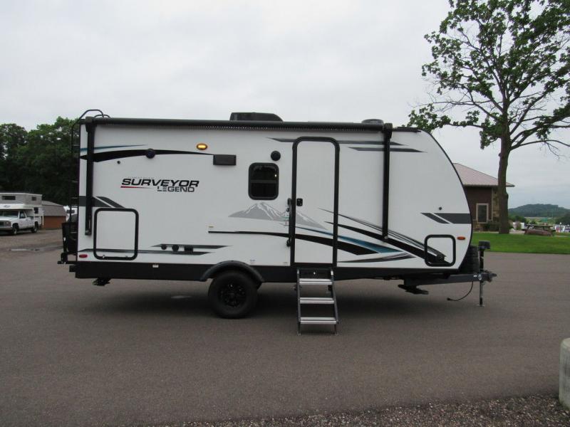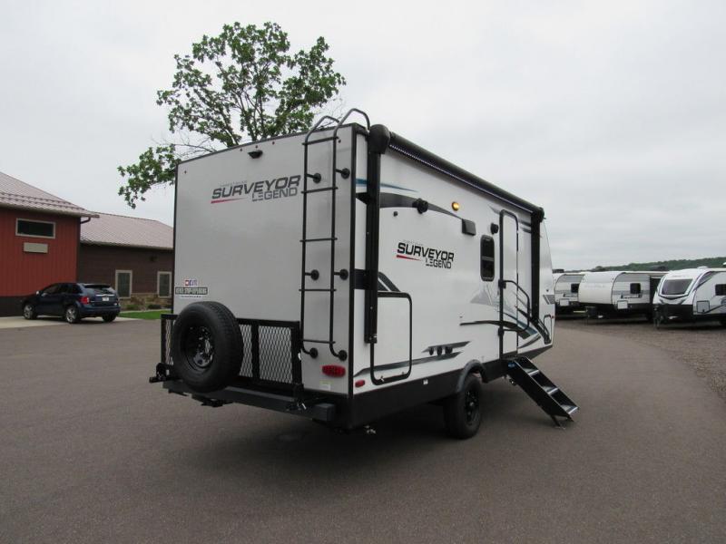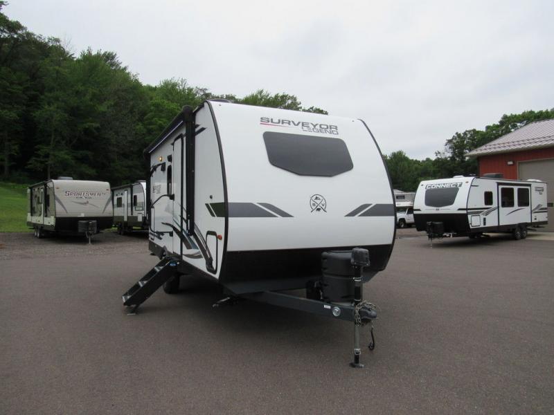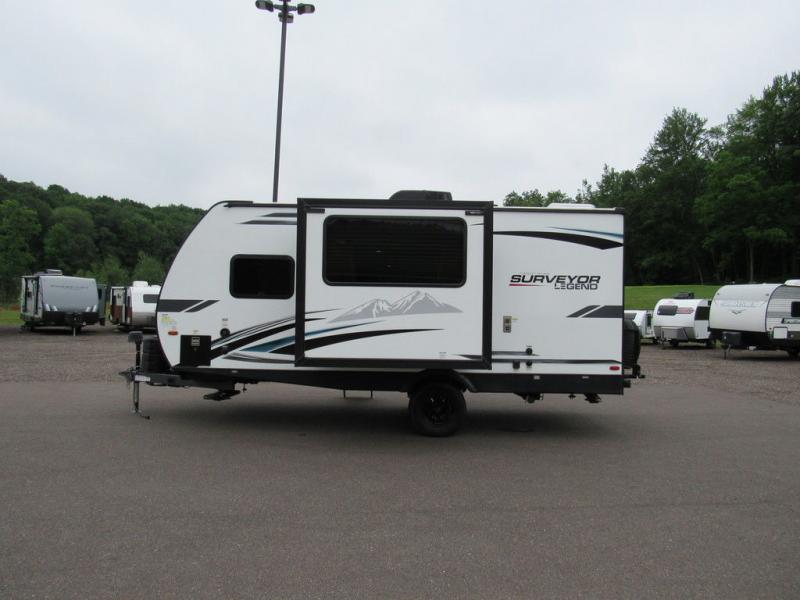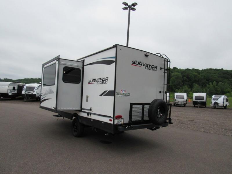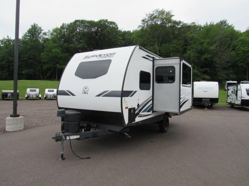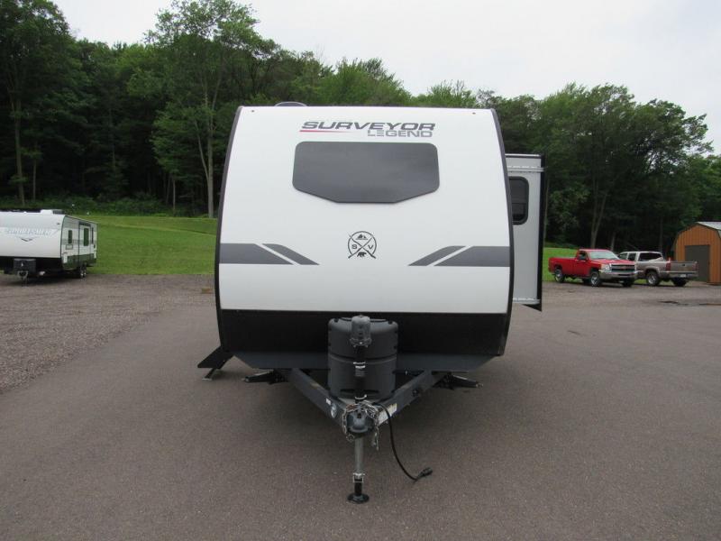 With any Surveyor Legend travel trailer by Forest River you will enjoy quality craftsmanship, convenient amenities, and at-home comforts. The Azdel composite panels provide a longer-lasting trailer, and the power tongue jack will get you back on the road in no-time. Each model includes the Surveyor Legend Package that comes standard with pleated night shades, an automotive style tinted front windshield, a multi-zone Bluetooth stereo, and more. You'll enjoy the one-touch electric awning with LED lights outdoors, plus rooftop solar prep and rear camera prep to make parking easier than ever. The inside will have you feeling right at home with Surf(x) seamless countertops, Congoleum designer carefree linoleum, residential faucets in the bath and kitchen, plus many more essentials you won't want to camp without.