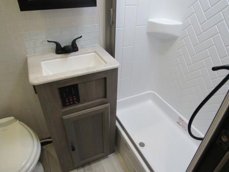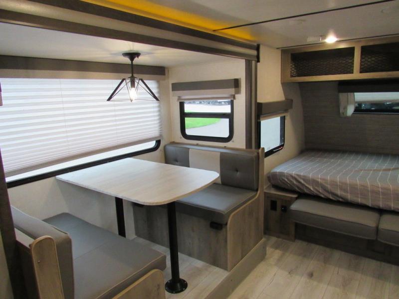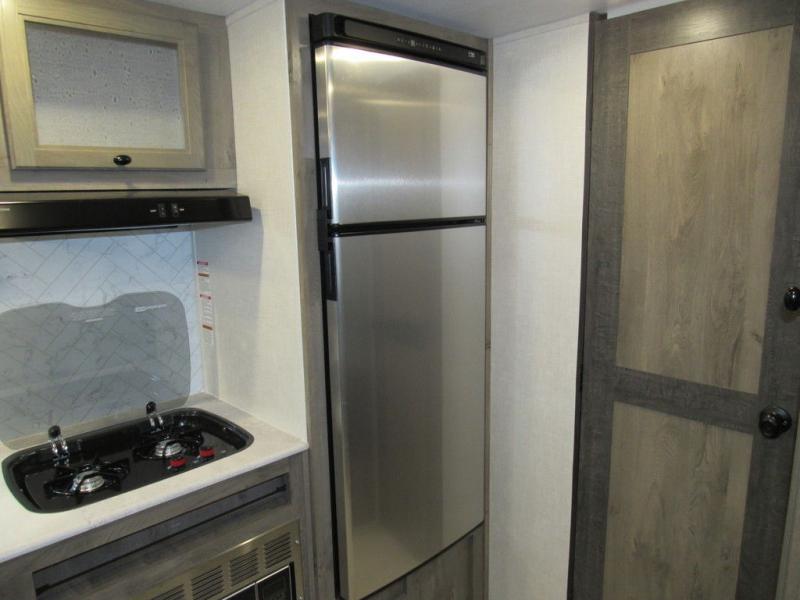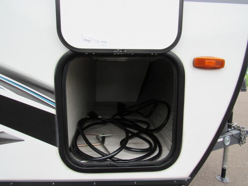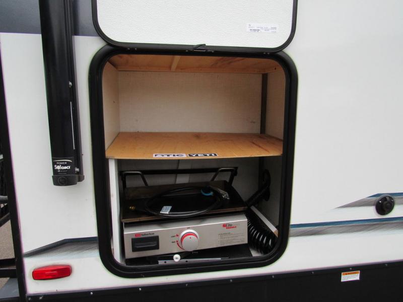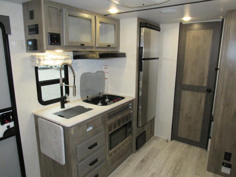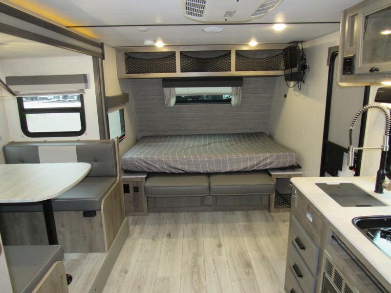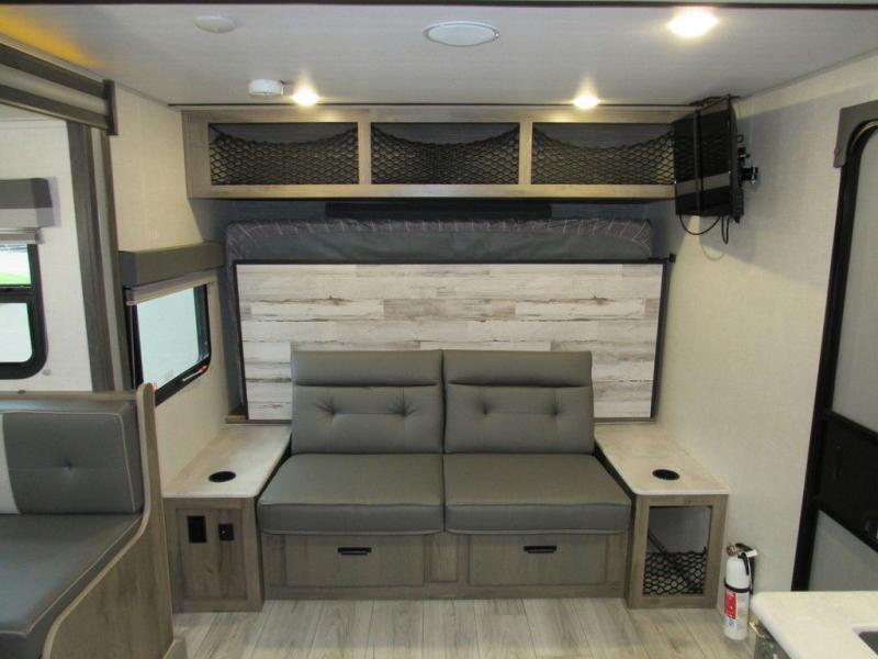 If you've been looking for a couple's trailer to take to the lake on weekend, your search is over! The versatile Murphy bed up font allows you to enjoy seating space during the day, and a comfortable bed at night, plus there are two end tables and an HD LED TV in the living area for a late-night movie. In the morning, prepare eggs and bacon on the two burner cooktop, or use the convection microwave before heading out for the day. The full rear bath is great for privacy, plus it includes a wardrobe for clean towels and toiletries!