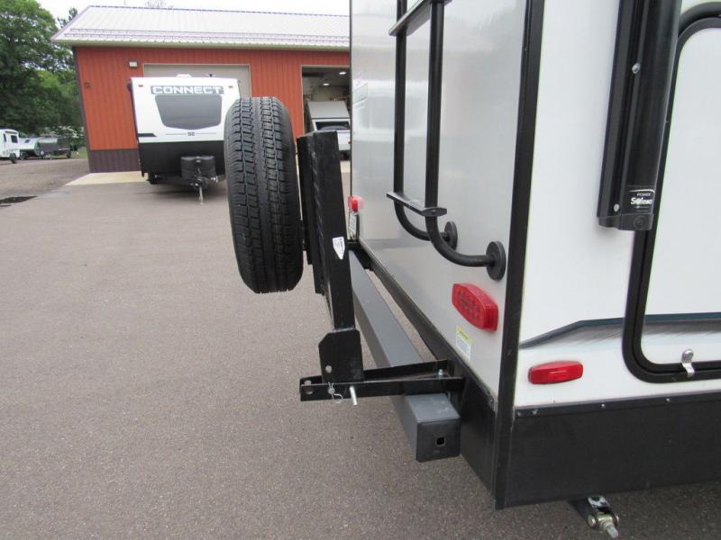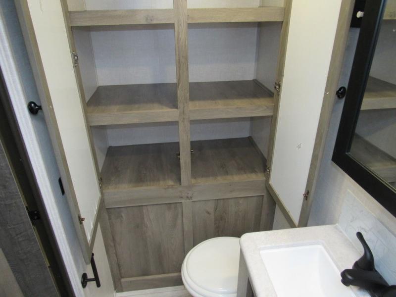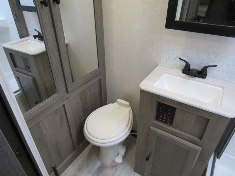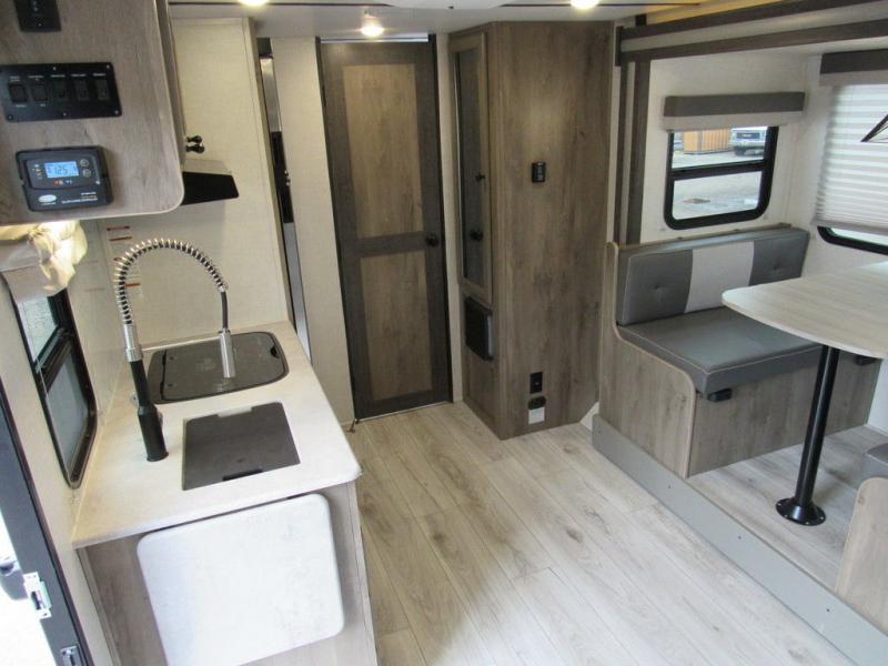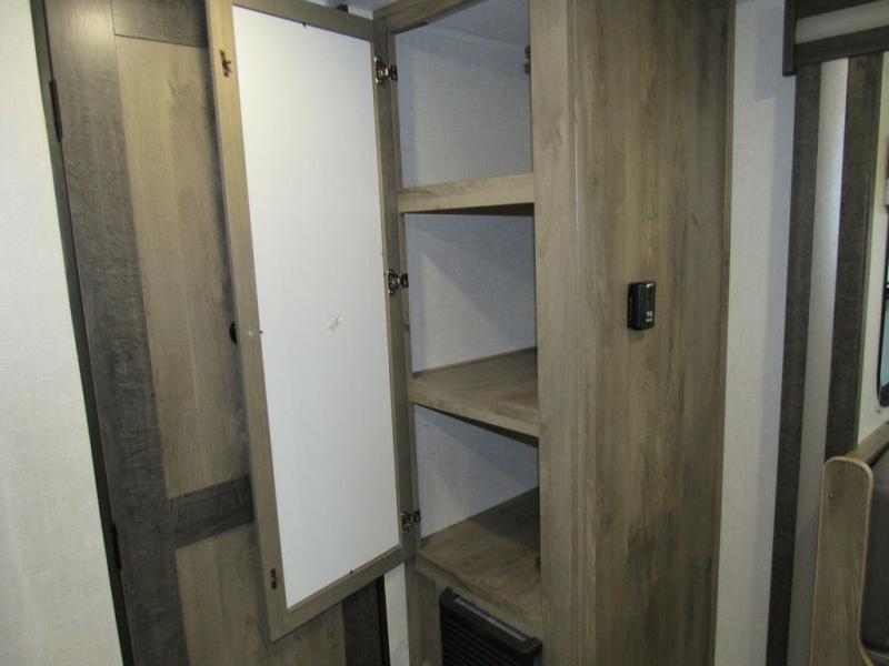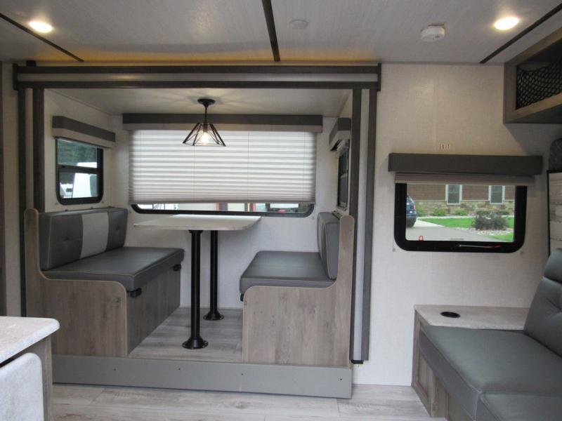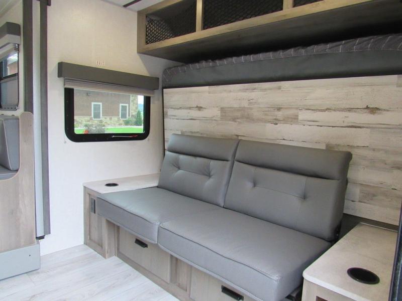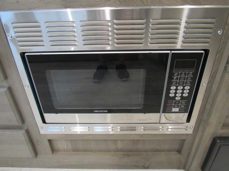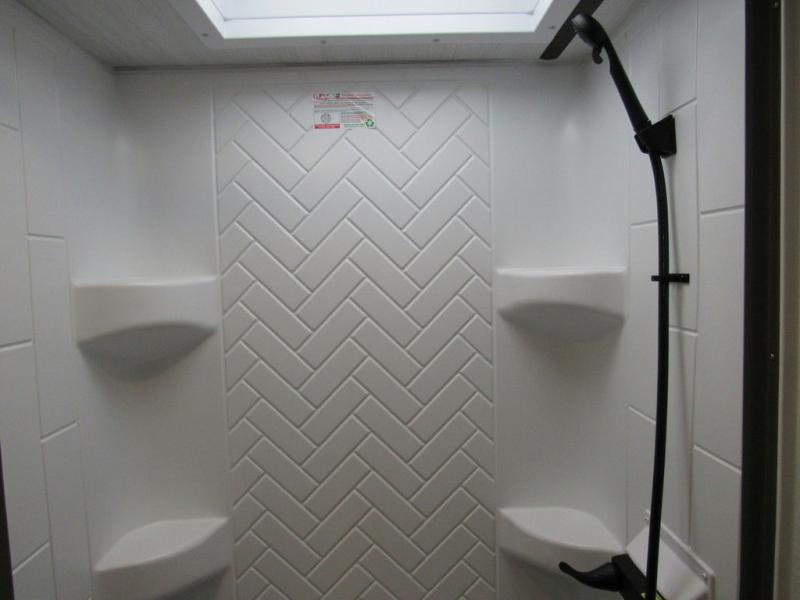 If you've been looking for a couple's trailer to take to the lake on weekend, your search is over! The versatile Murphy bed up font allows you to enjoy seating space during the day, and a comfortable bed at night, plus there are two end tables and an HD LED TV in the living area for a late-night movie. In the morning, prepare eggs and bacon on the two burner cooktop, or use the convection microwave before heading out for the day. The full rear bath is great for privacy, plus it includes a wardrobe for clean towels and toiletries!