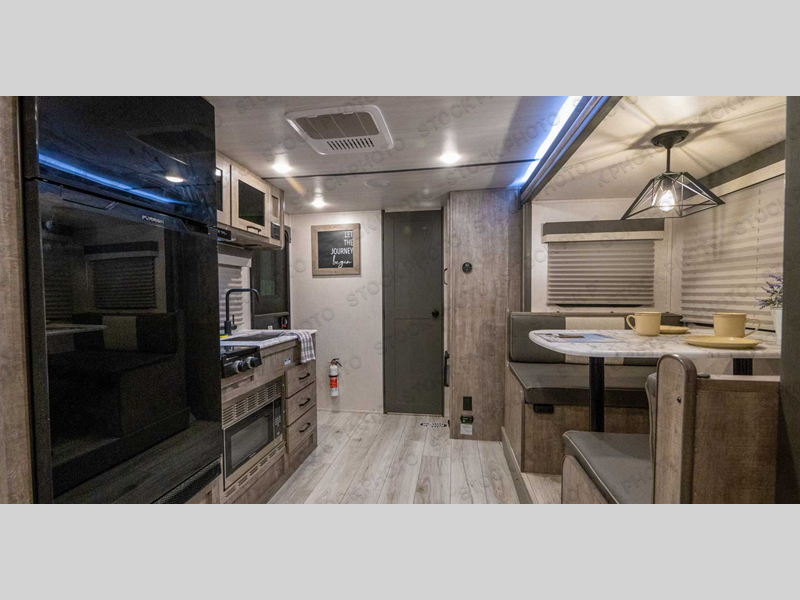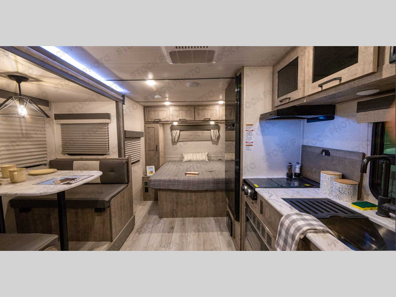 This couple's trailer resembles the layout of model 19MBLE, but with a queen-size bed up front instead of a Murphy bed. If you have an overnight guest or two little ones, they can sleep on the dinette slide, and everyone will appreciate the privacy of the full rear bath. You will have everything needed each day to prepare meals, including a two burner cooktop, a convection microwave, plus an outside kitchen. The pass-through storage will be be perfect for fishing poles, tackle boxes, or lawn chairs, plus there is additional outdoor storage for your hiking gear!