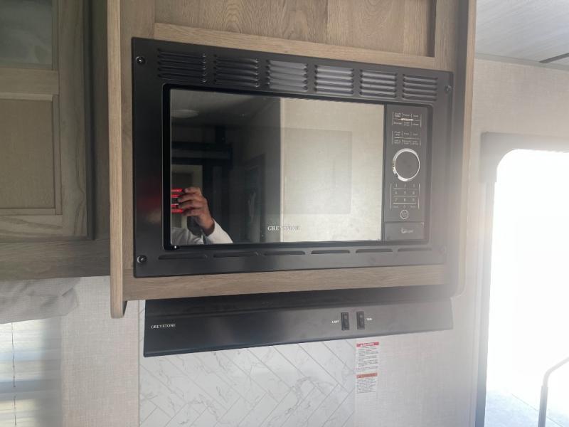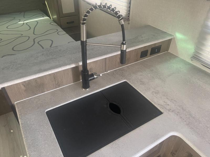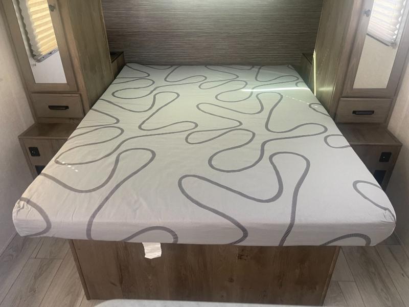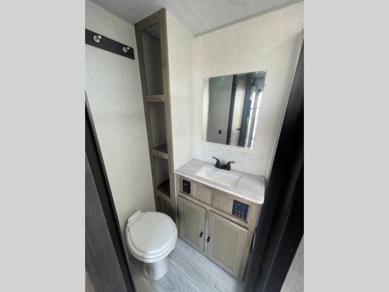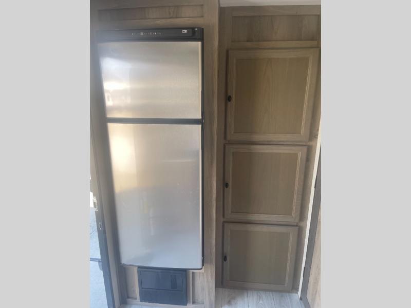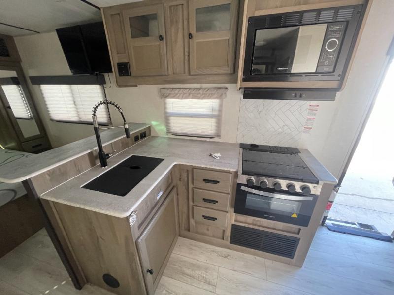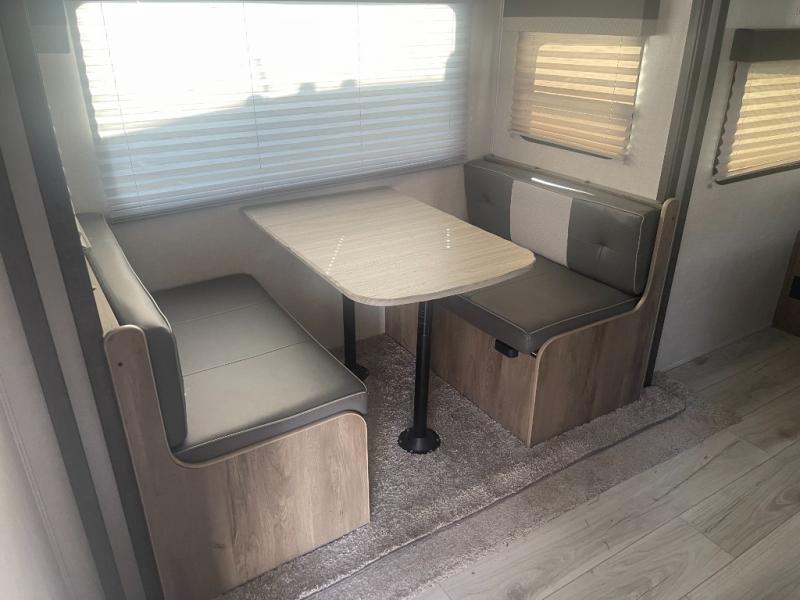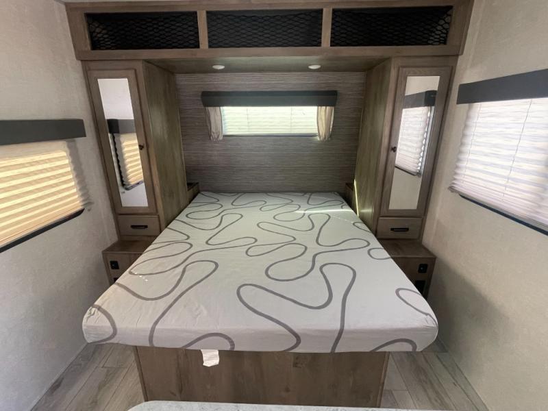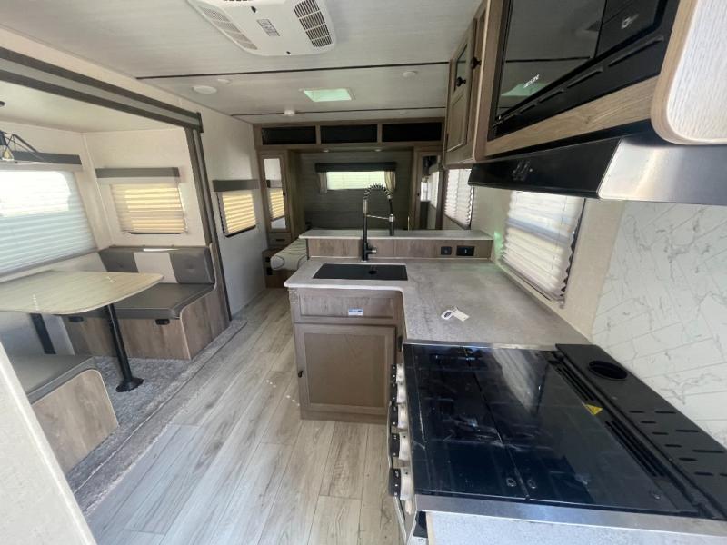 You're going to love every minute spent in this 25' travel trailer! The counter with stools will be the perfect place to enjoy your morning coffee at, plus there is a dinette slide for more seating space. You will get a great night's rest on the queen bed in the front bedroom, and the two wardrobes allow you to keep your clothes tidy. Further customize this trailer by adding the theater seating option or tri-fold sofa option in place of the dinette, and you'll enjoy the standard HD LED TV for late-night movies!